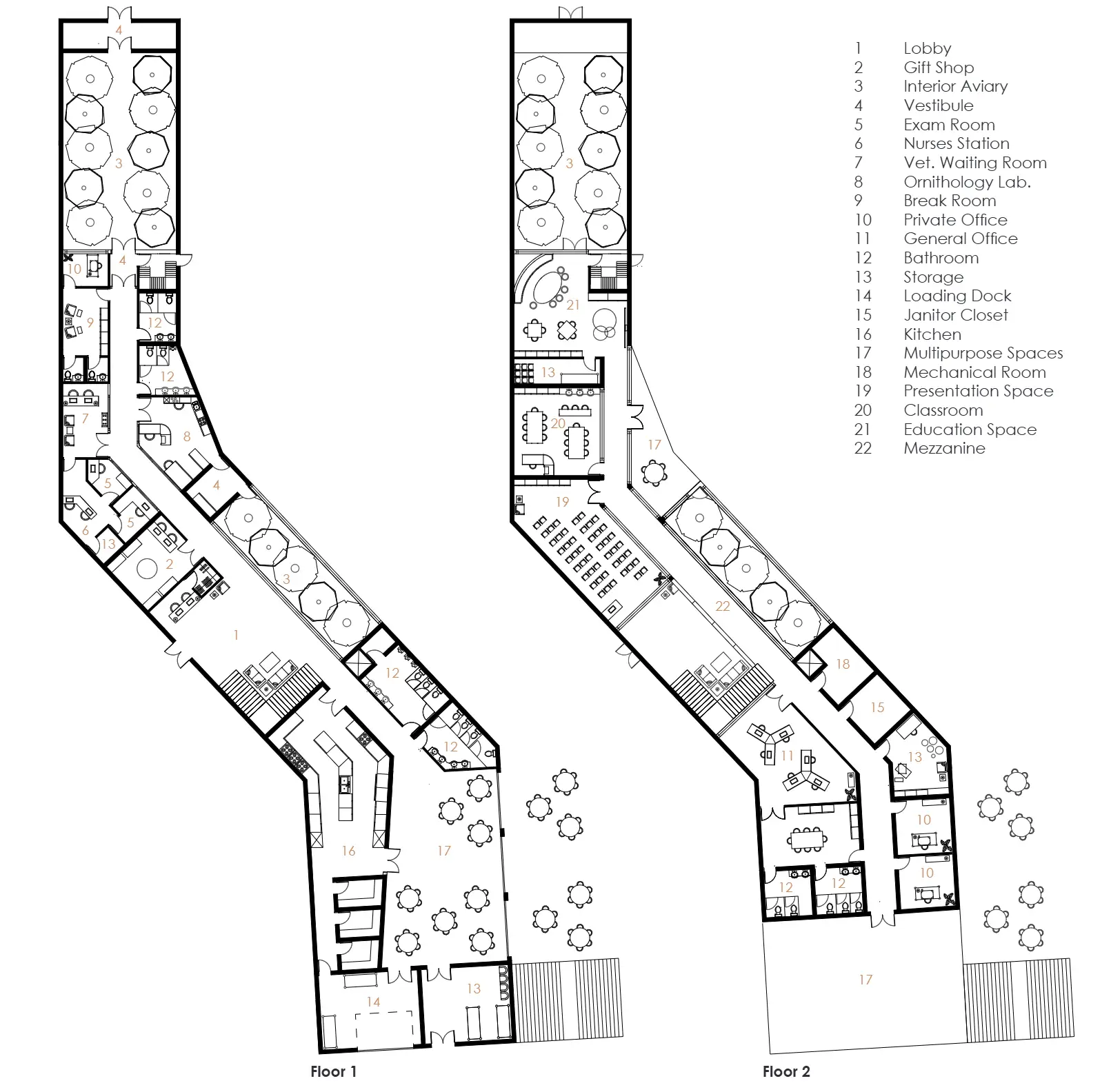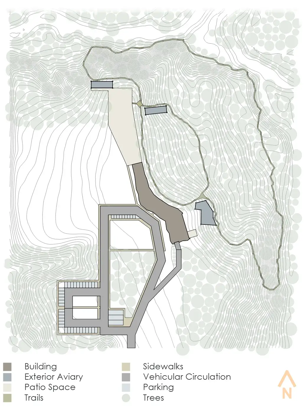 Avifauna, located in Martinsville, Indiana, is an aviary that focuses on the rehabilitation of native birds and provides education to the public on the varied species. Its elongated, nest-like form emerges from the natural landscape, integrating with the forested ravine to create an environment that fosters an immersive connection between visitors, wildlife, and the local ecosystem.