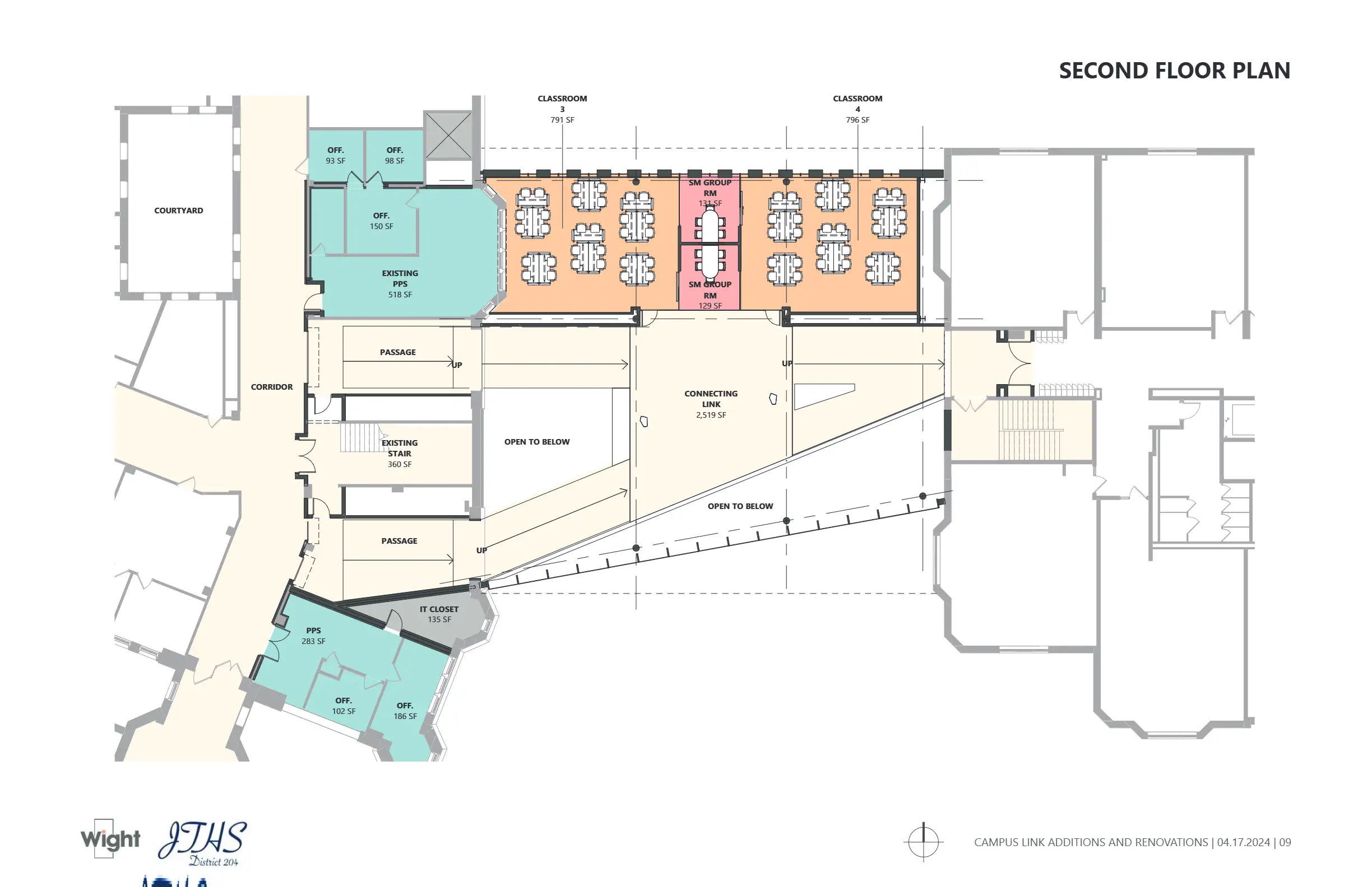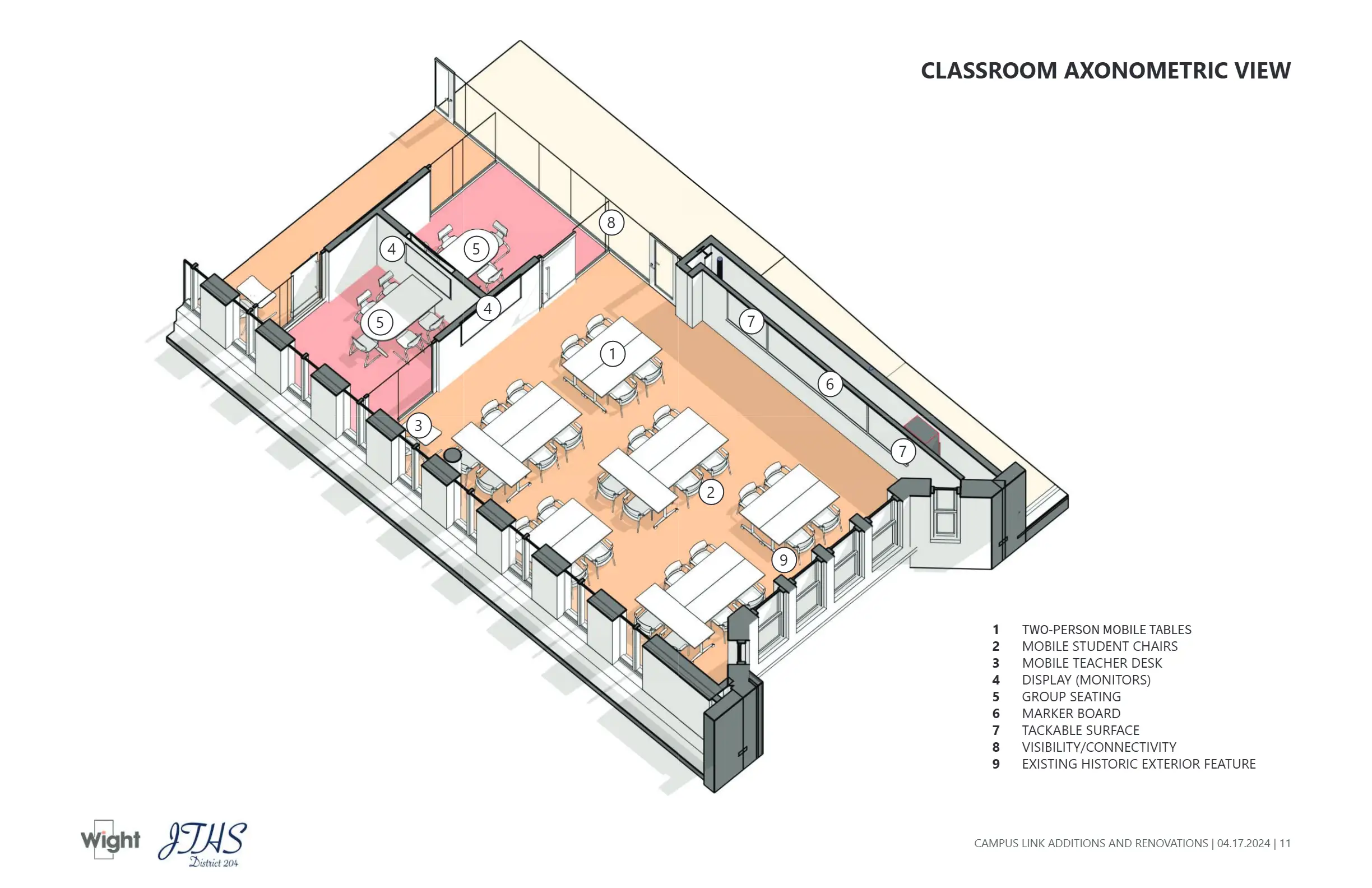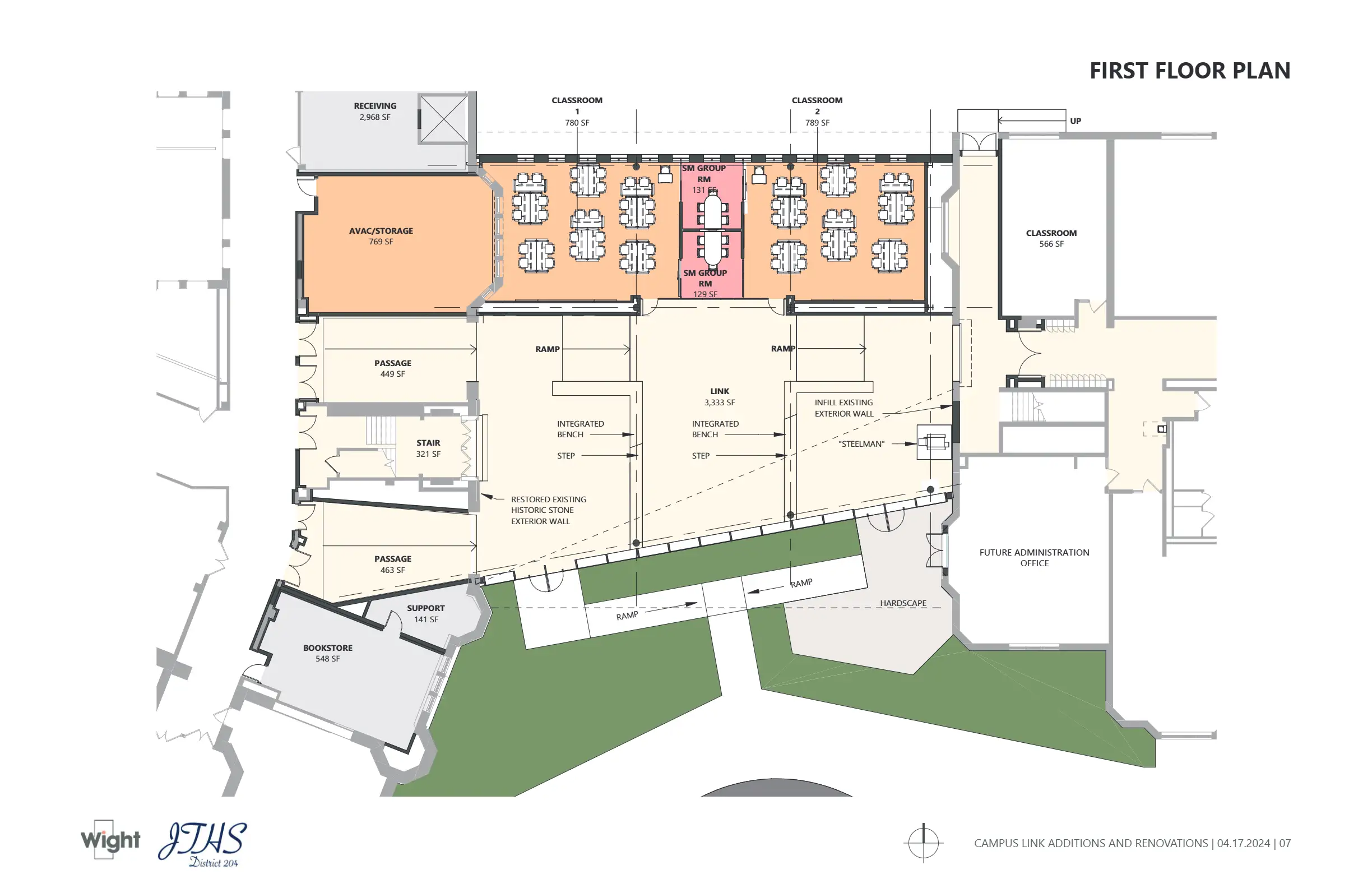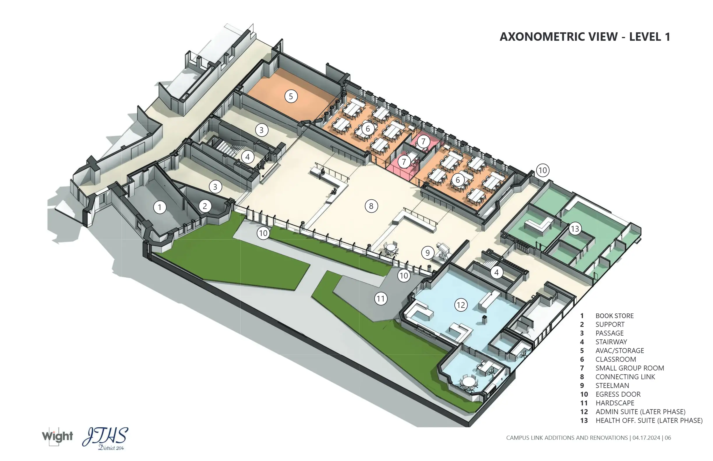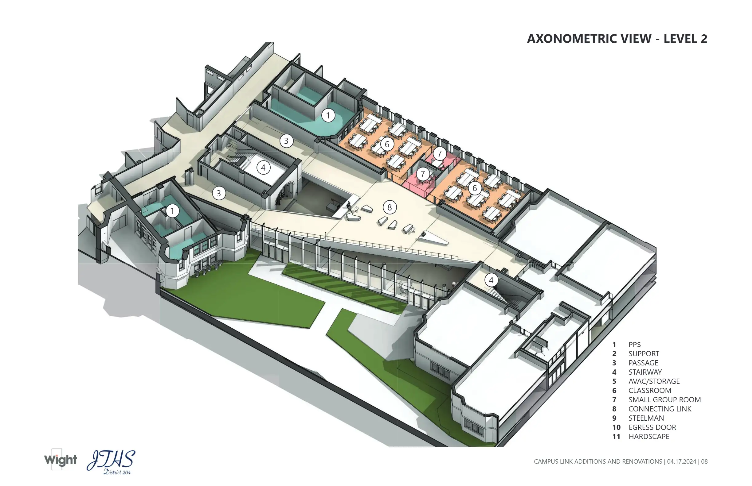 Contributed to design development and visual communication for the Joliet Central Link Addition during internship experience at Wight & Company. The project connects two primary campus buildings, emphasizing natural light, circulation, and integration with historic architecture.