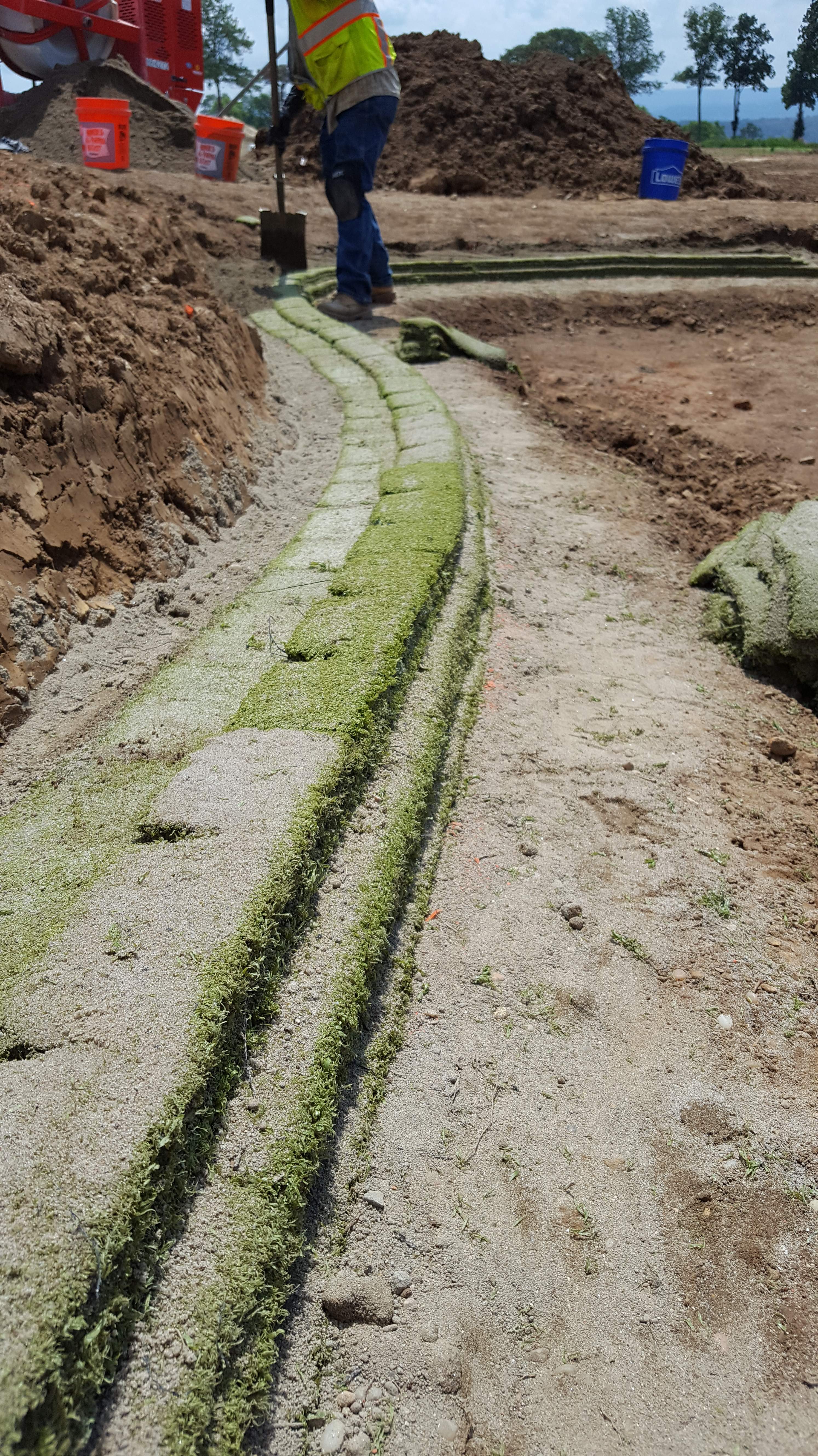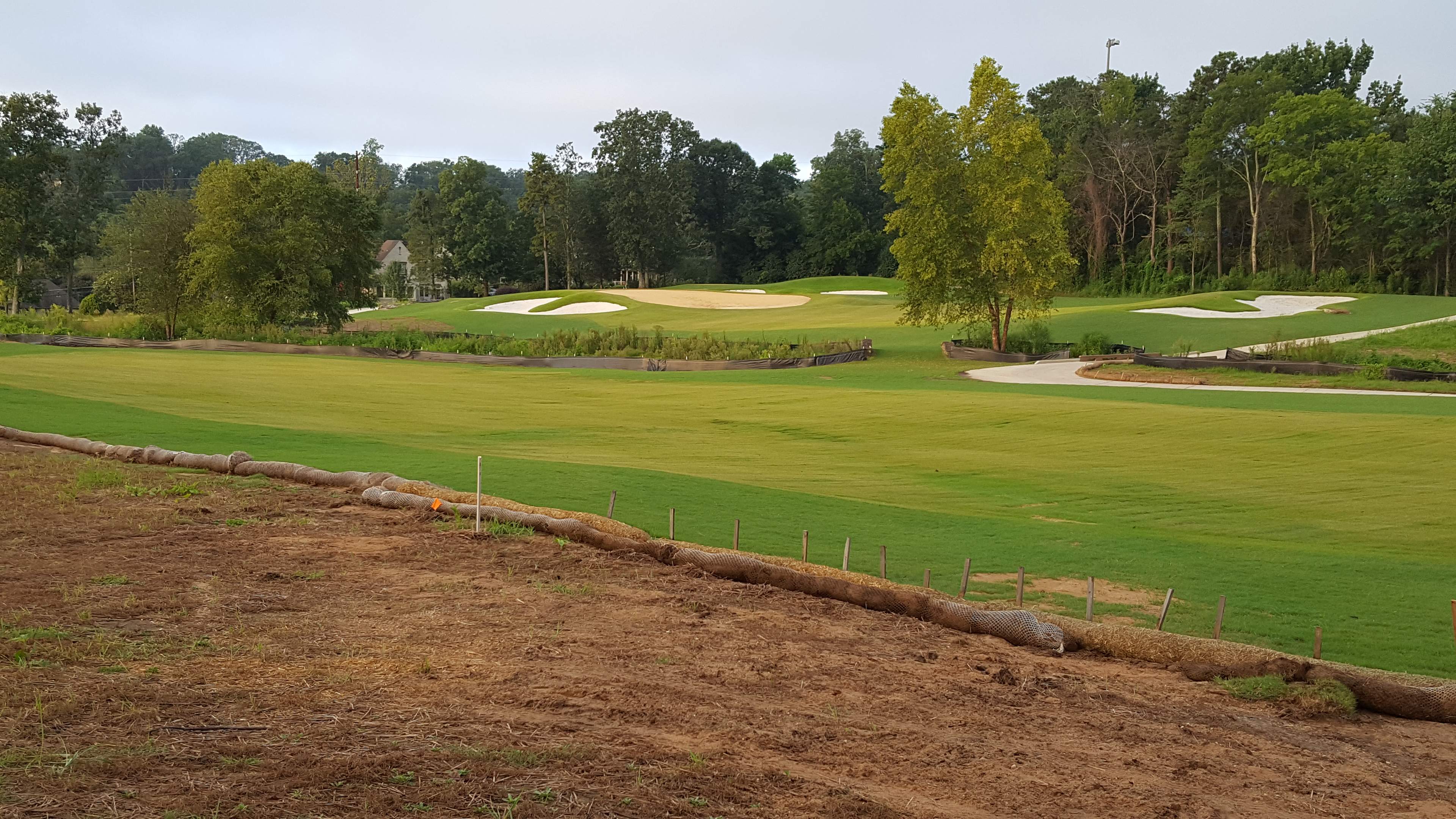 As an Assistant Superintendent, I was largely responsible for working with the architect and the machine operators to implement the architect's vision. This involved extensive clearing, grubbing and demolition, followed by topsoiling and stockpiling reusable materials. Once cleared, rough and fine grading was applied throughout the tees, fairways, bunkers, and greens to prepare the ground for irrigation and turf installation. My primary responsibility during this phase was to ensure proper layouts and elevations were achieved throughout the property via various survey techniques. In addition to shaping the ground, I was also responsible for upkeeping the erosion and sediment control BMP's on a sharply sloping property containing acres of exposed soil at any given time. Once all preceding elements were complete, turf was installed and established until opening. The process involves sequencing and staging various different activities on different parts of the property simultaneously, and was a tremendous exercise in asset management.