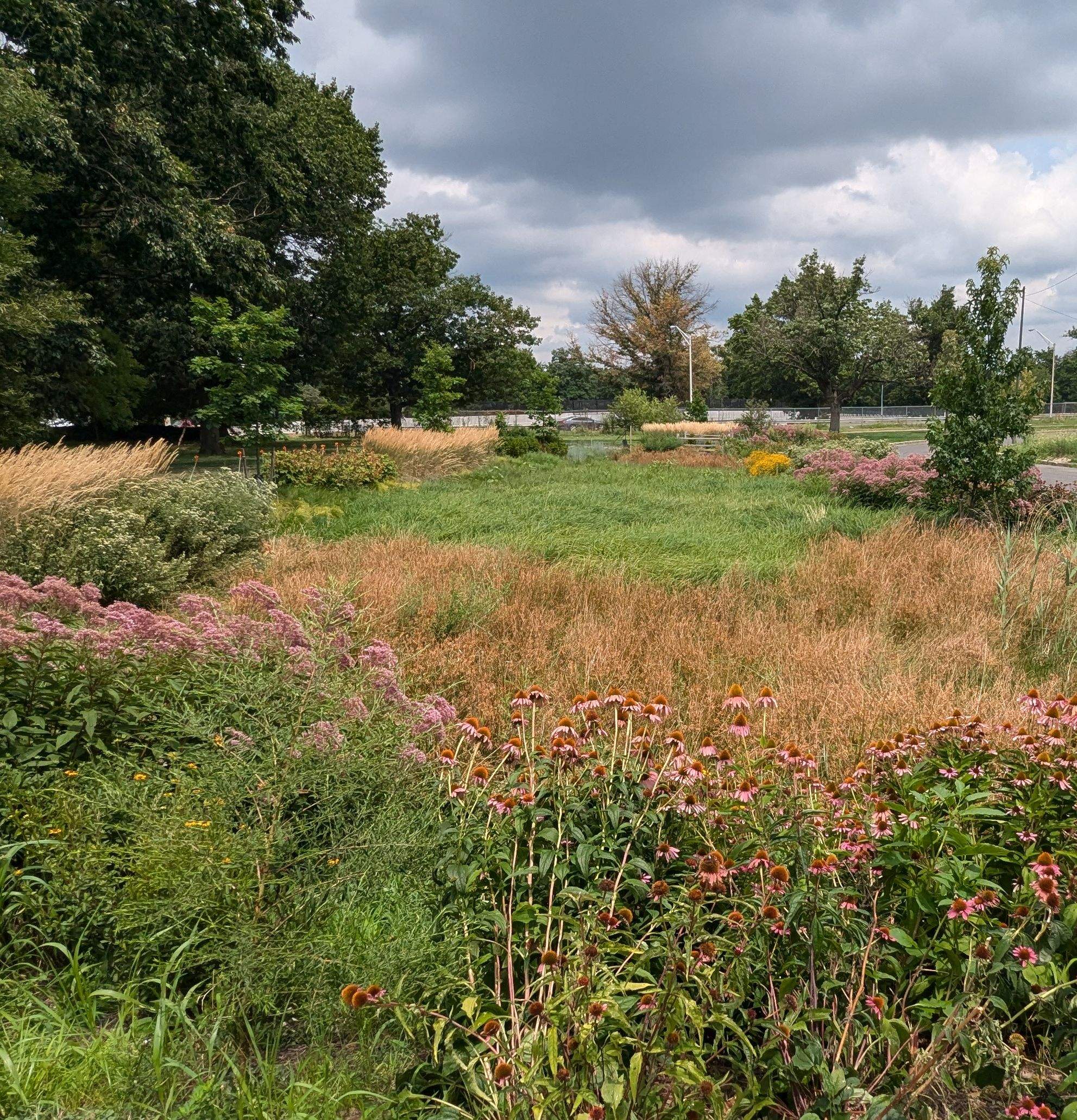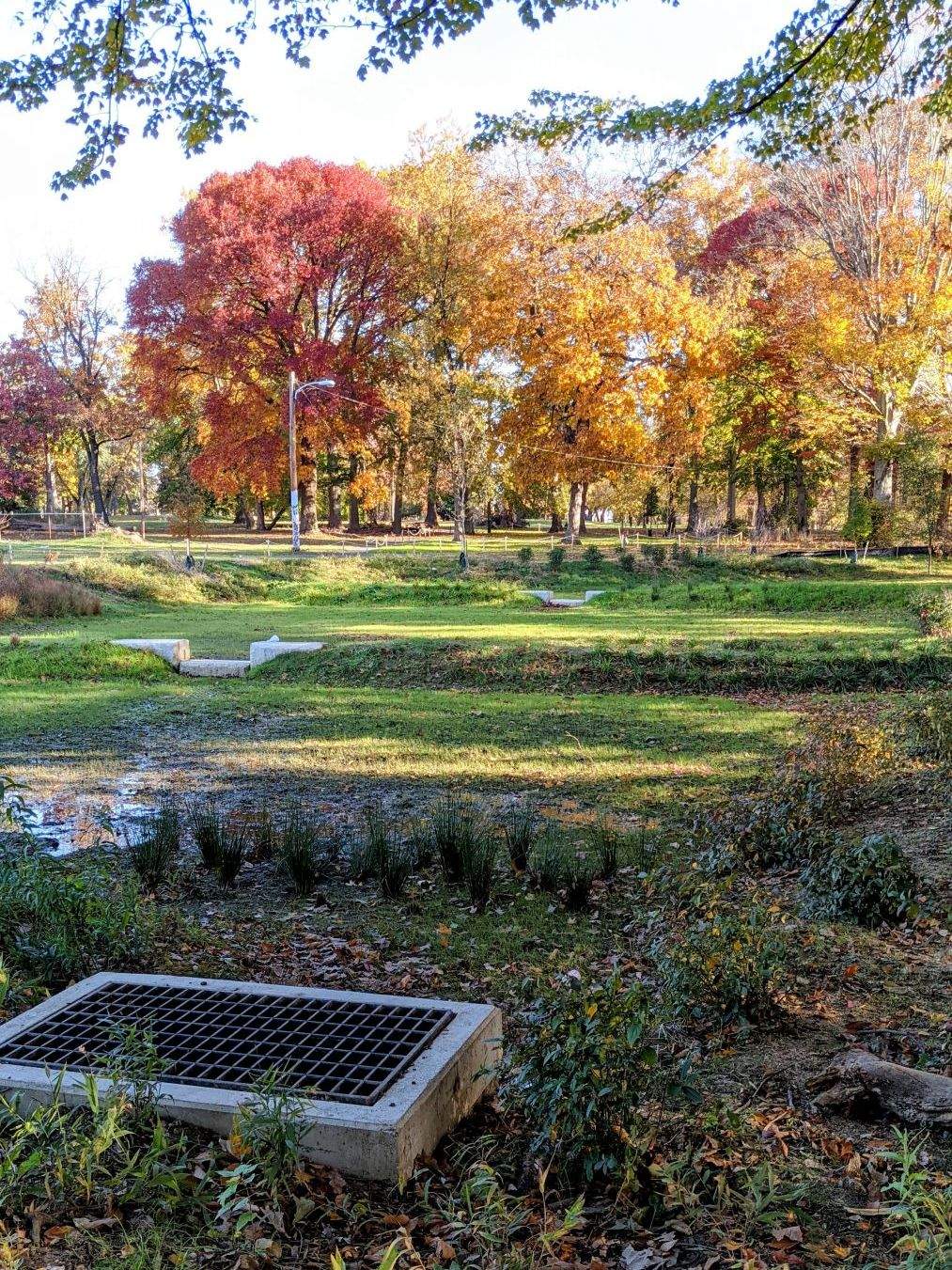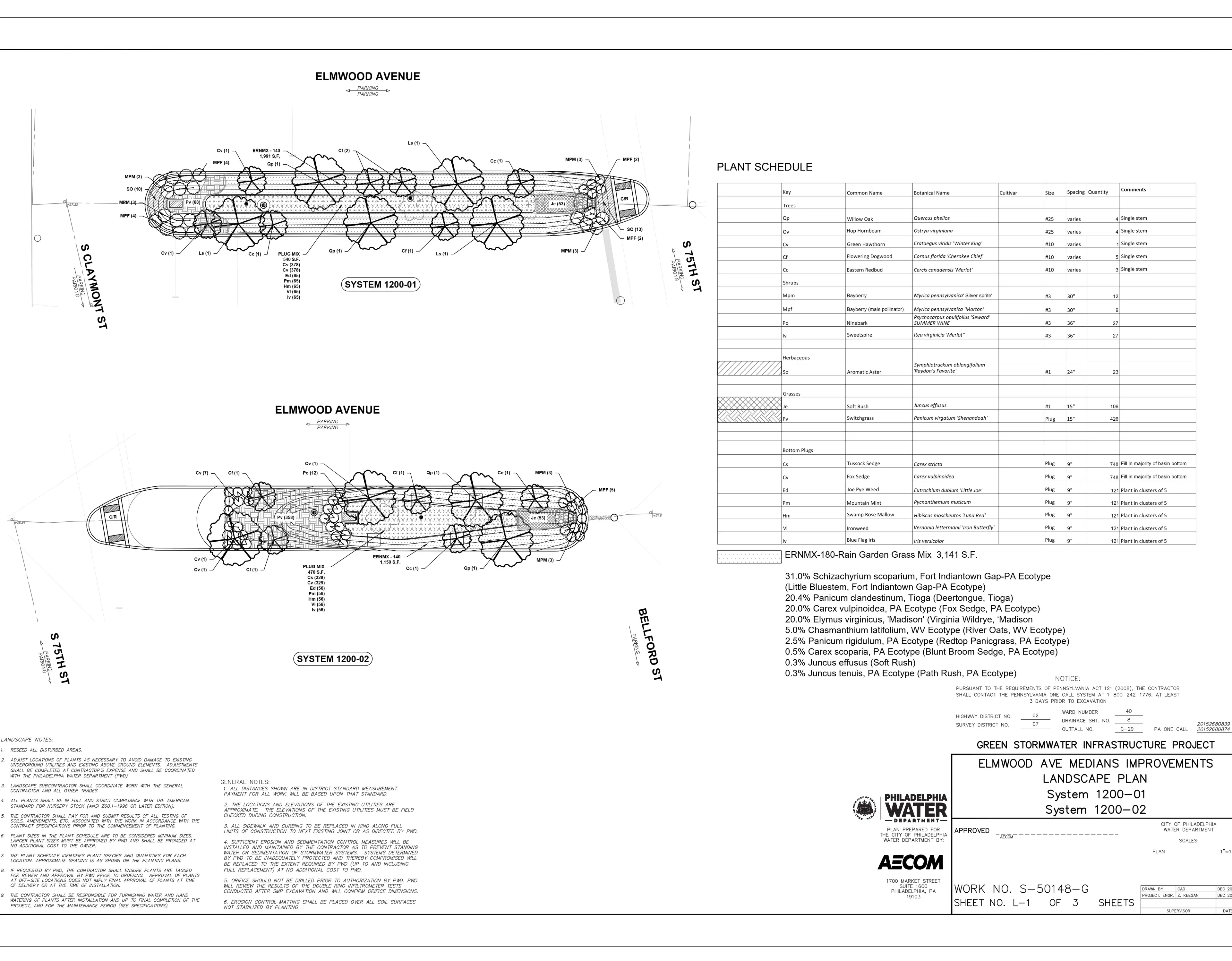 This project represents a set of fairly typical GSI medians, with a large vegetated swale suspended over a stone storage trench. Due to the size of the systems, seed and plugs were used instead of a typical container planting that PWD more frequently utilizes. The swales were designed with biodiversity and resiliency at the forefront, due the the variability of extreme wetness and extreme drought depending on the elevation of a given point in the system.