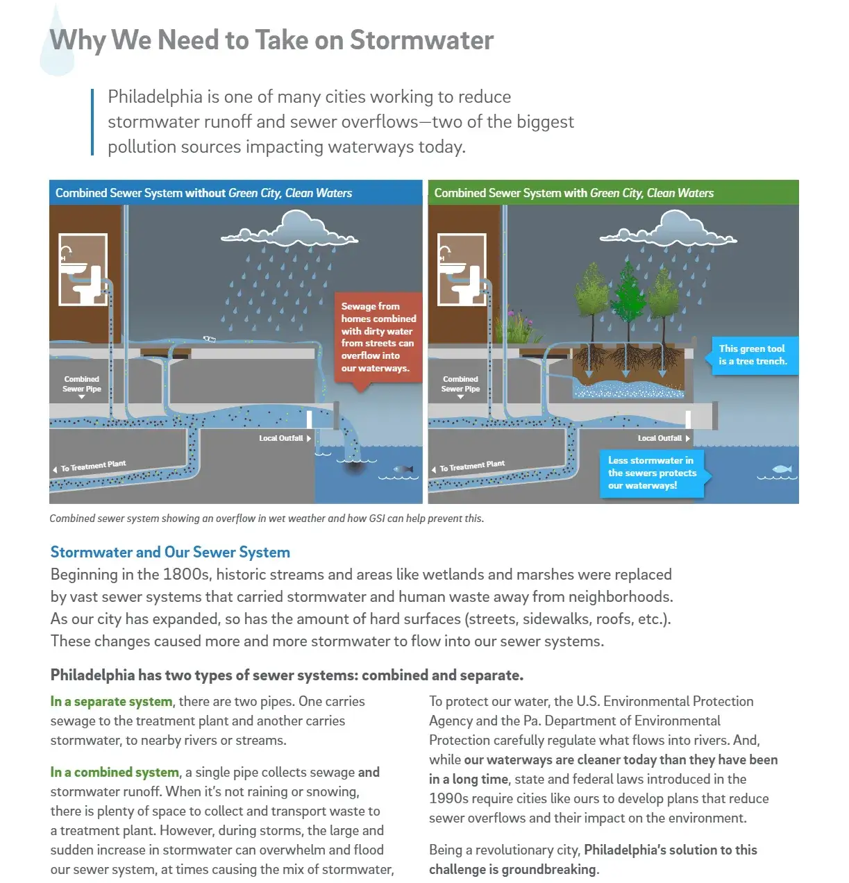 The Philadelphia Water Department's Green City Clean Water's program is a 25 year mission to reduce the amount of harmful combined sewer overflow events into the city's water ways. It is the most robust Green Infrastructure program of it's kind, providing more residential benefits than the typical gray water infrastructure. In addition to intercepting water from reaching Philadelphia's aging sewers, our work attacks the Urban Heat Island by planting more trees with capital dollars than any other city entity. Furthermore, our work contributes to placemaking in neighborhoods around the city, and creates jobs to design and maintain each projects, rounding out the "triple bottom line" benefits of GSI.