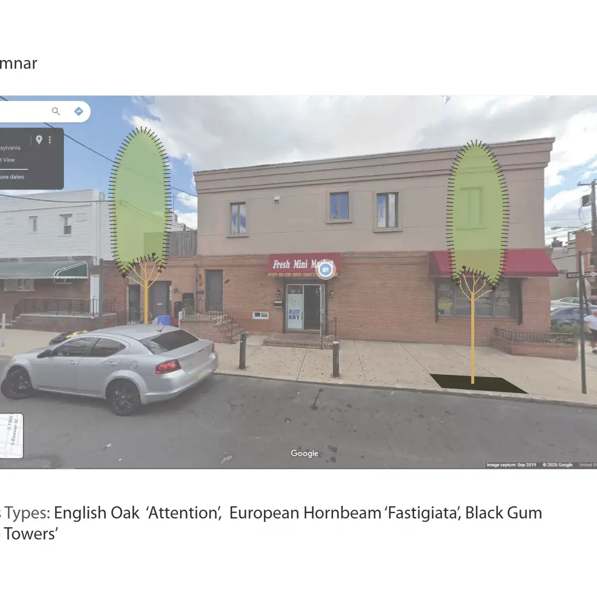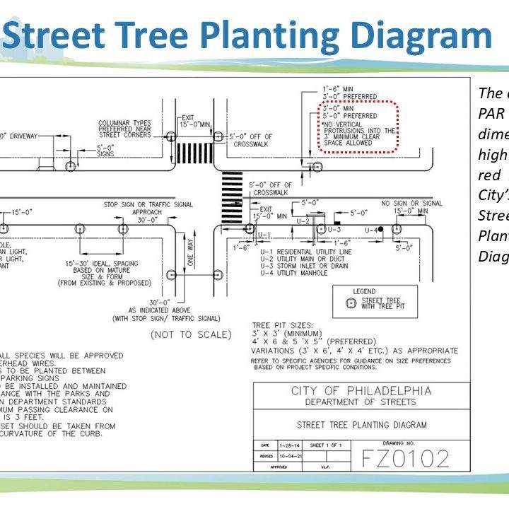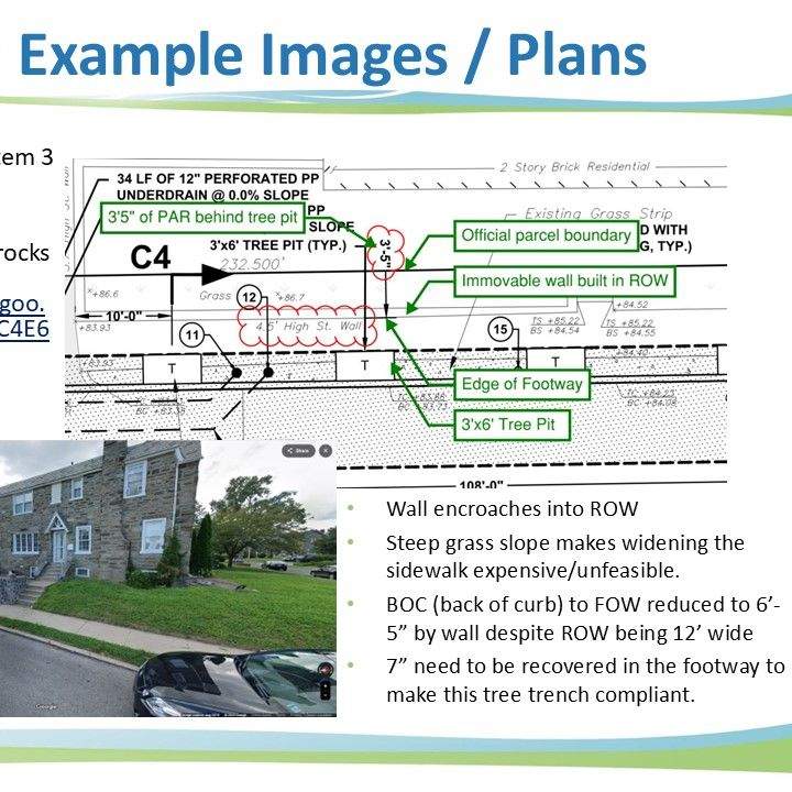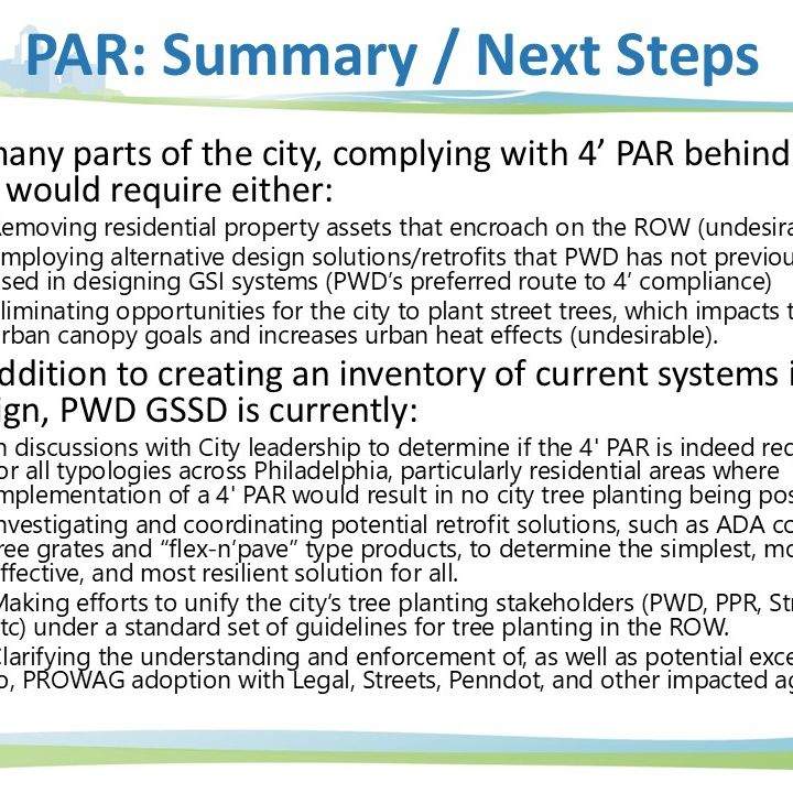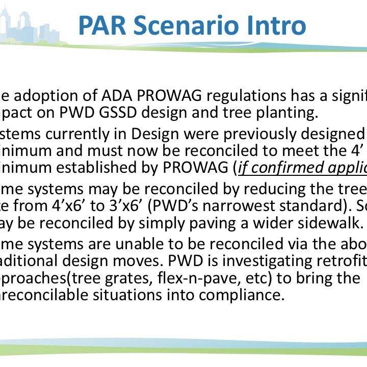 Due to Philadelphia's narrow footways and odd parcel arrangement, it can be difficult to achieve ADA compliance in the right of way when designing street trees. It became more difficult with the adoption of PROWAG, which widened the access route within the right-of-way from 3' to 4'. In response, myself and my staff investigated the number of systems and trees effected in our design pipeline, then worked with the design engineers to craft a solution. With a complicated contract structure that separates landscaping from general construction, as well as public procurement constraints, this was a much more convoluted task than it may seem on the surface, requiring coordination with planners and engineers form several city and state agencies. The below slides were developed as a primer for dialogue with other city and state agencies that are not as familiar with the unique circumstances of PWD's GSI Design.
