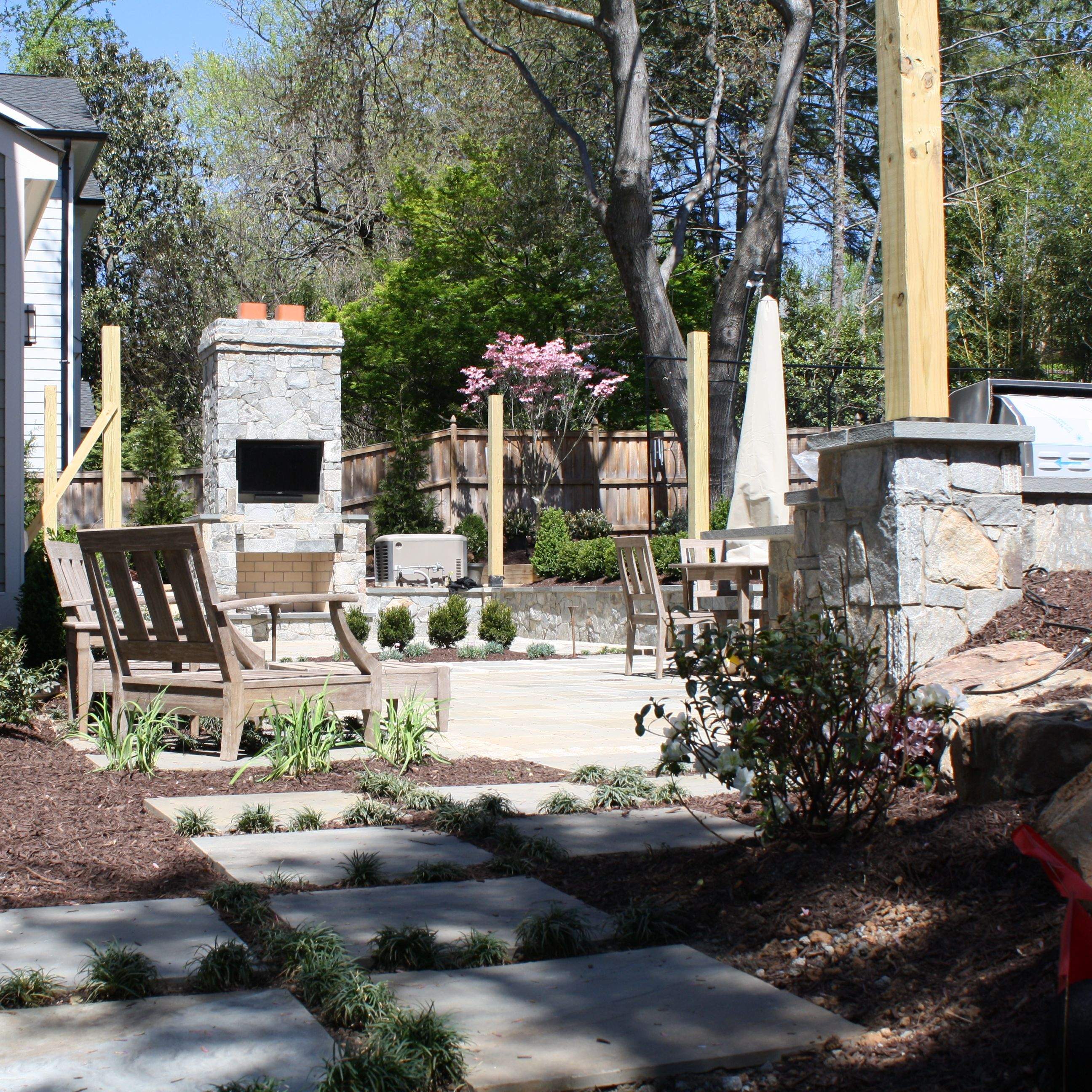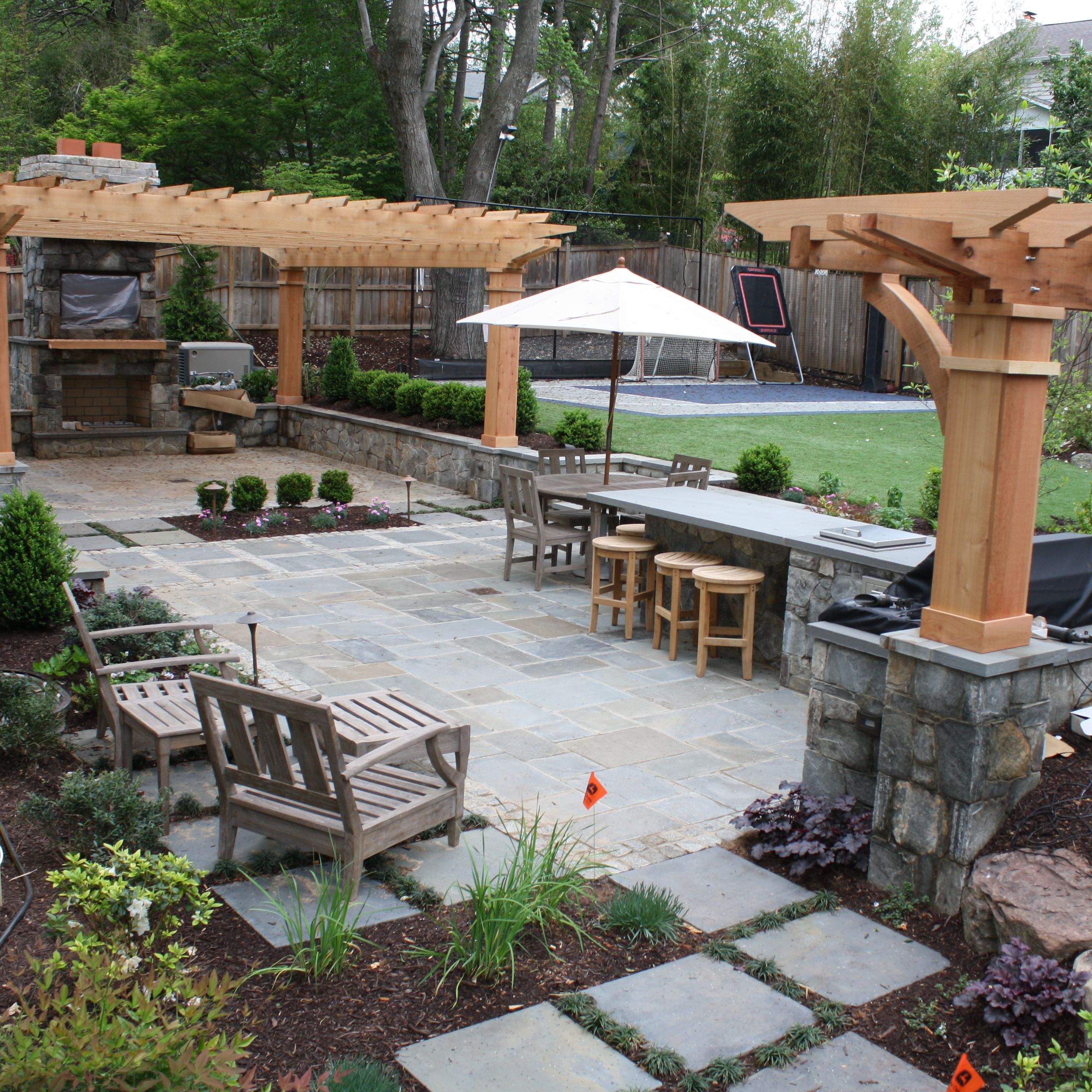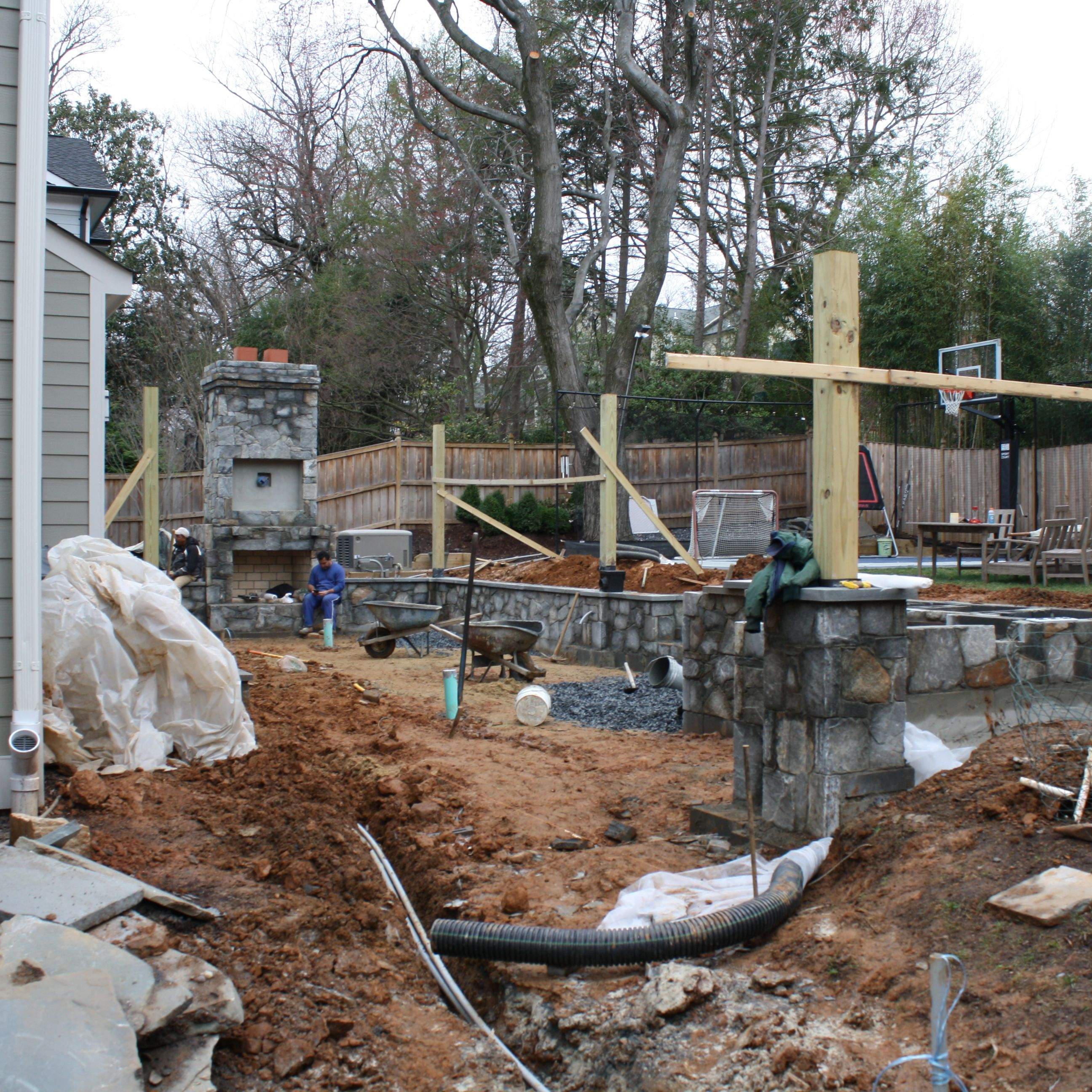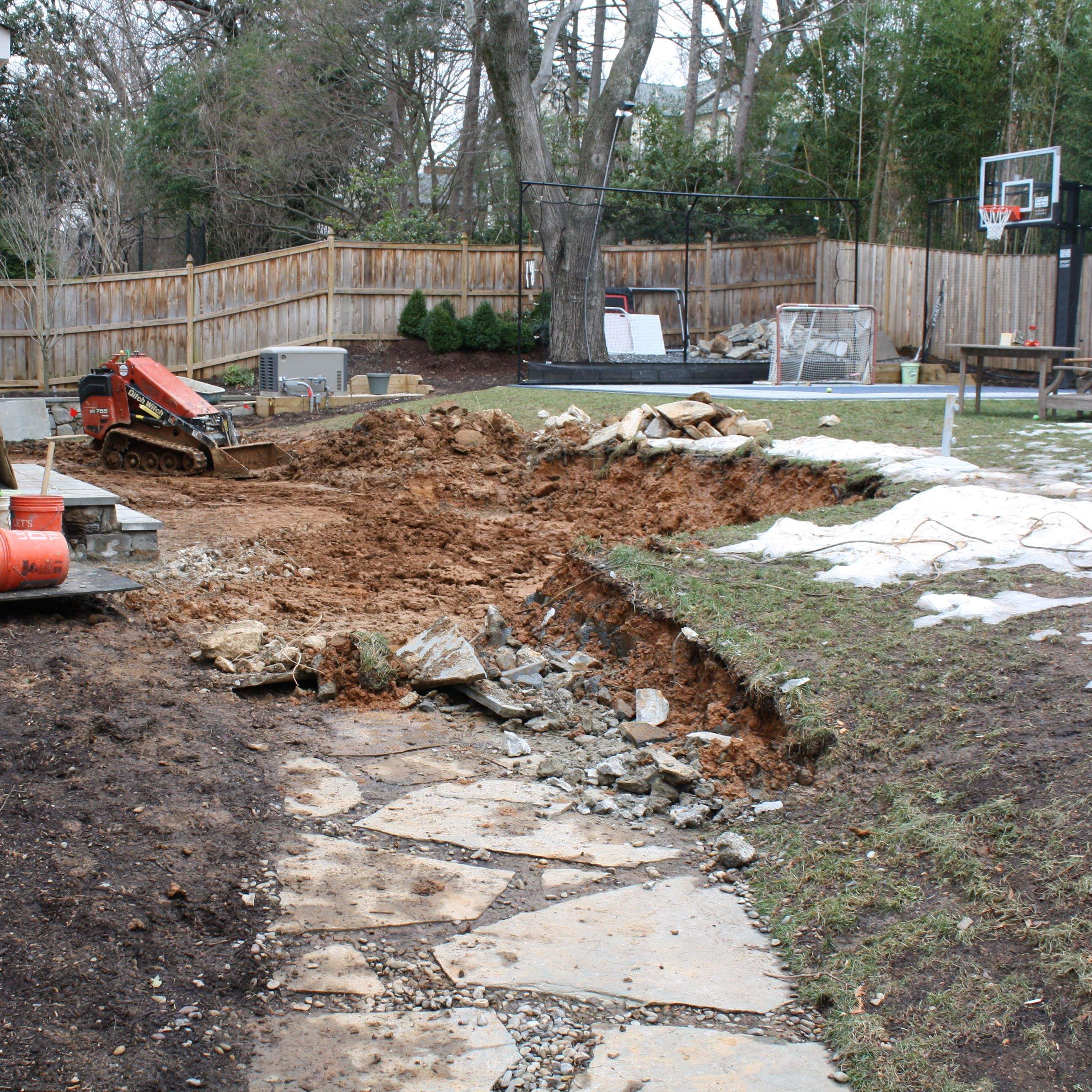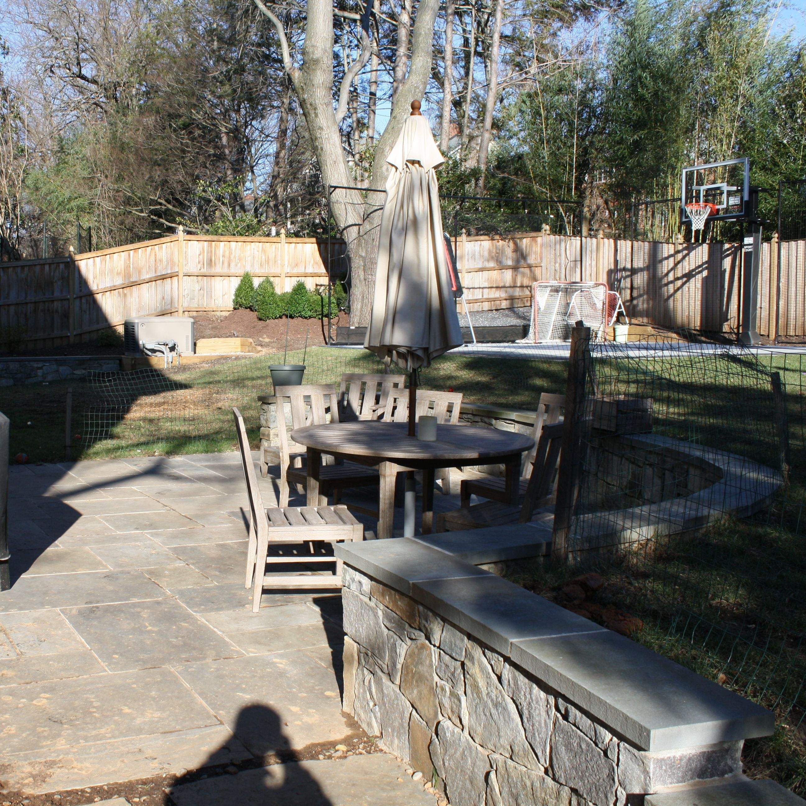 The below pictures show the demolition, construction, and finished product of a residential backyard in Bethesda MD. The client initially approached me looking for a way to flatten out their turf area next to the ball court. I explained that in order to do so, a retaining wall would be needed. From a sales perspective, the wall became a bridge to redesigning the entire backyard to create two tiers of spaces for the wishes of the entire family. Design, construction and landscape installation was all conducted in-house.