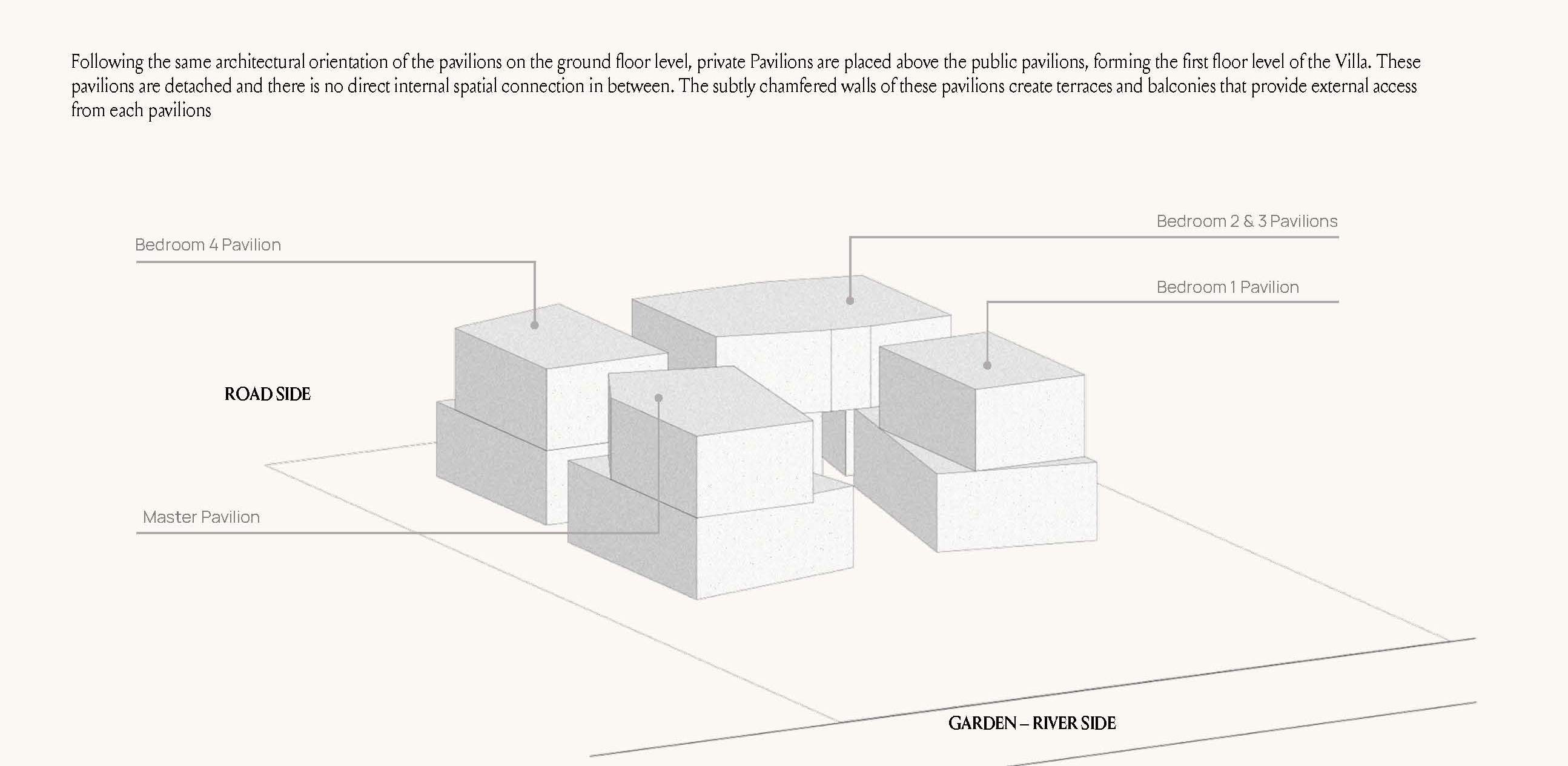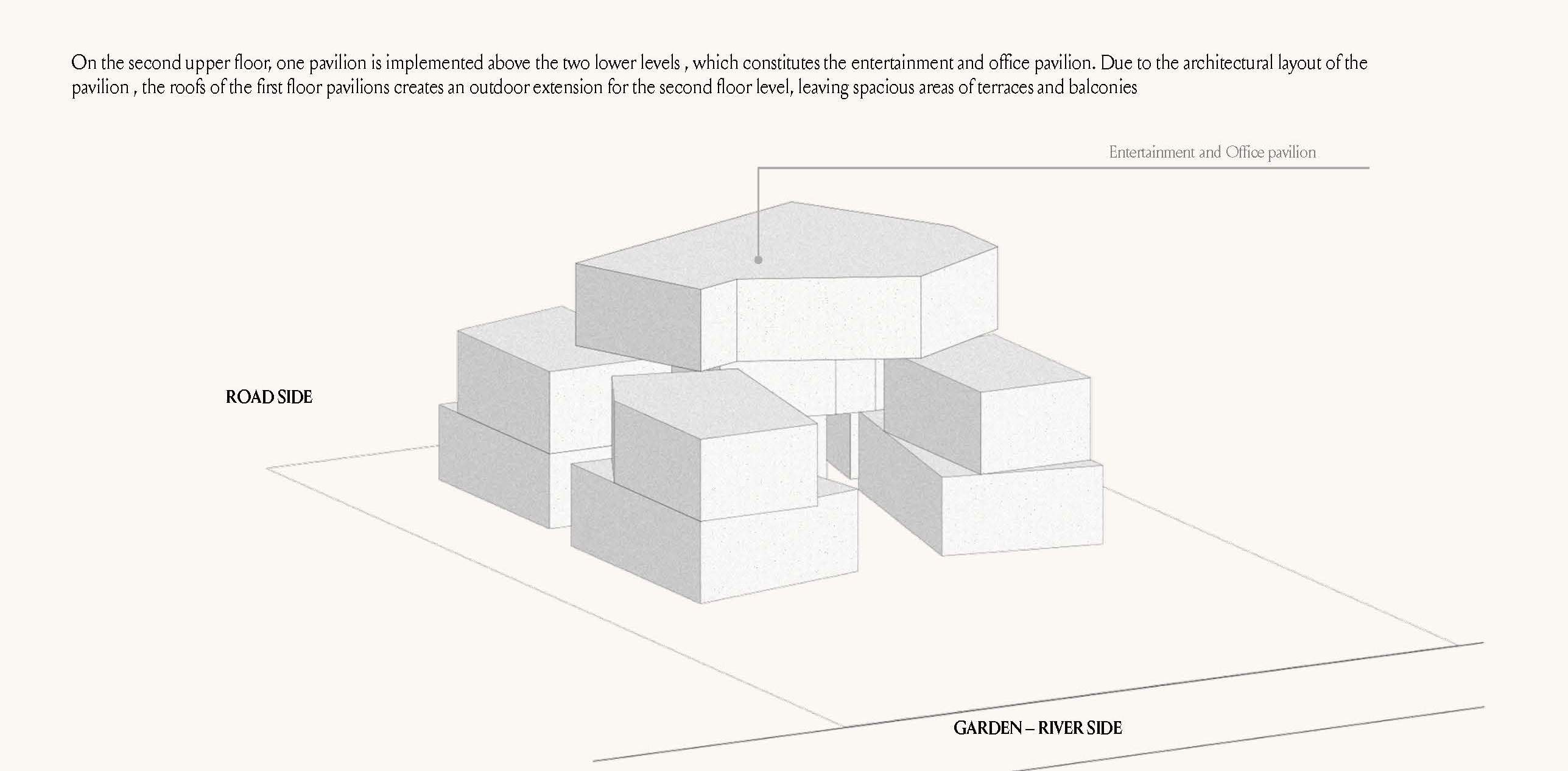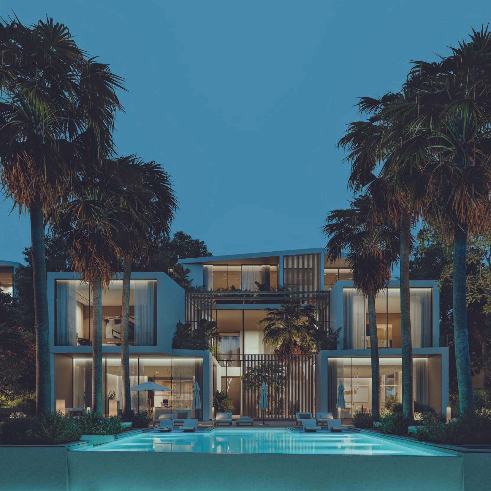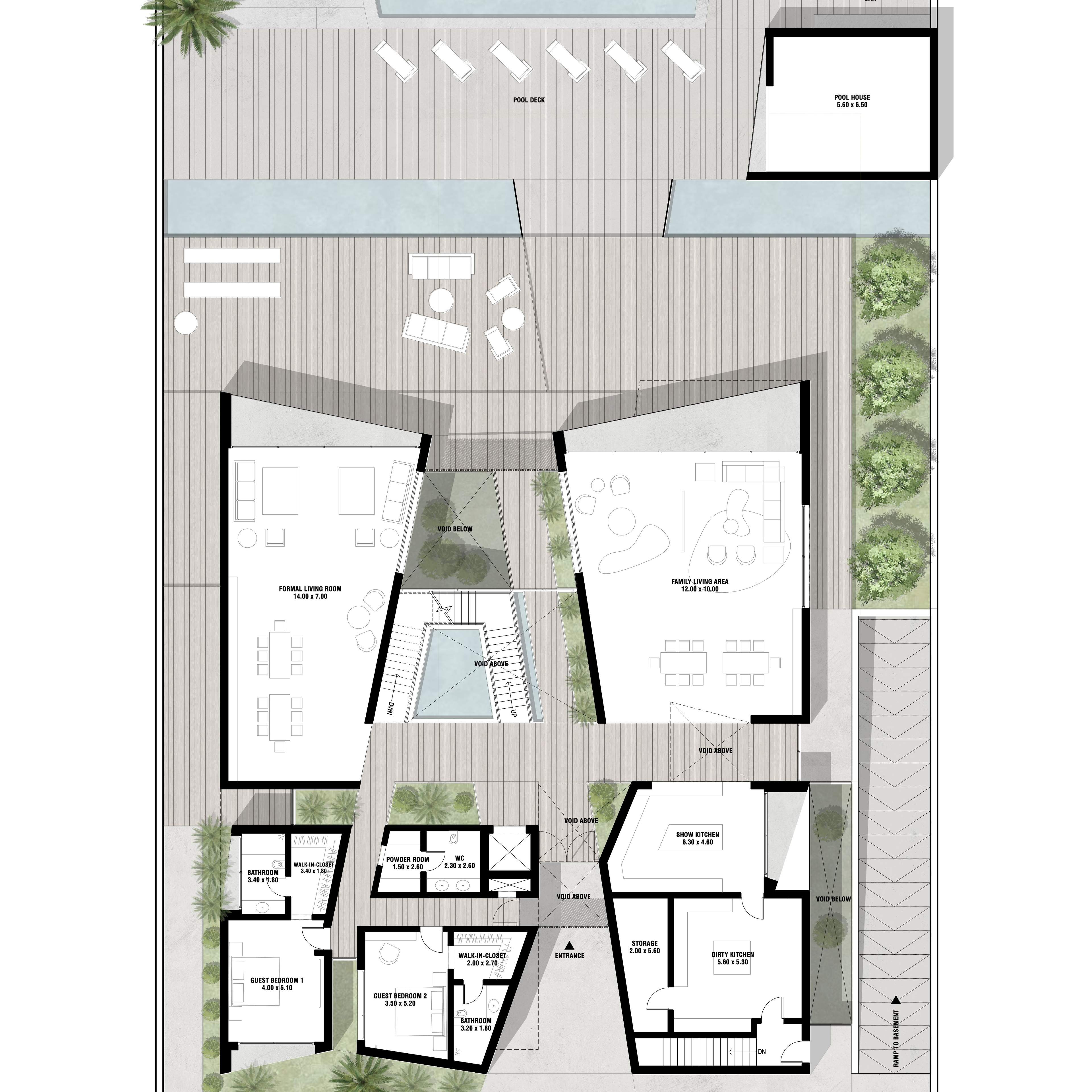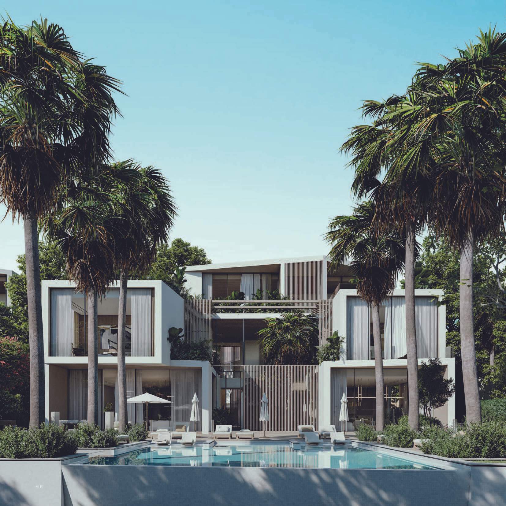 Altissima is an upscale residential complex in Al Barari, Dubai, featuring a series of carefully designed villas on distinct plots. The architecture is defined by a U-shaped pavilion layout on the ground floor, opening to a scenic backyard and housing public living areas, guest suites, and a circulation core. The first floor mirrors this arrangement with private pavilions above, featuring terraces and balconies. The second floor hosts an entertainment and office pavilion, utilizing the first-floor roofs as outdoor spaces.