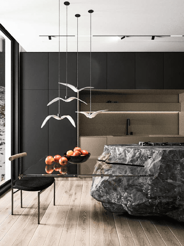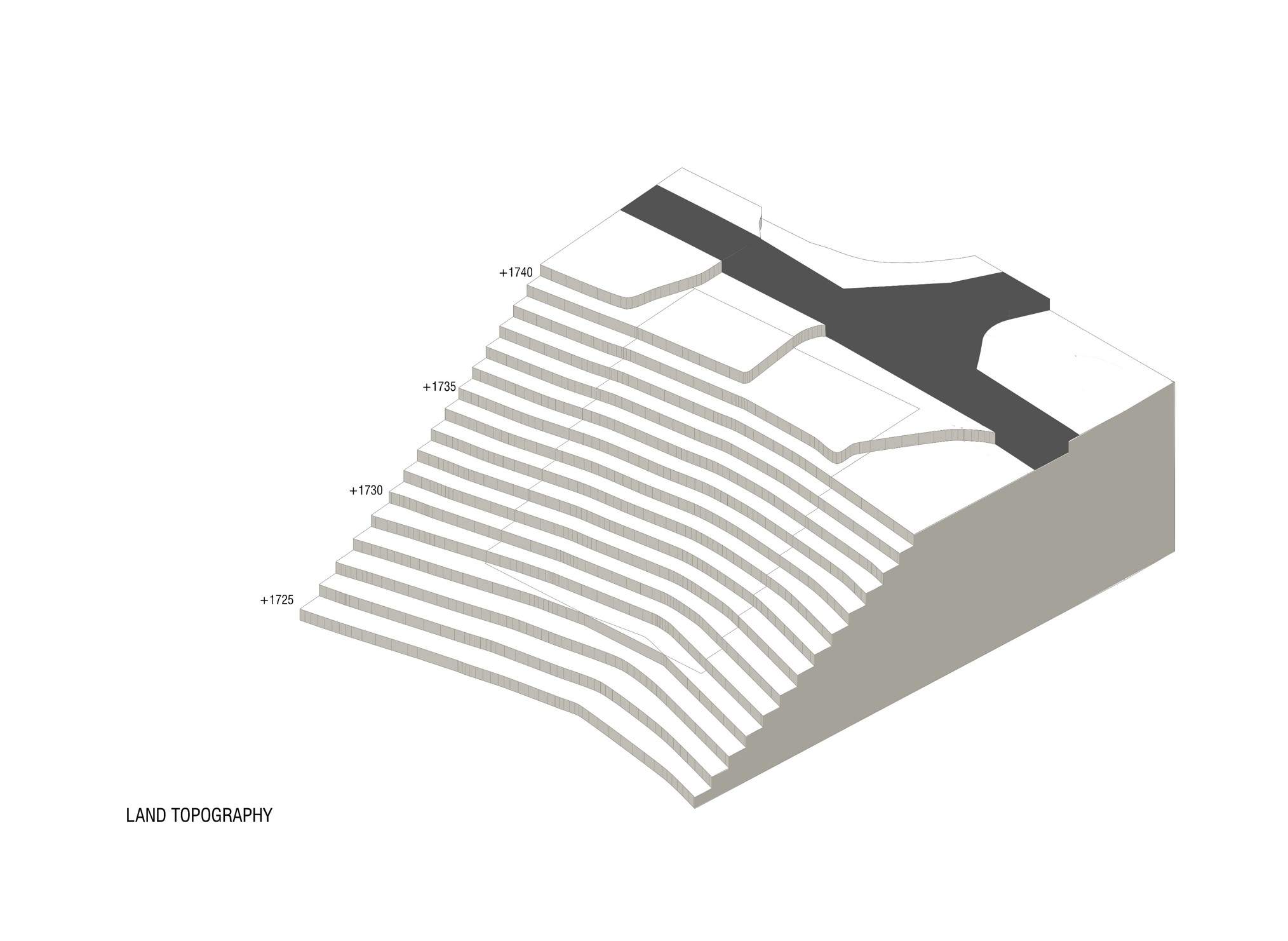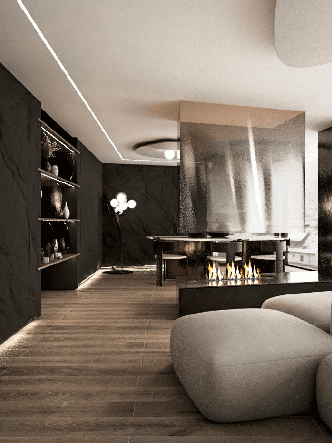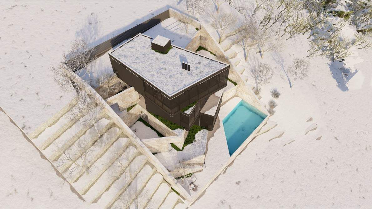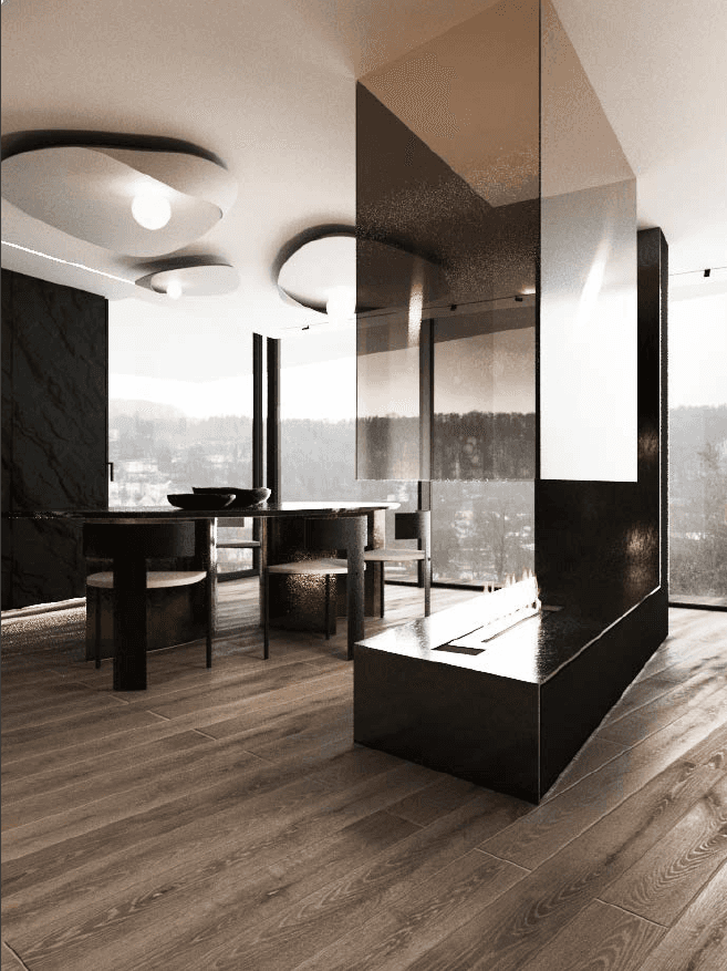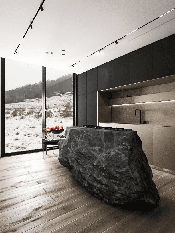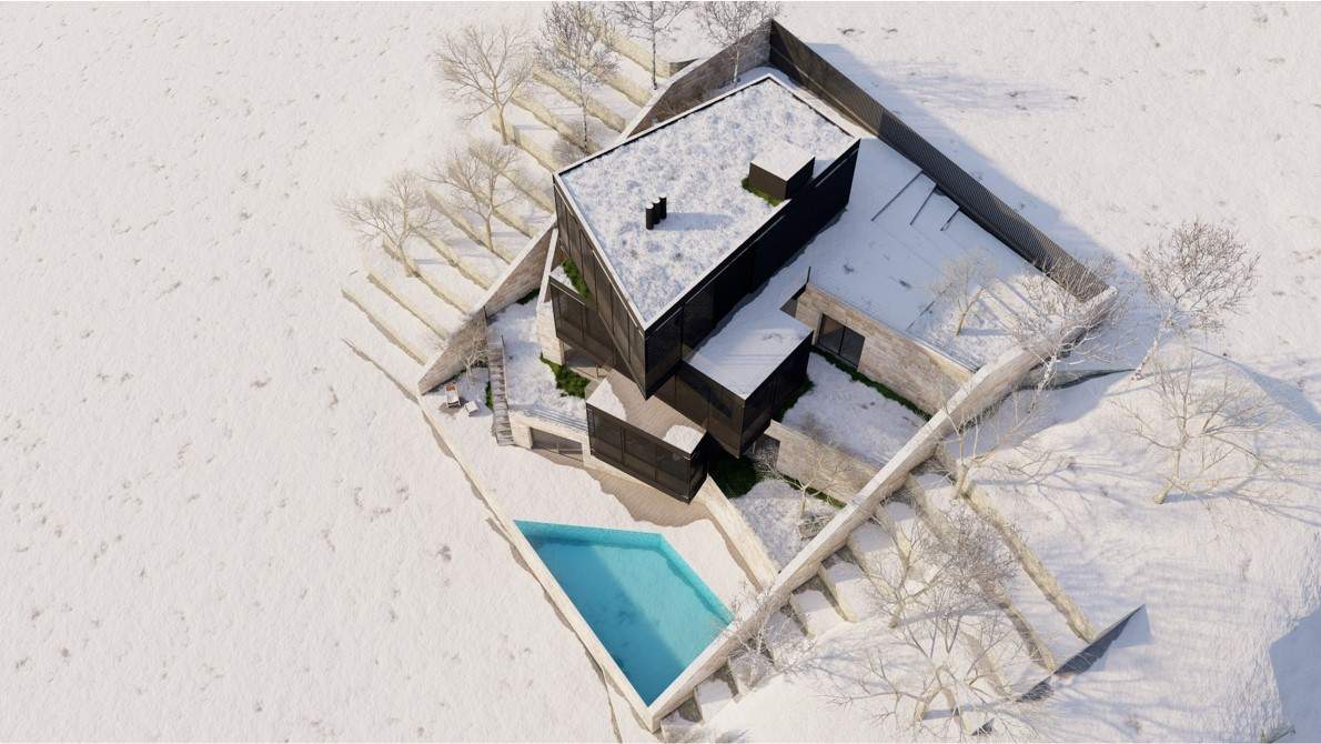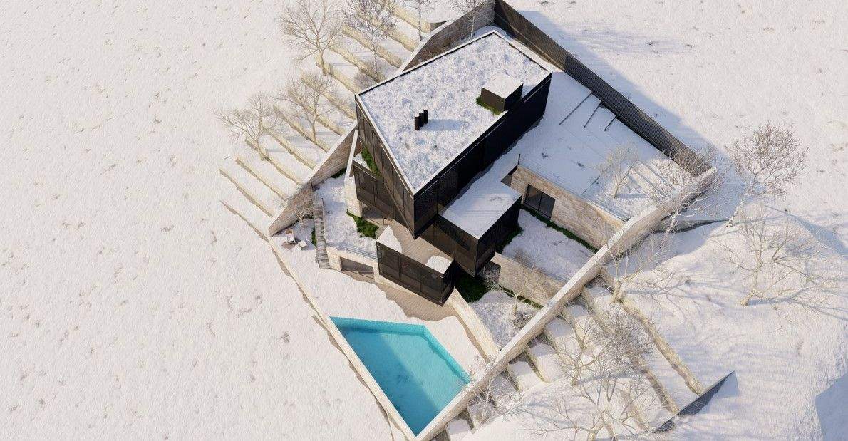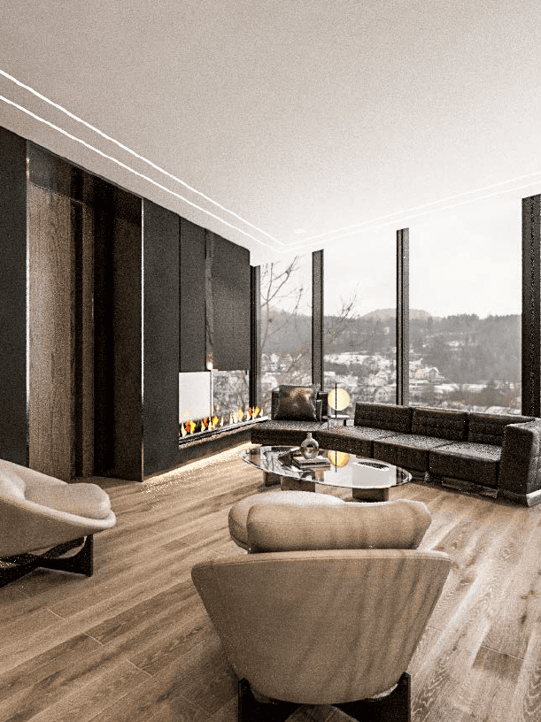 The F Chalet, situated in the mountainous landscape of Faqra, Lebanon, is designed to complement its natural surroundings. The structure is divided into two main components: solid walls and a rotating black volume. The walls are anchored and contain private spaces within recessed sections. The rotating black volume, which houses public areas, includes movable panels and a retractable glass facade. This design allows the space to transition between open-air environments in summer and enclosed areas during cooler months. This adaptable approach ensures that the F Chalet integrates smoothly with Faqra’s natural topography.