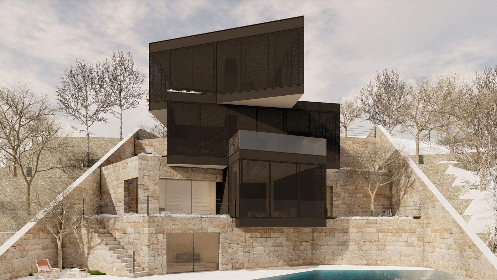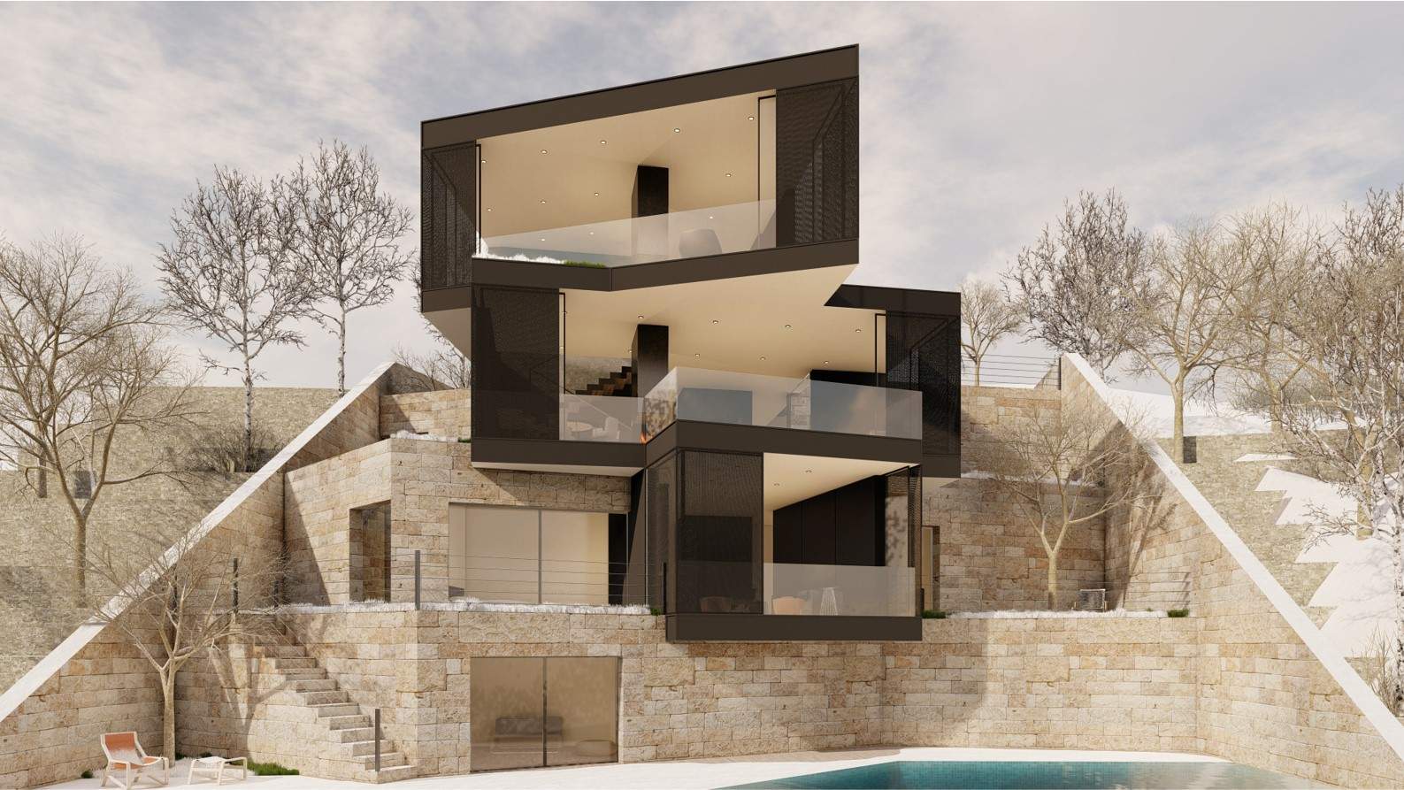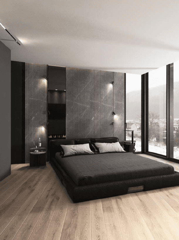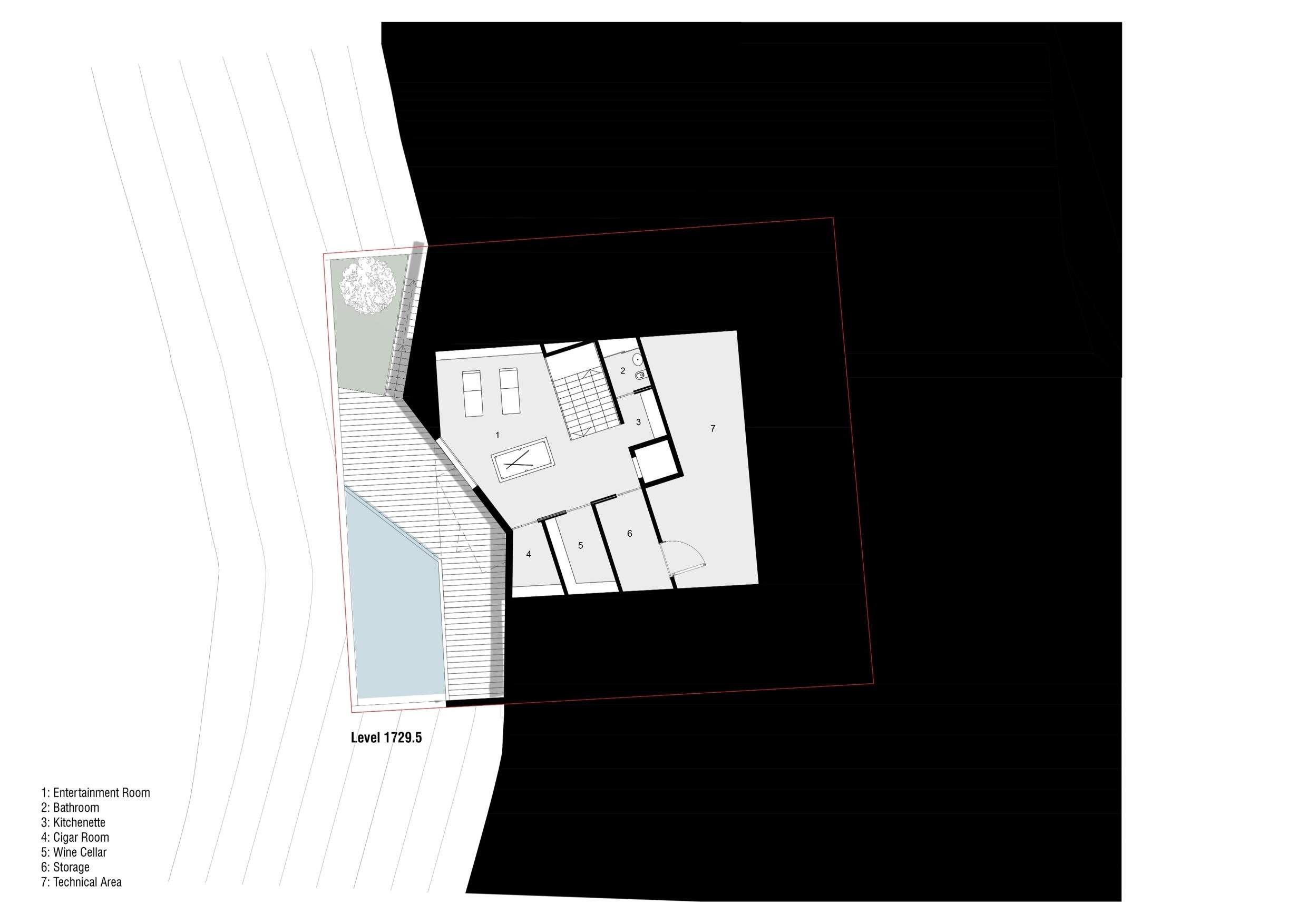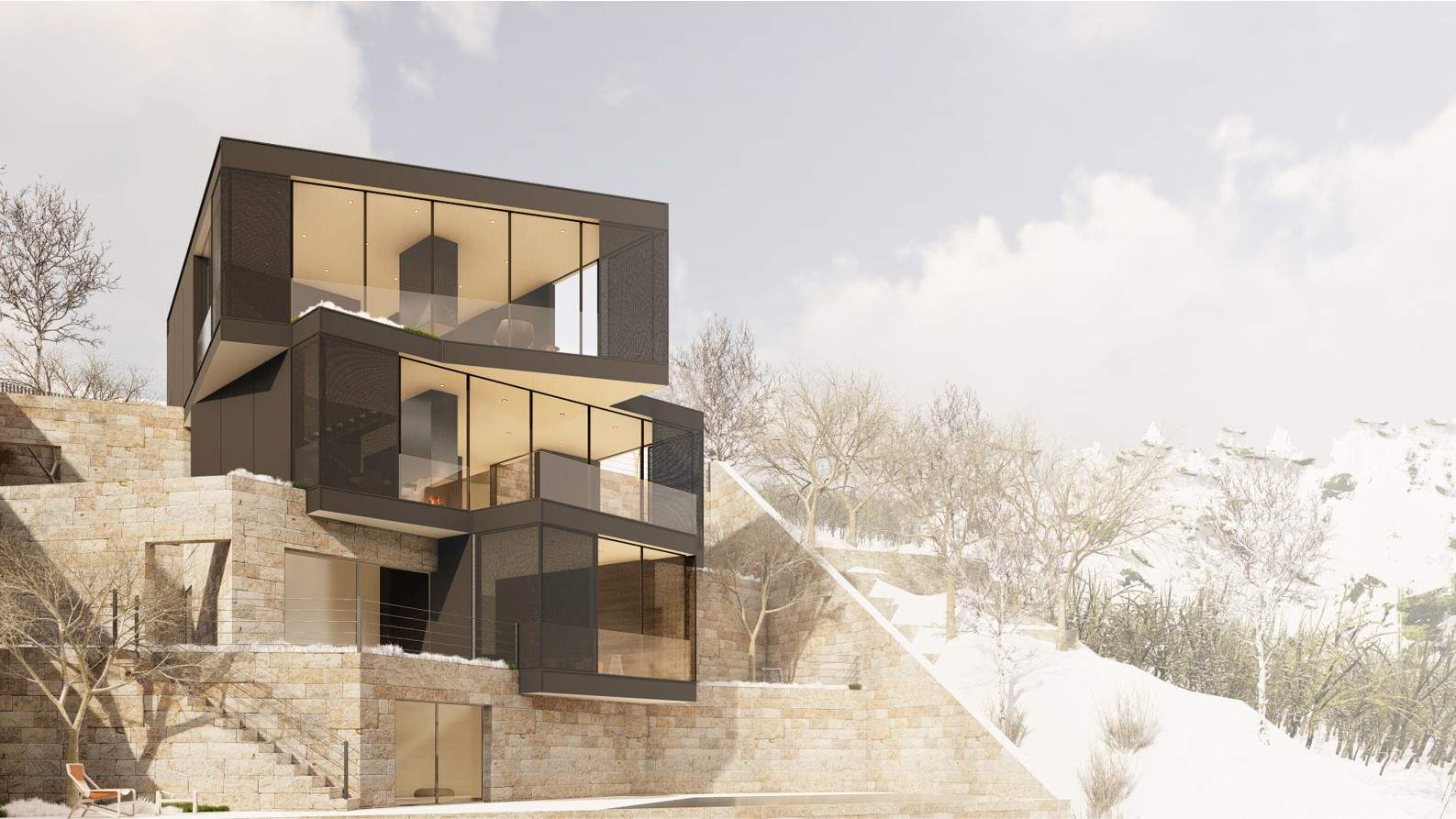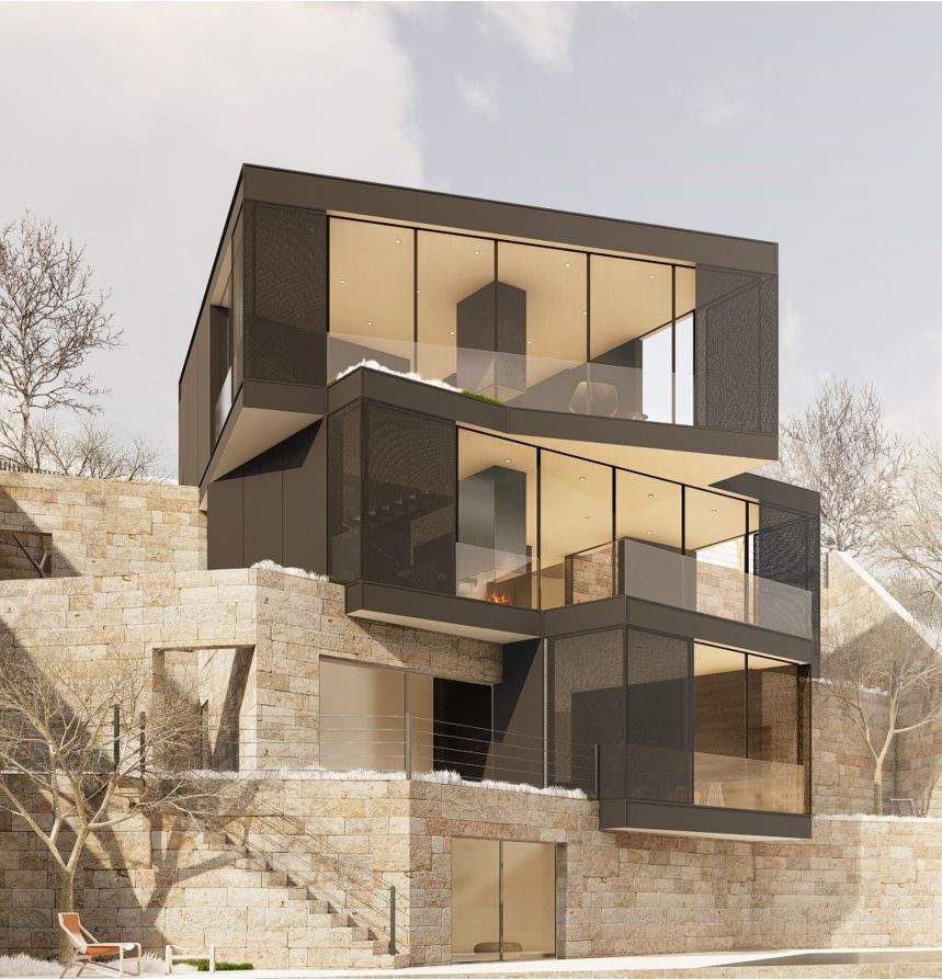 The F Chalet, situated in the mountainous landscape of Faqra, Lebanon, is designed to complement its natural surroundings. The structure is divided into two main components: solid walls and a rotating black volume. The walls are anchored and contain private spaces within recessed sections. The rotating black volume, which houses public areas, includes movable panels and a retractable glass facade. This design allows the space to transition between open-air environments in summer and enclosed areas during cooler months. This adaptable approach ensures that the F Chalet integrates smoothly with Faqra’s natural topography.