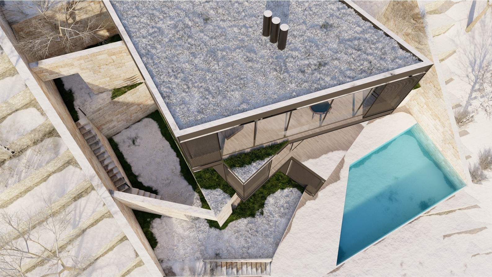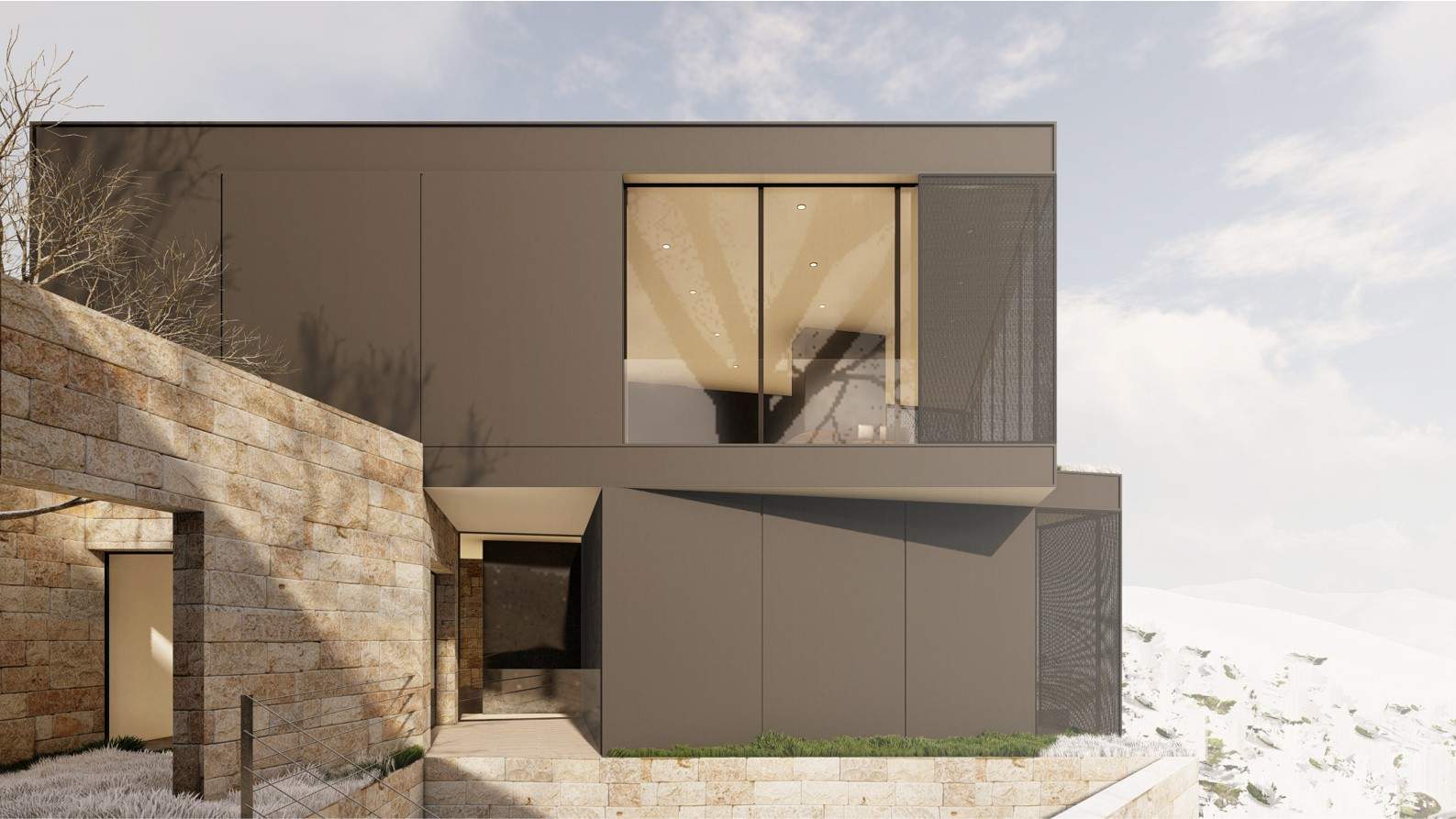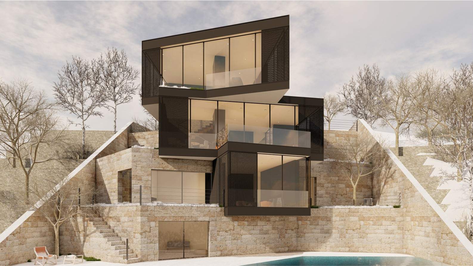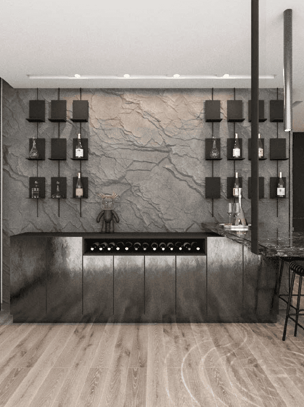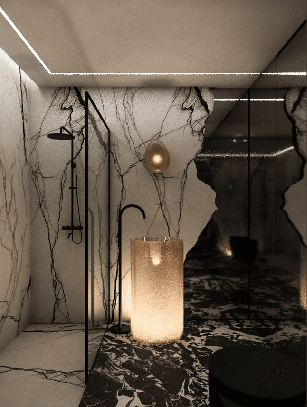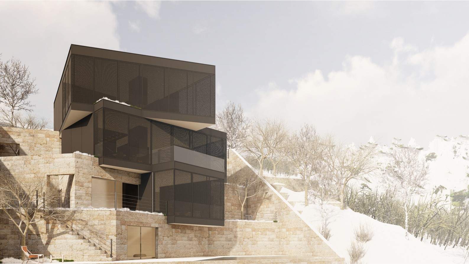 The F Chalet, situated in the mountainous landscape of Faqra, Lebanon, is designed to complement its natural surroundings. The structure is divided into two main components: solid walls and a rotating black volume. The walls are anchored and contain private spaces within recessed sections. The rotating black volume, which houses public areas, includes movable panels and a retractable glass facade. This design allows the space to transition between open-air environments in summer and enclosed areas during cooler months. This adaptable approach ensures that the F Chalet integrates smoothly with Faqra’s natural topography.