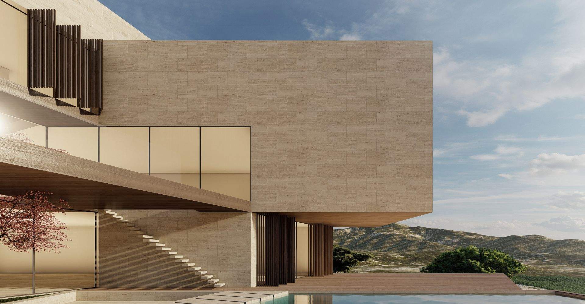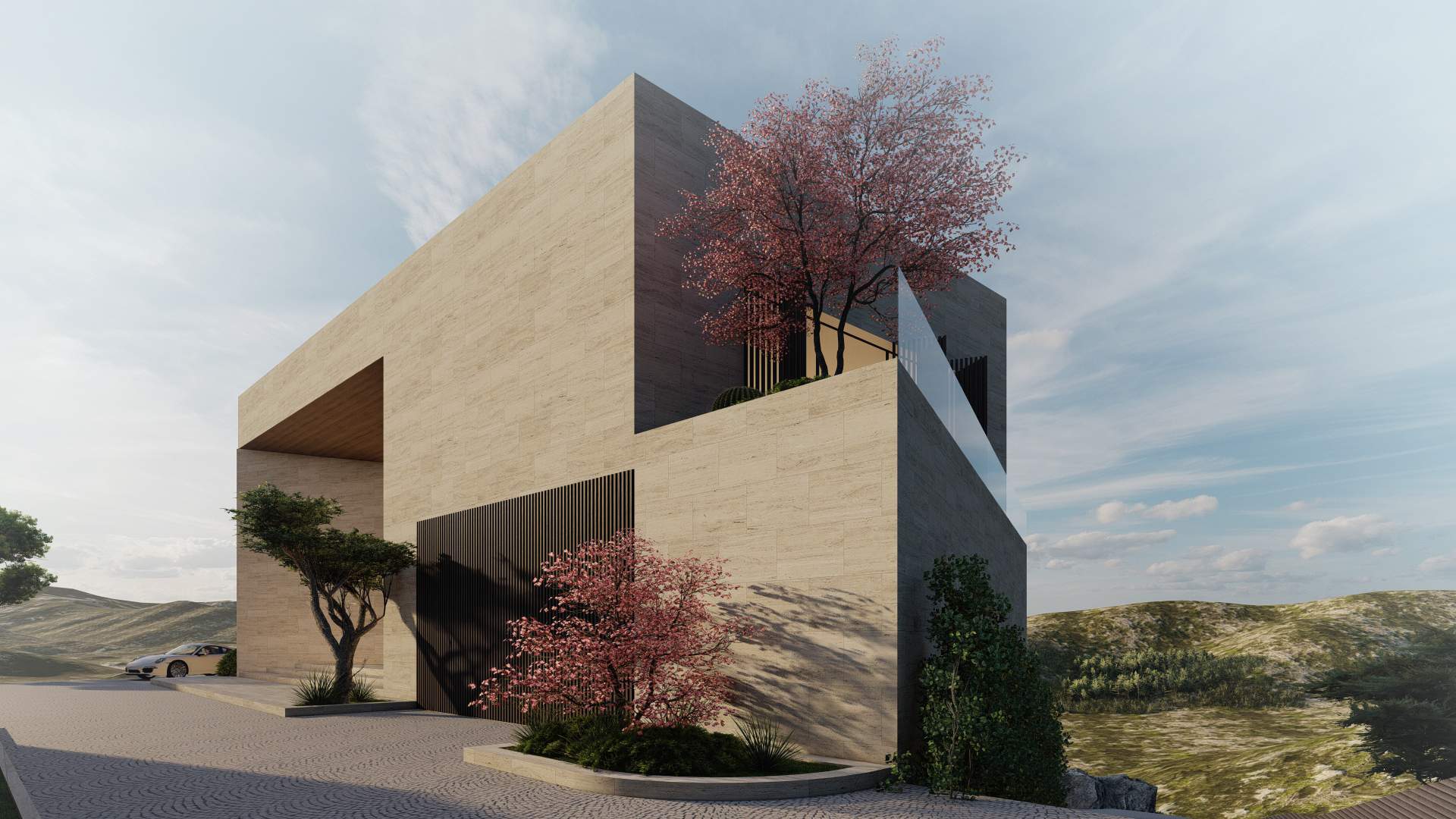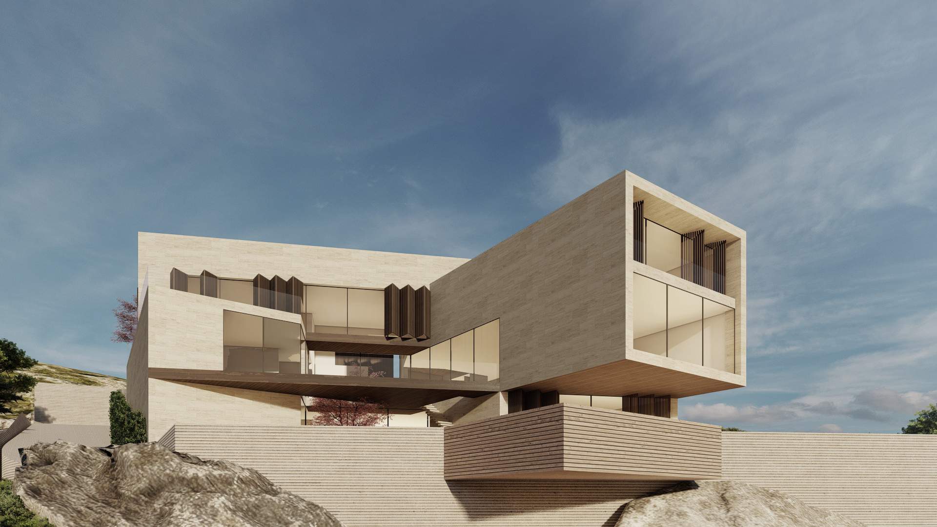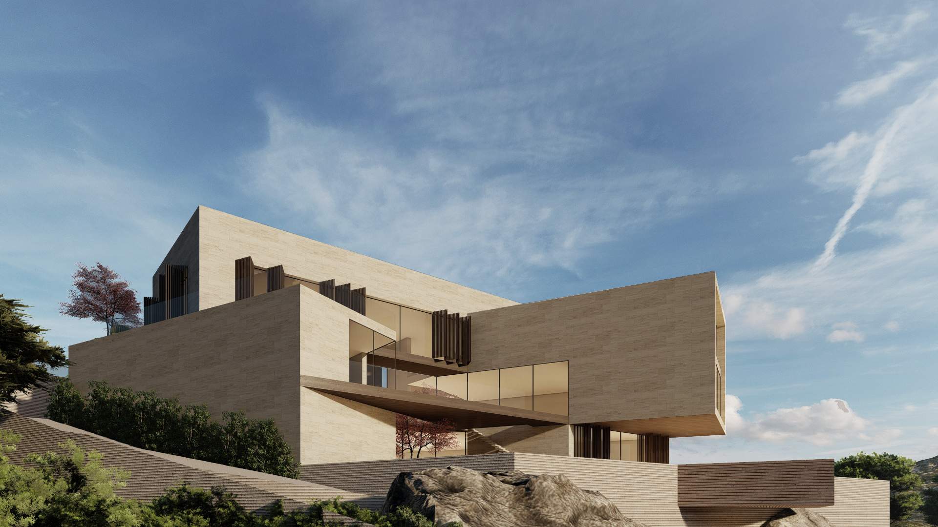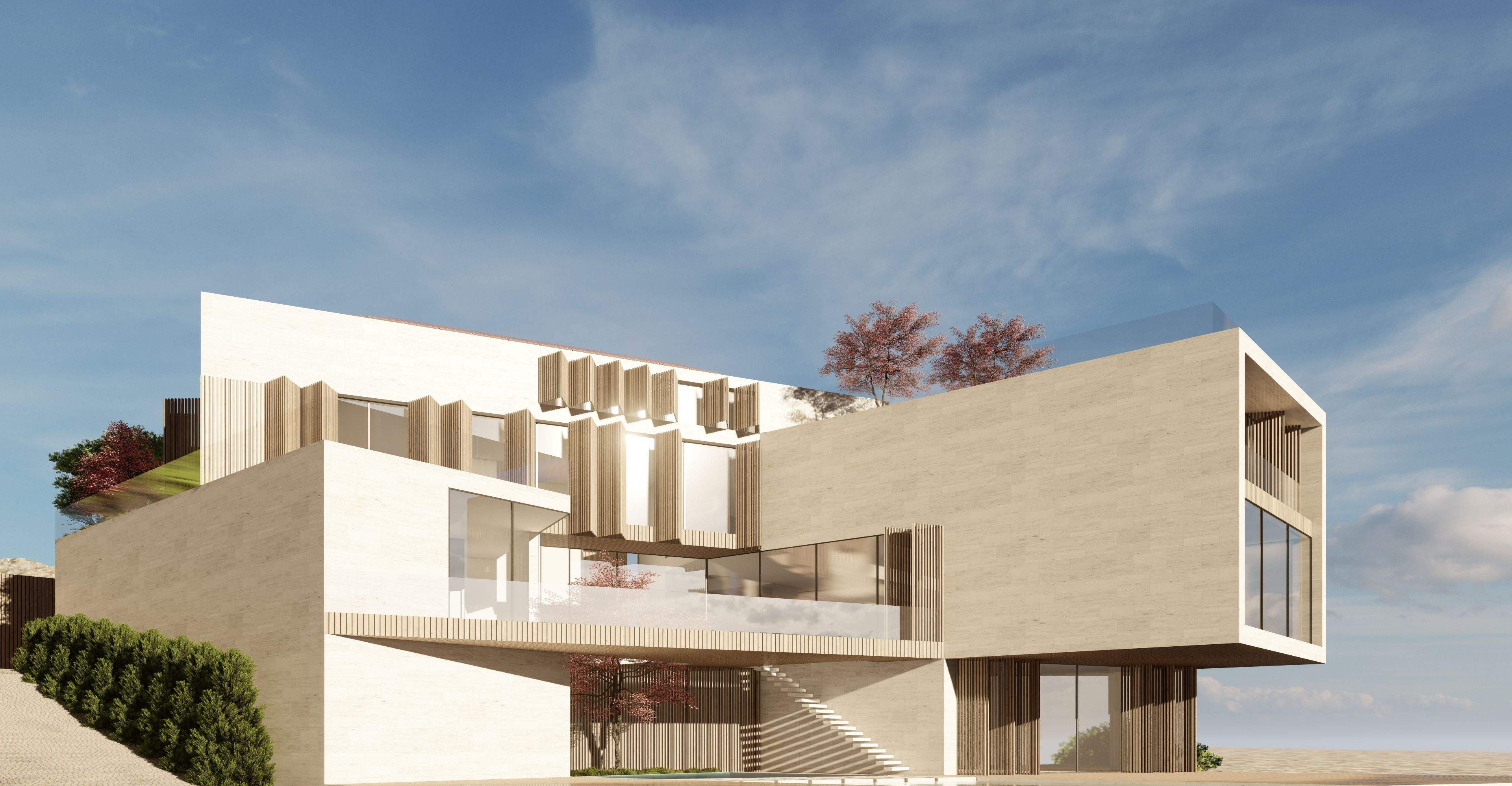 Situated in the picturesque mountains of Beit Mery, GS Villa is a thoughtfully designed building that blends harmoniously with the surrounding landscape. From the street, the villa presents a solid, unified appearance that ensures privacy. In contrast, the rear of the villa features a series of cascading and overlapping volumes that engage with the natural terrain, creating terraces, views, and green spaces. This design achieves a balance between privacy and a strong connection to the landscape, highlighting the villa's integration with its scenic surroundings.