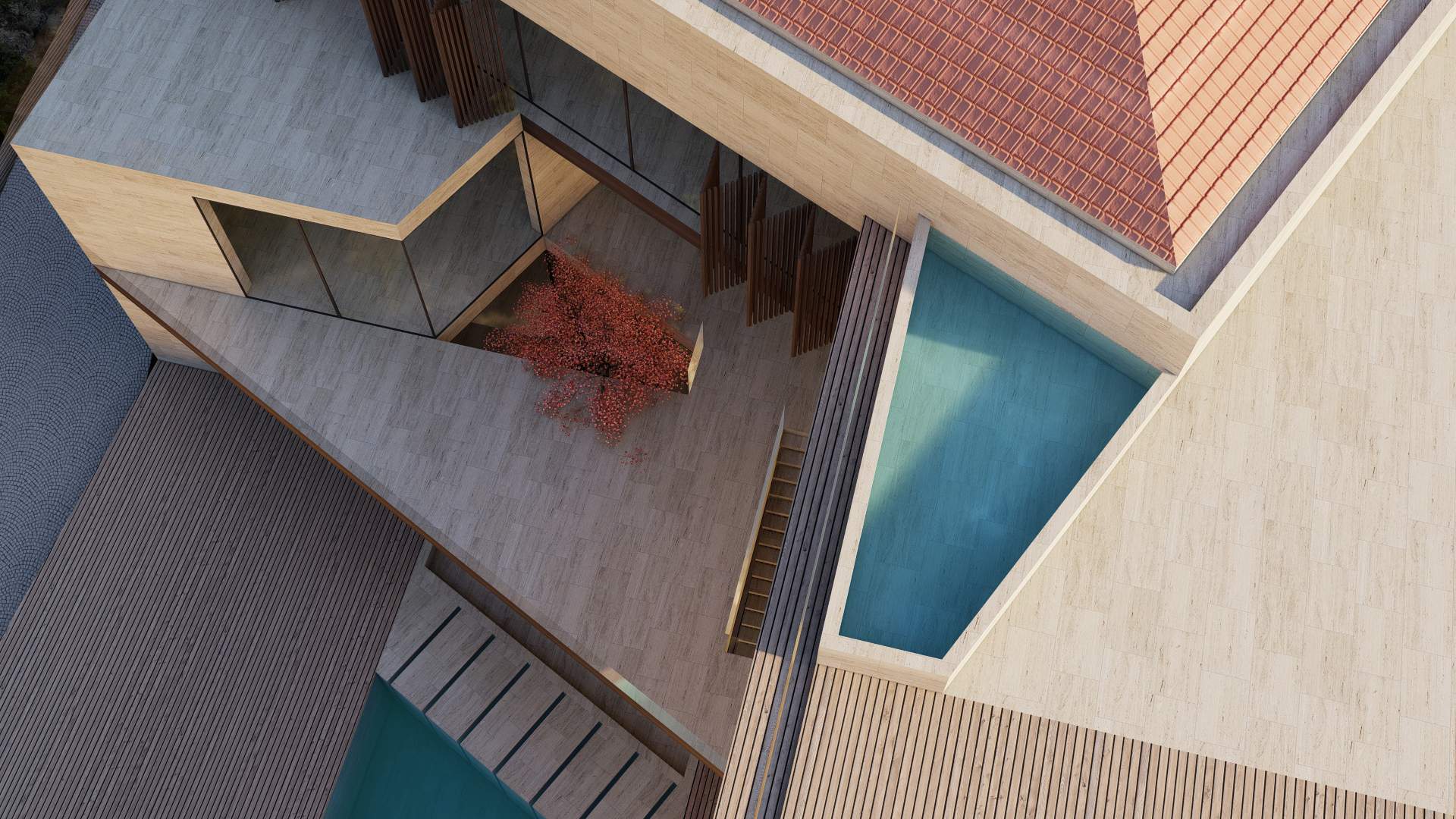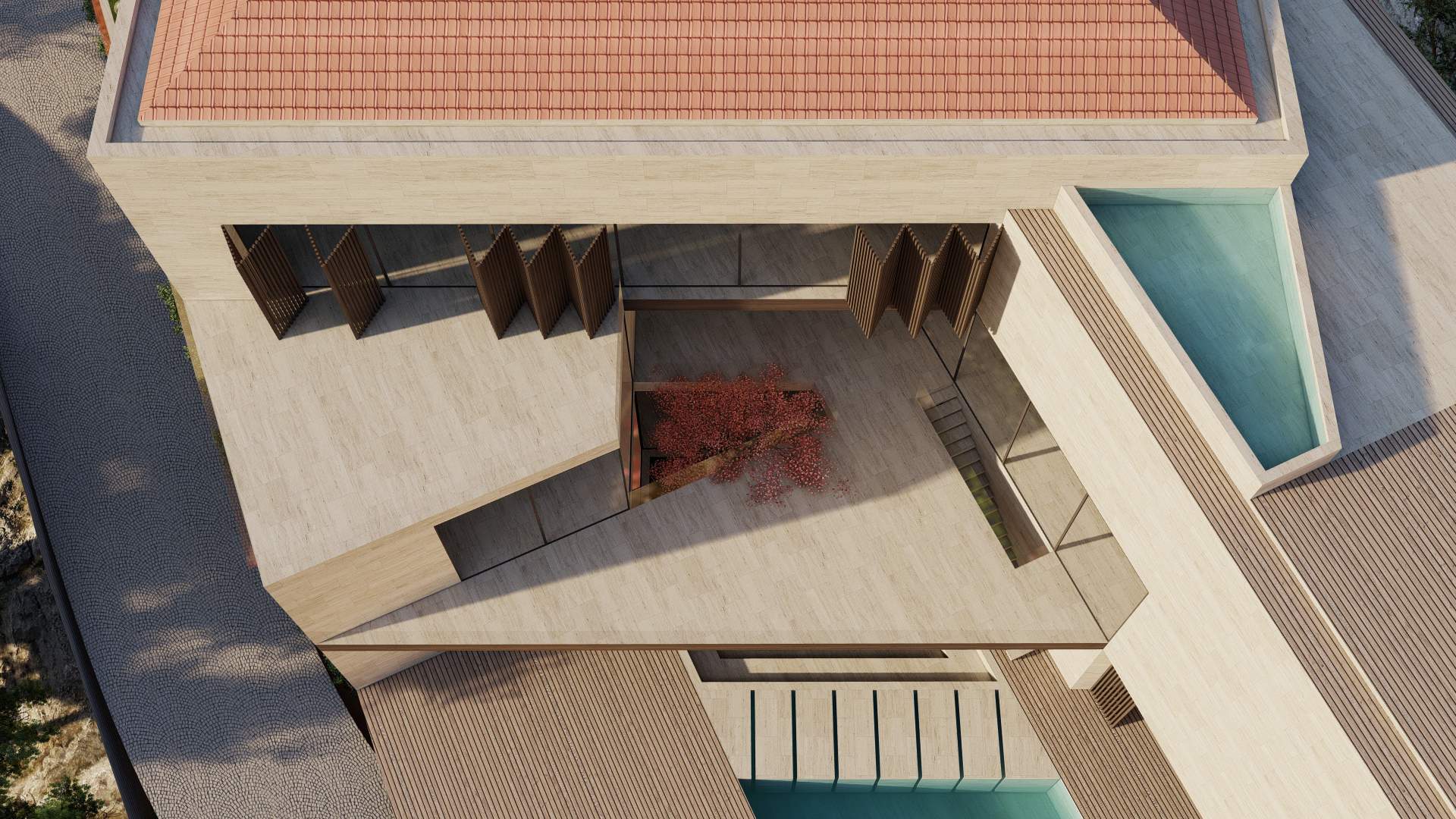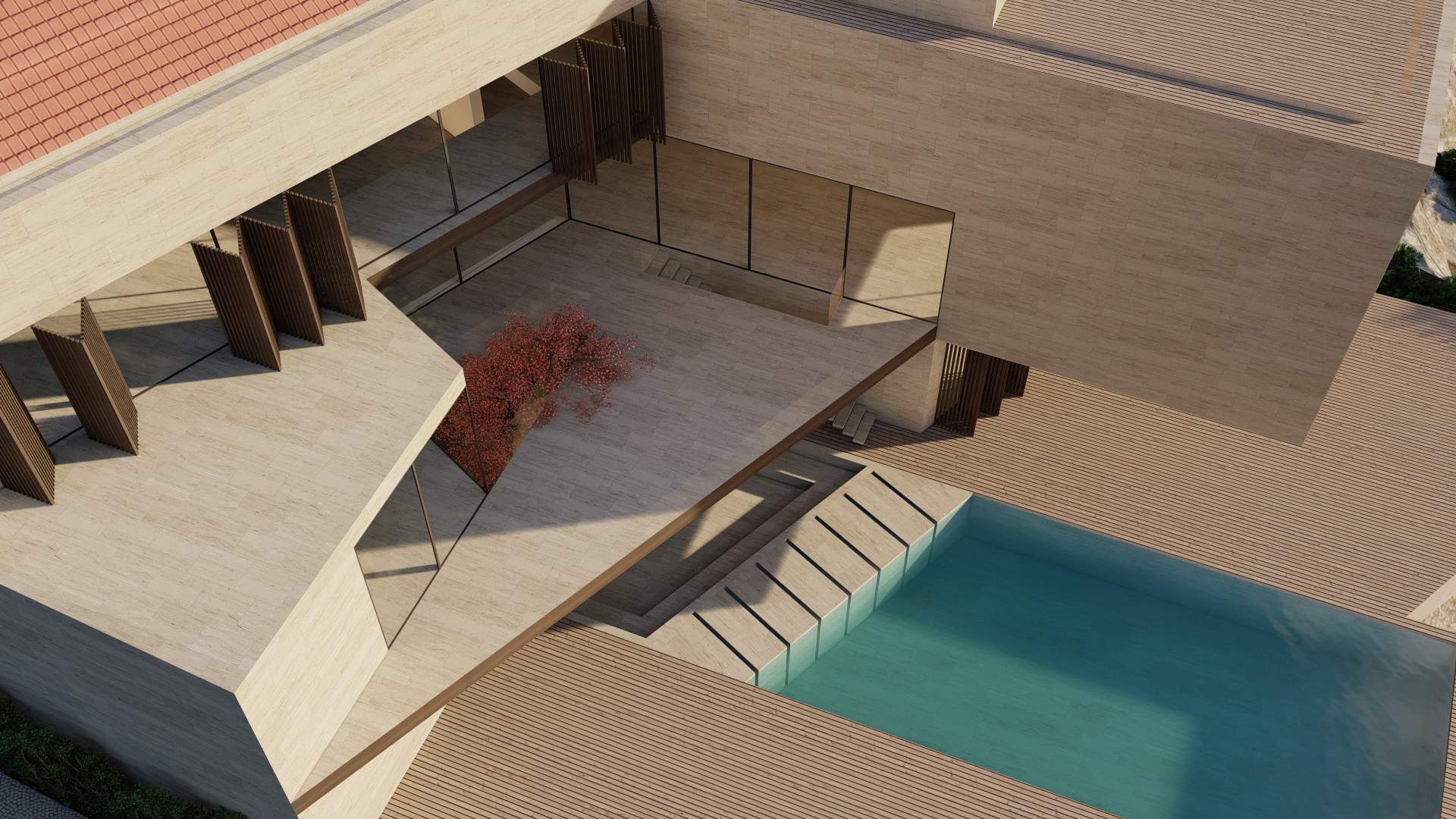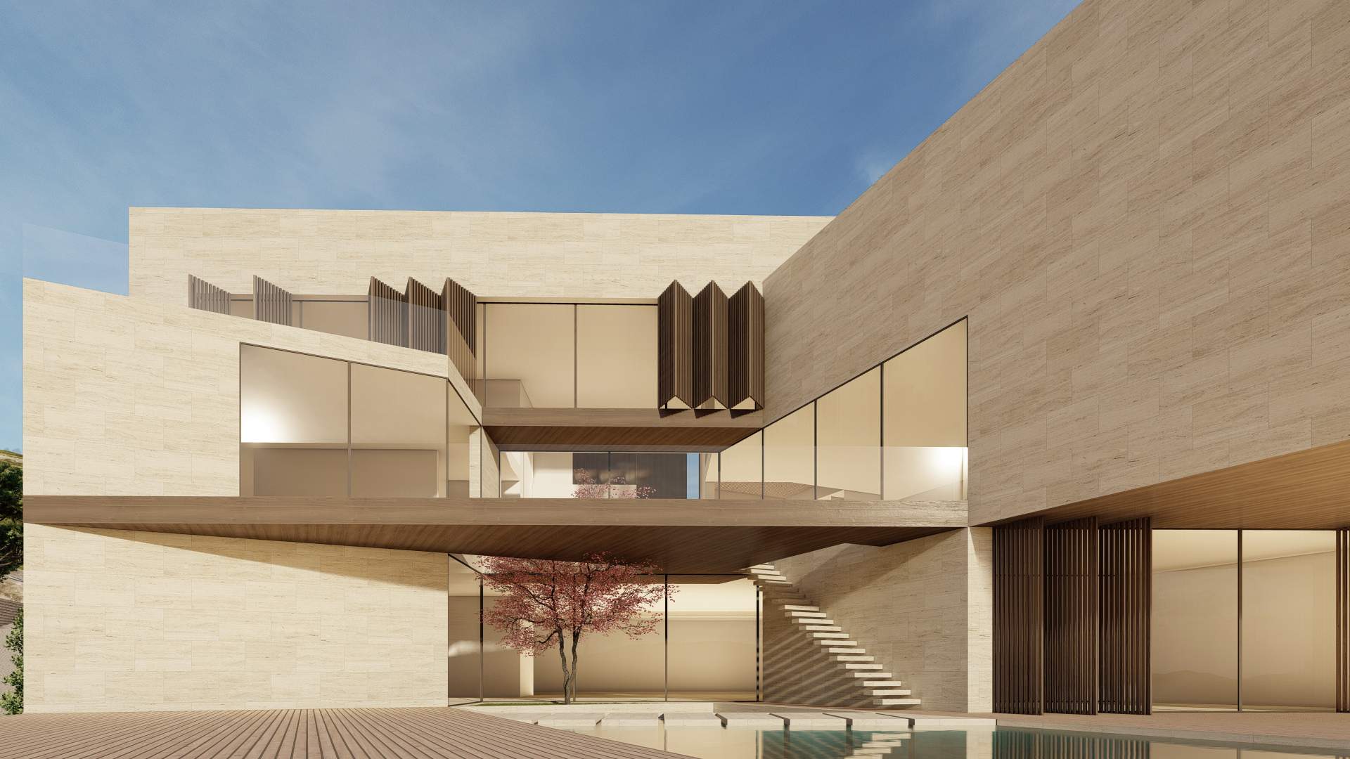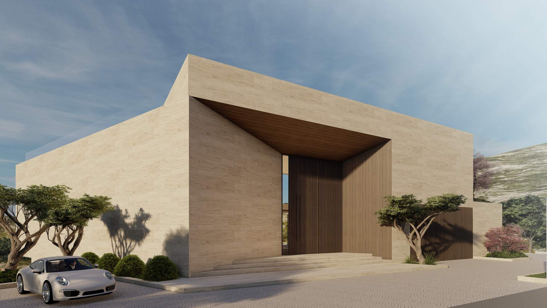 Situated in the picturesque mountains of Beit Mery, GS Villa is a thoughtfully designed building that blends harmoniously with the surrounding landscape. From the street, the villa presents a solid, unified appearance that ensures privacy. In contrast, the rear of the villa features a series of cascading and overlapping volumes that engage with the natural terrain, creating terraces, views, and green spaces. This design achieves a balance between privacy and a strong connection to the landscape, highlighting the villa's integration with its scenic surroundings.