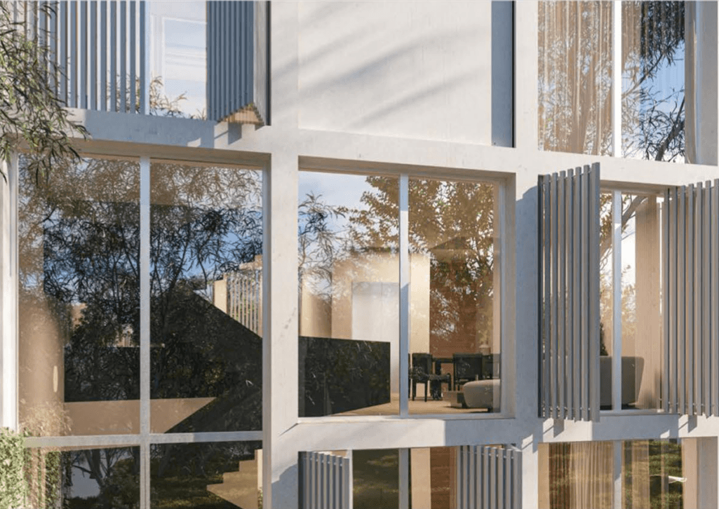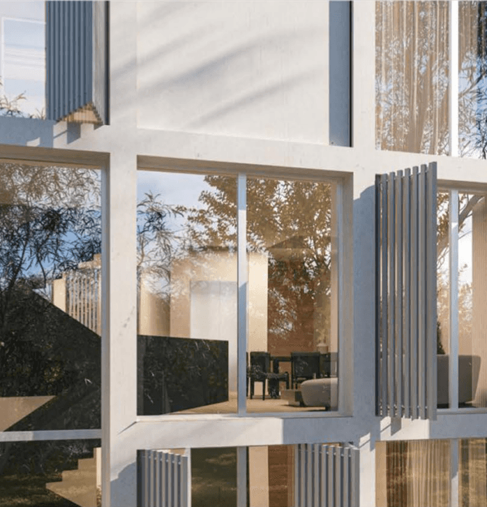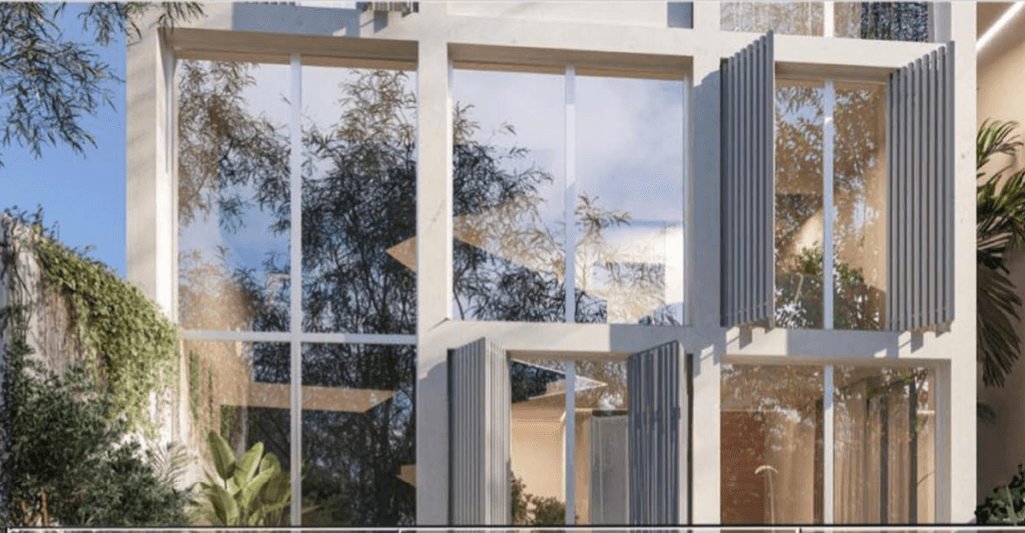 Located in Al Barari, Ixora Townhouse is a contemporary three-story building with a distinctive grid façade that serves both design and functional needs. This grid allows residents to adjust it for privacy and shading.