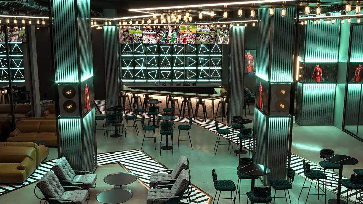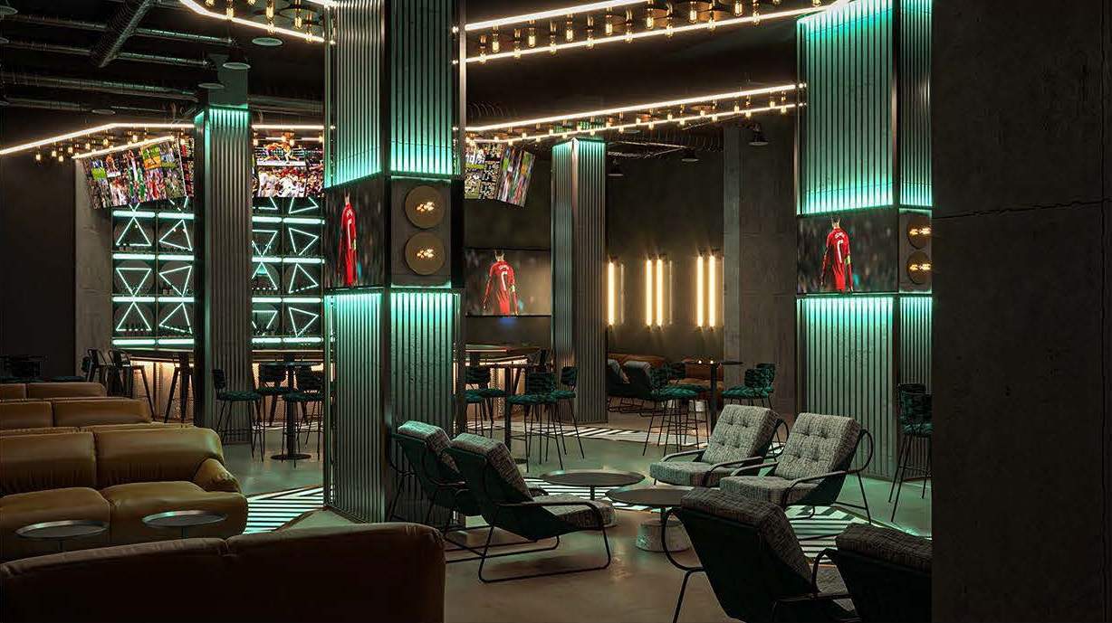 A striking LED-lit scoreboard above the central bar serves as the focal point, synchronized with live game feeds displayed on large screens throughout the venue. Plush seating, neon-lit tables, and a polished concrete bar combine to offer a setting that merges industrial design with the excitement of sports culture. "Neon Pulse" provides a dynamic environment where the thrill of the game is enhanced by a visually stimulating neon-inspired design.