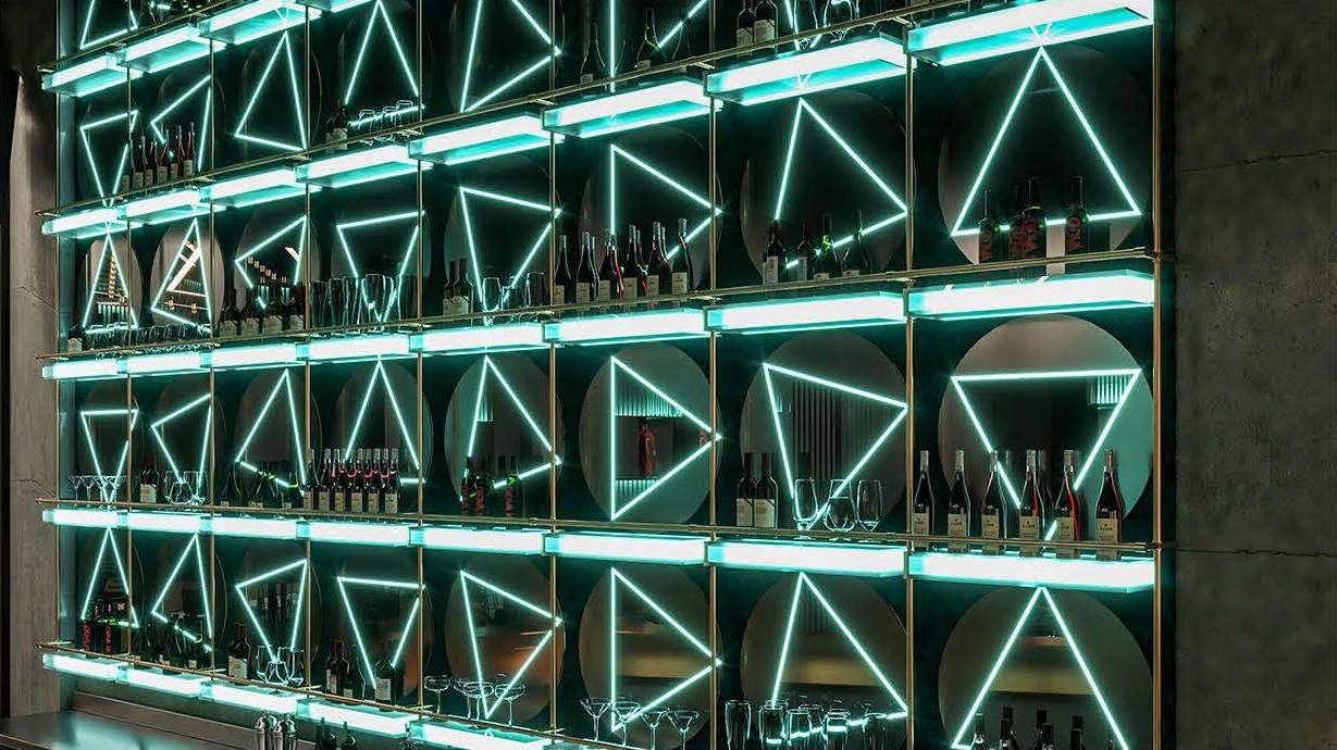 "Neon Pulse," an ultra-modern sports bar designed to deliver a unique and energetic experience. The interior features black back-painted glass walls adorned with neon signs of iconic sports logos, creating a vibrant atmosphere reminiscent of stadium lighting.