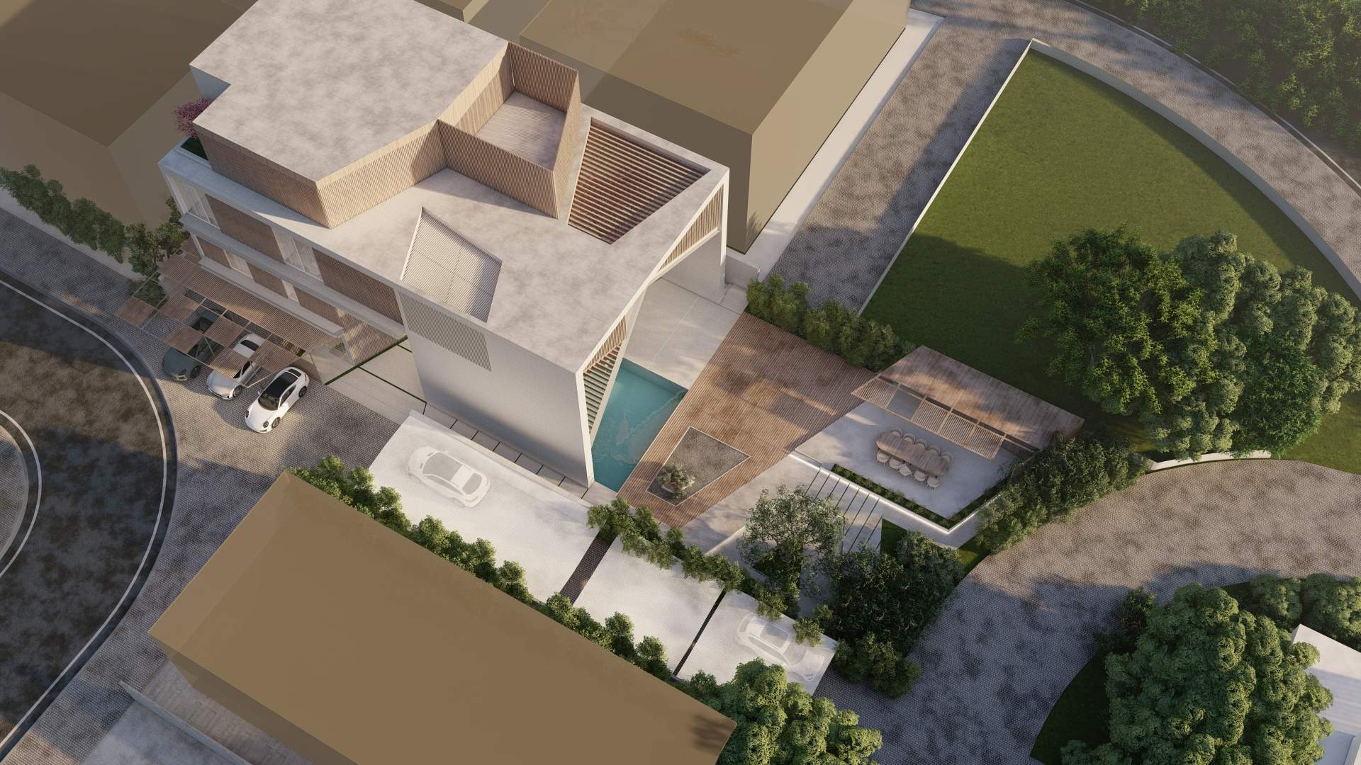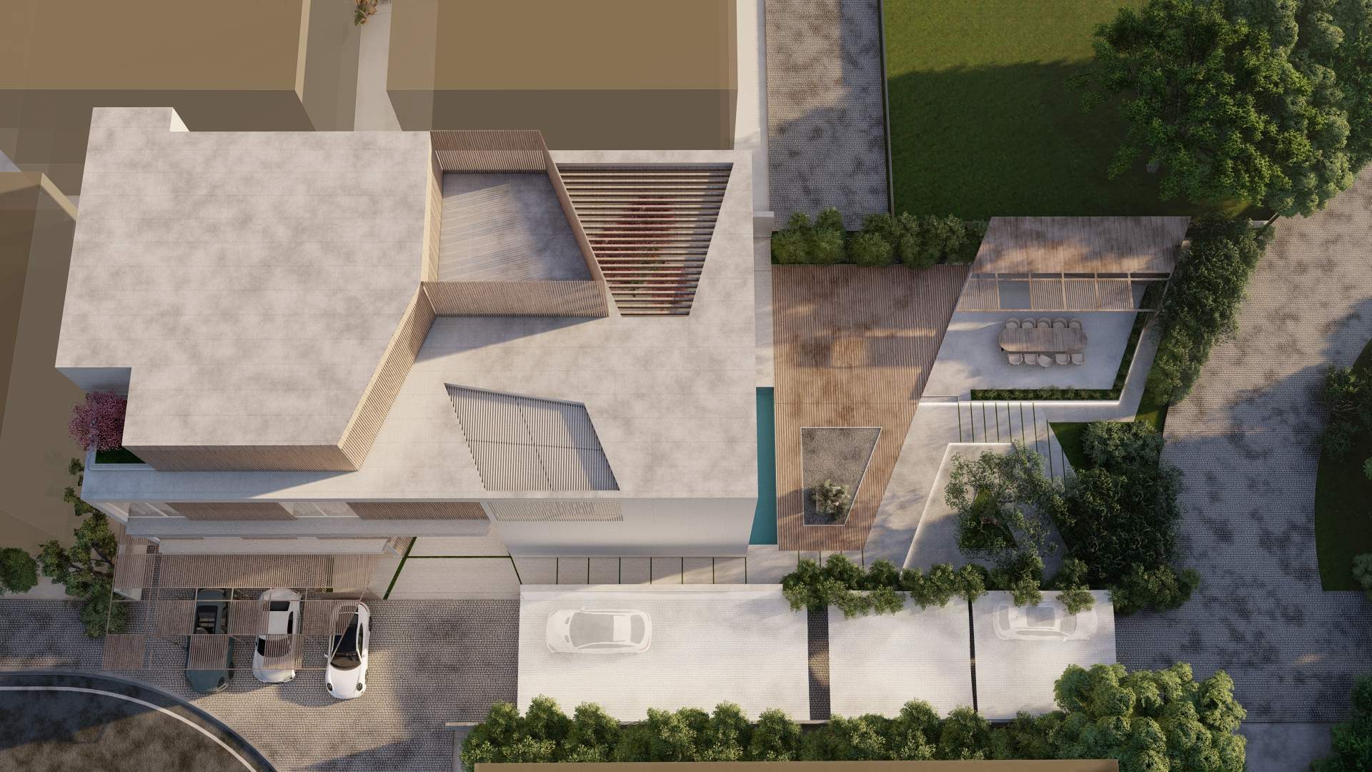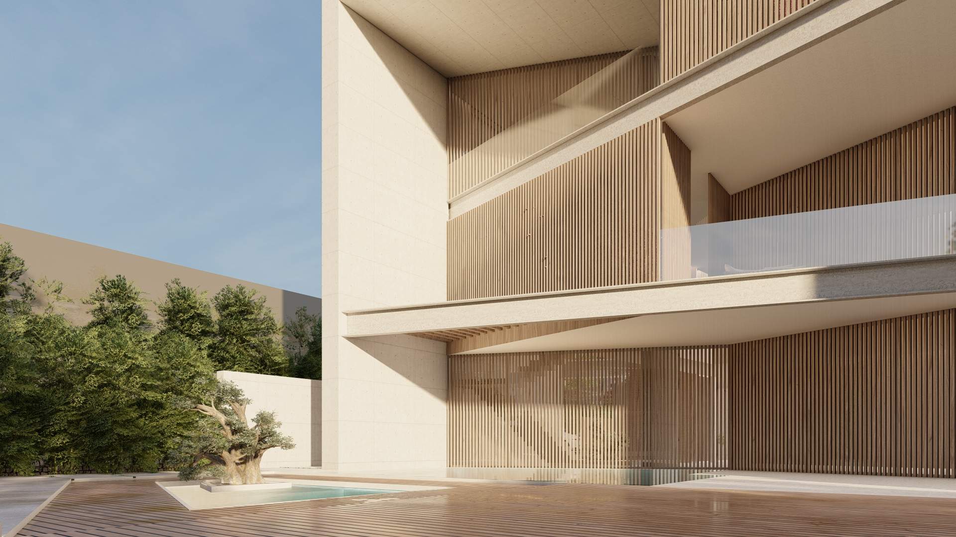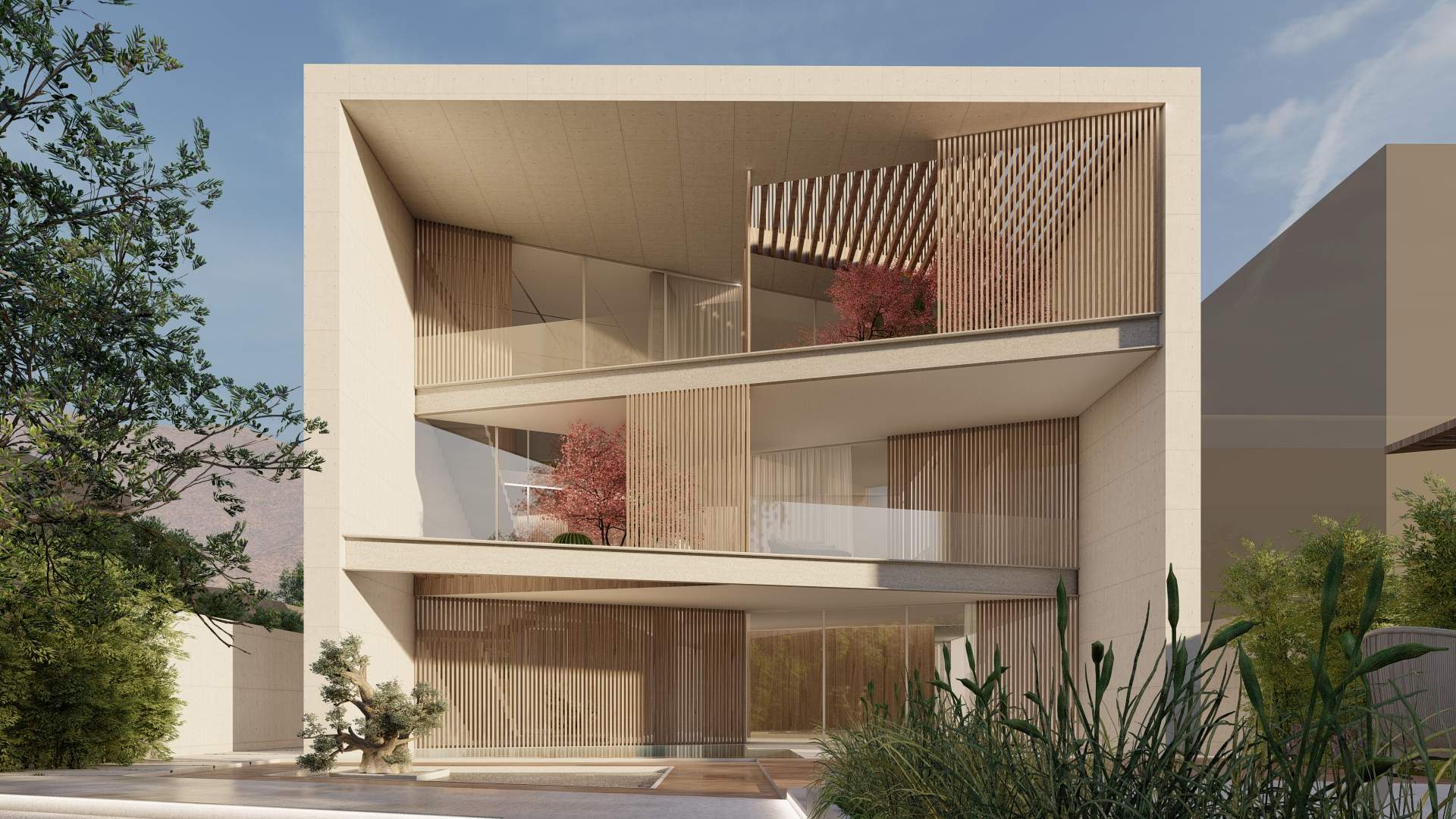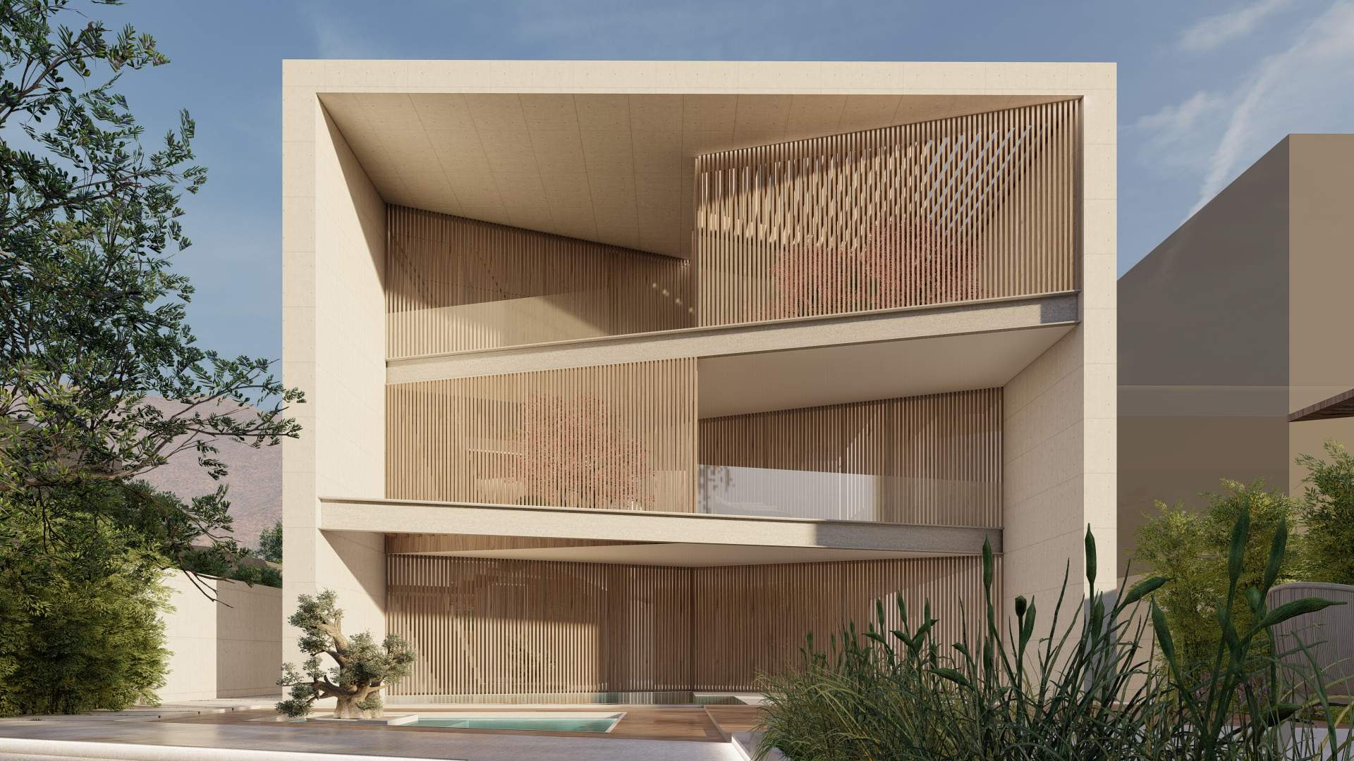 PS Residence in Kuwait presents a modern architectural design with its solid concrete box structure. Strategic cuts from this form produce distinctive angular facades that are fully glazed, creating a seamless connection between the interior and the landscape. These large glass areas allow natural light to flood the space and visually extend the living areas into the surroundings. The residence's bold geometric design and transparent surfaces embody contemporary living while enhancing its integration with the exterior environment.