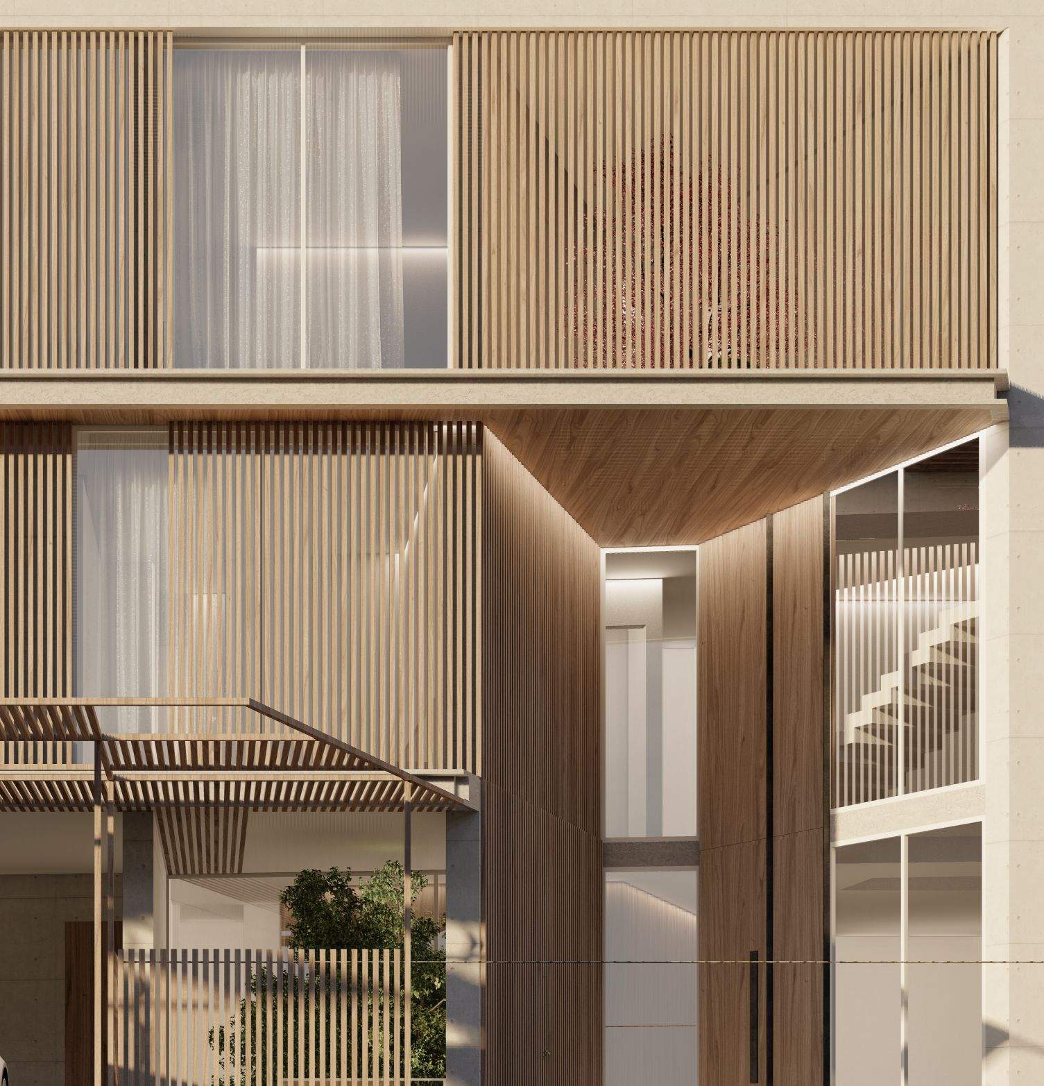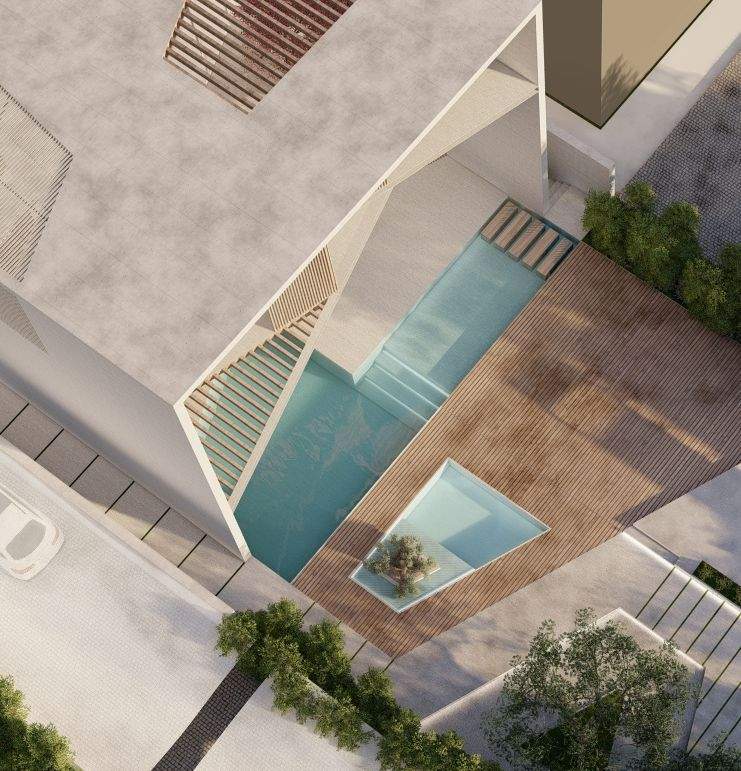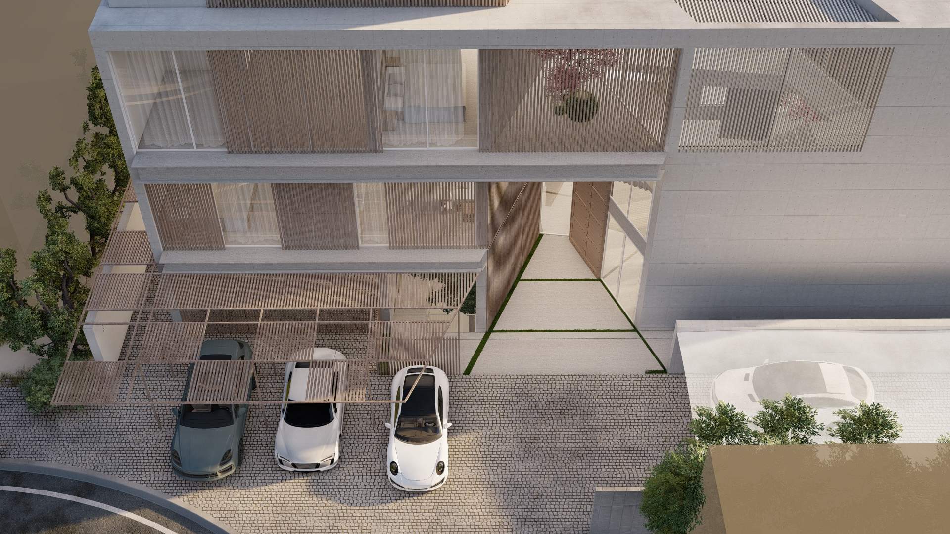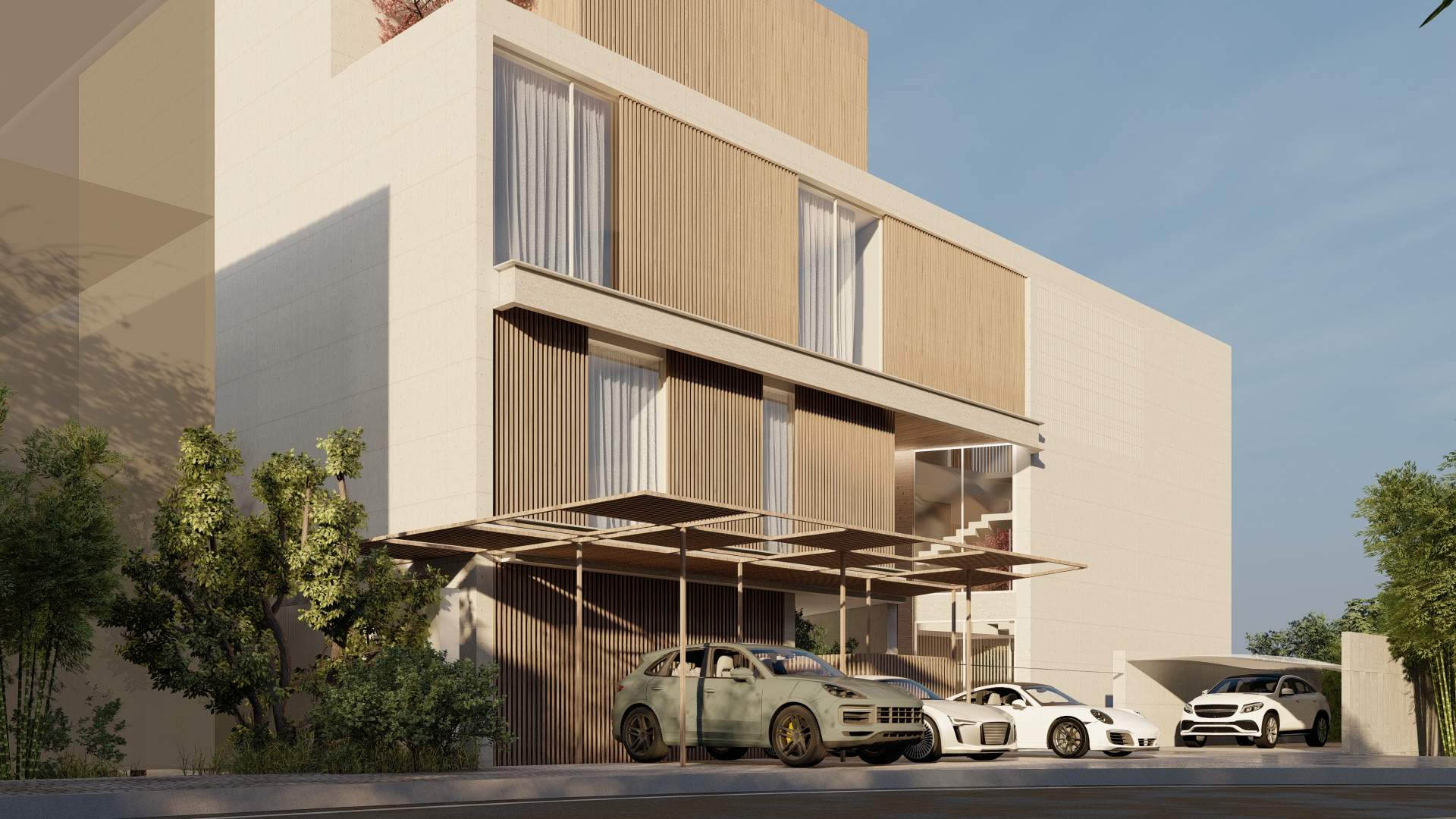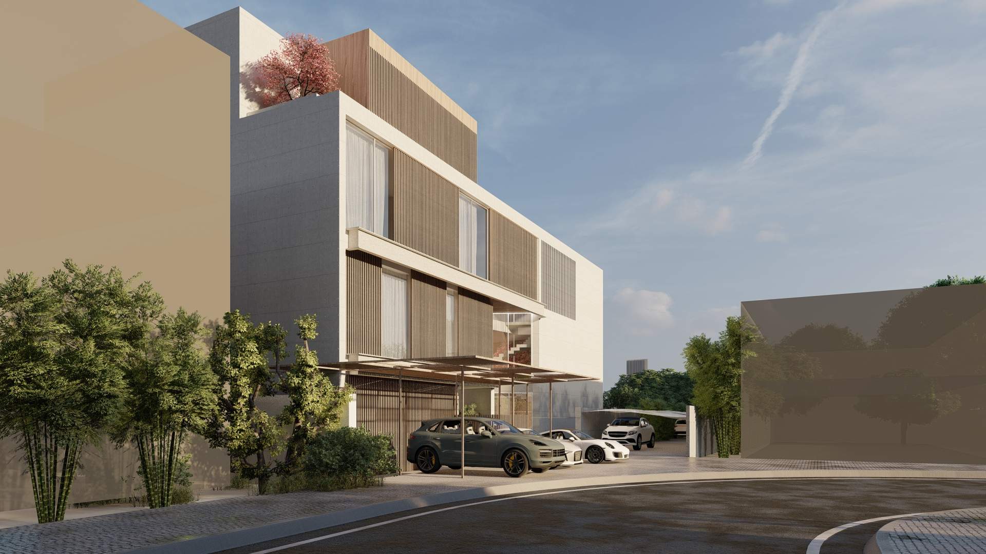 PS Residence in Kuwait presents a modern architectural design with its solid concrete box structure. Strategic cuts from this form produce distinctive angular facades that are fully glazed, creating a seamless connection between the interior and the landscape. These large glass areas allow natural light to flood the space and visually extend the living areas into the surroundings. The residence's bold geometric design and transparent surfaces embody contemporary living while enhancing its integration with the exterior environment.