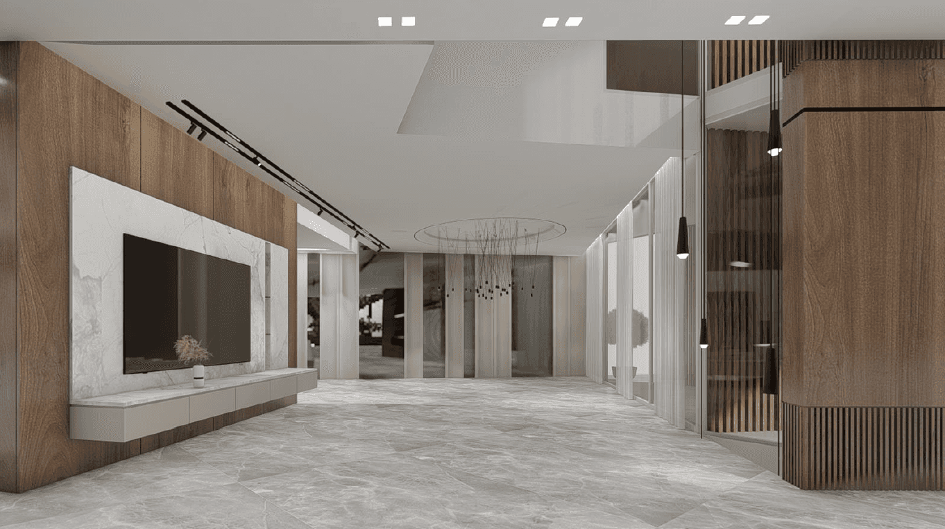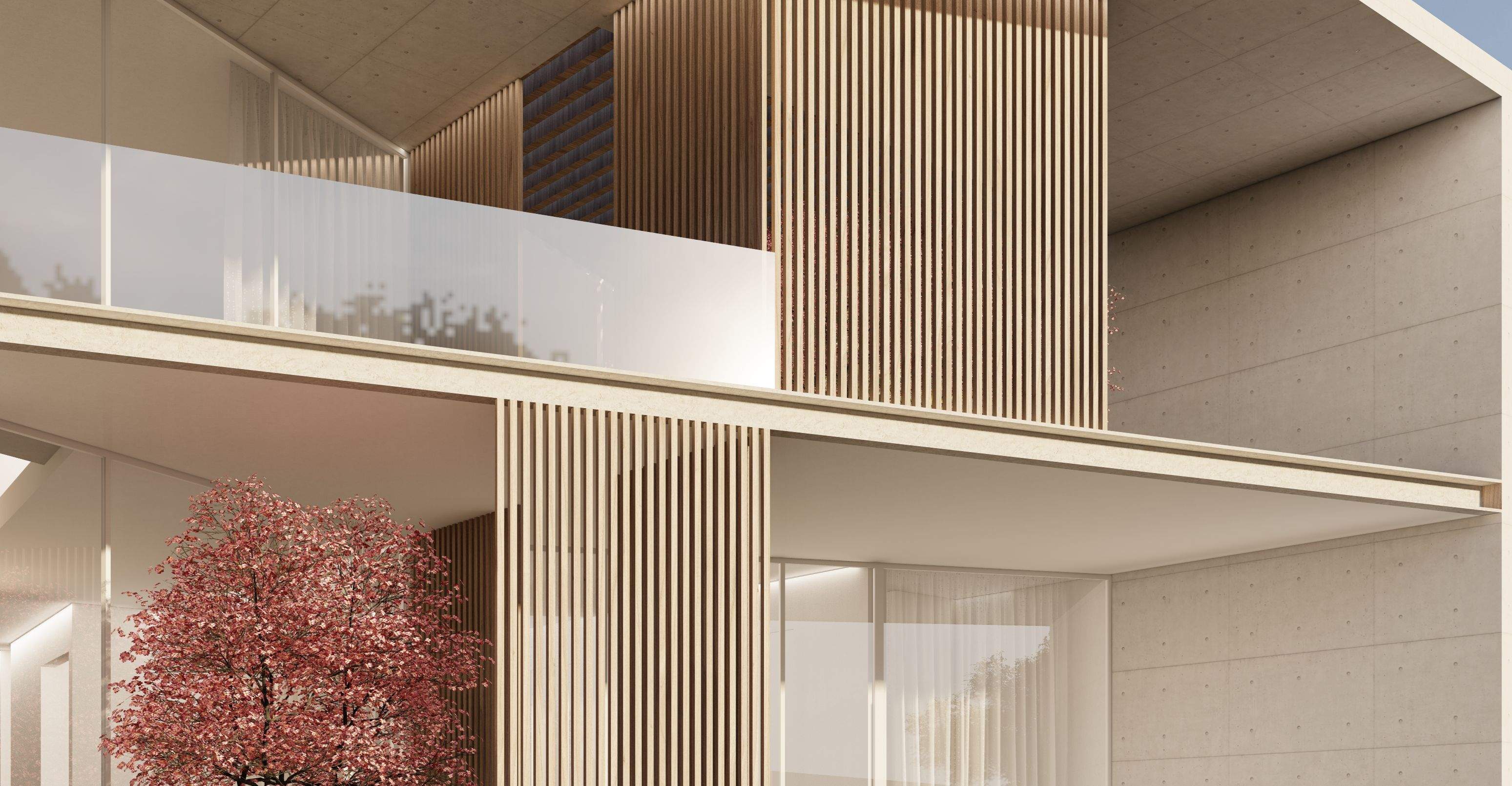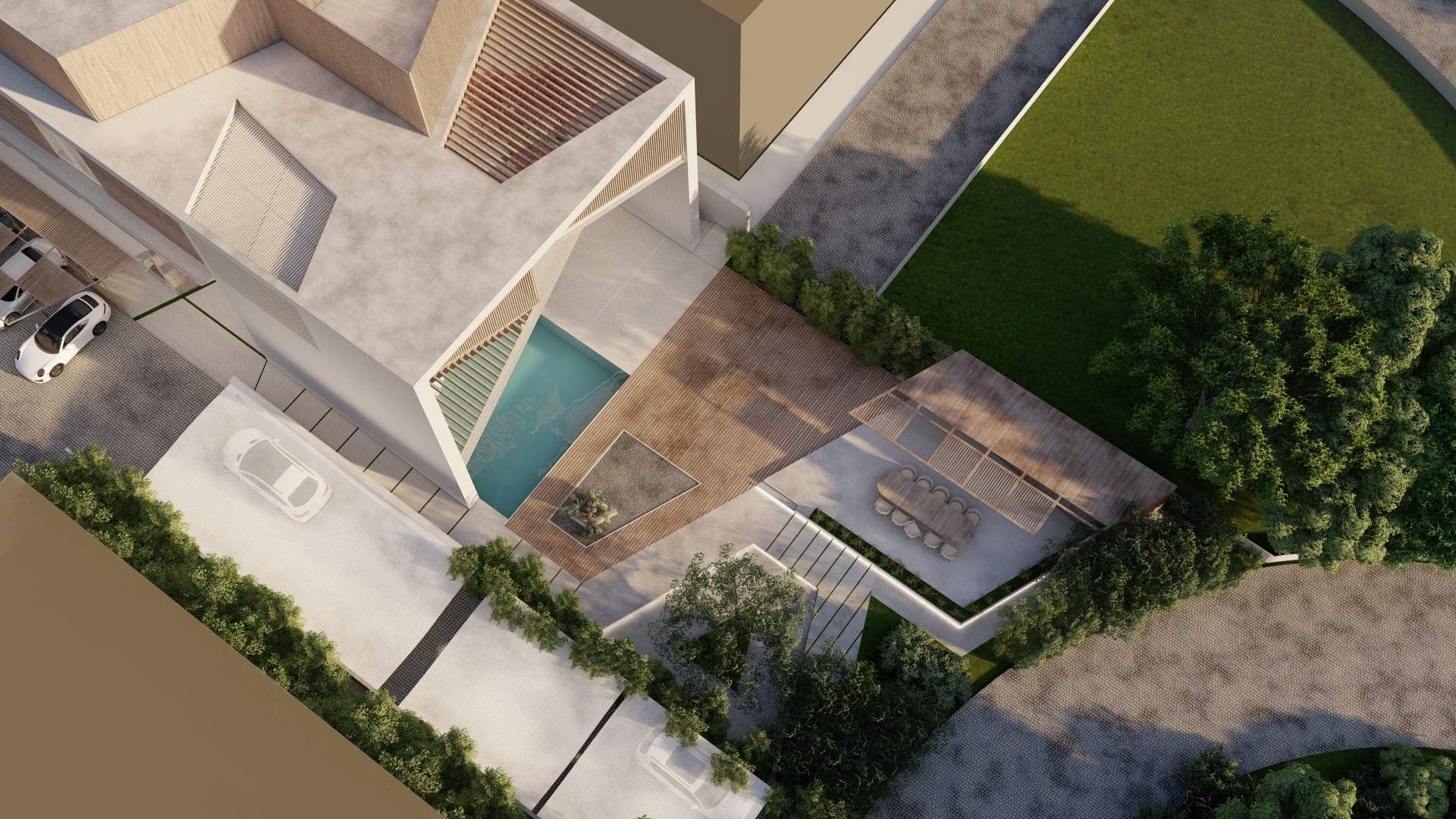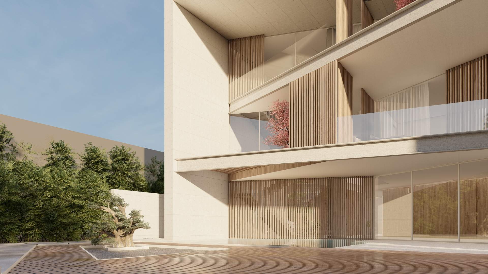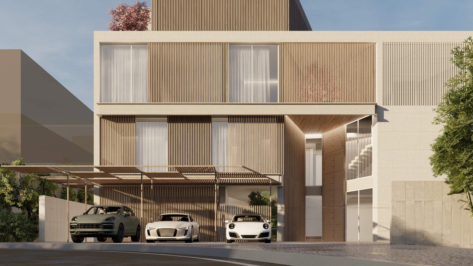 PS Residence in Kuwait presents a modern architectural design with its solid concrete box structure. Strategic cuts from this form produce distinctive angular facades that are fully glazed, creating a seamless connection between the interior and the landscape. These large glass areas allow natural light to flood the space and visually extend the living areas into the surroundings. The residence's bold geometric design and transparent surfaces embody contemporary living while enhancing its integration with the exterior environment.