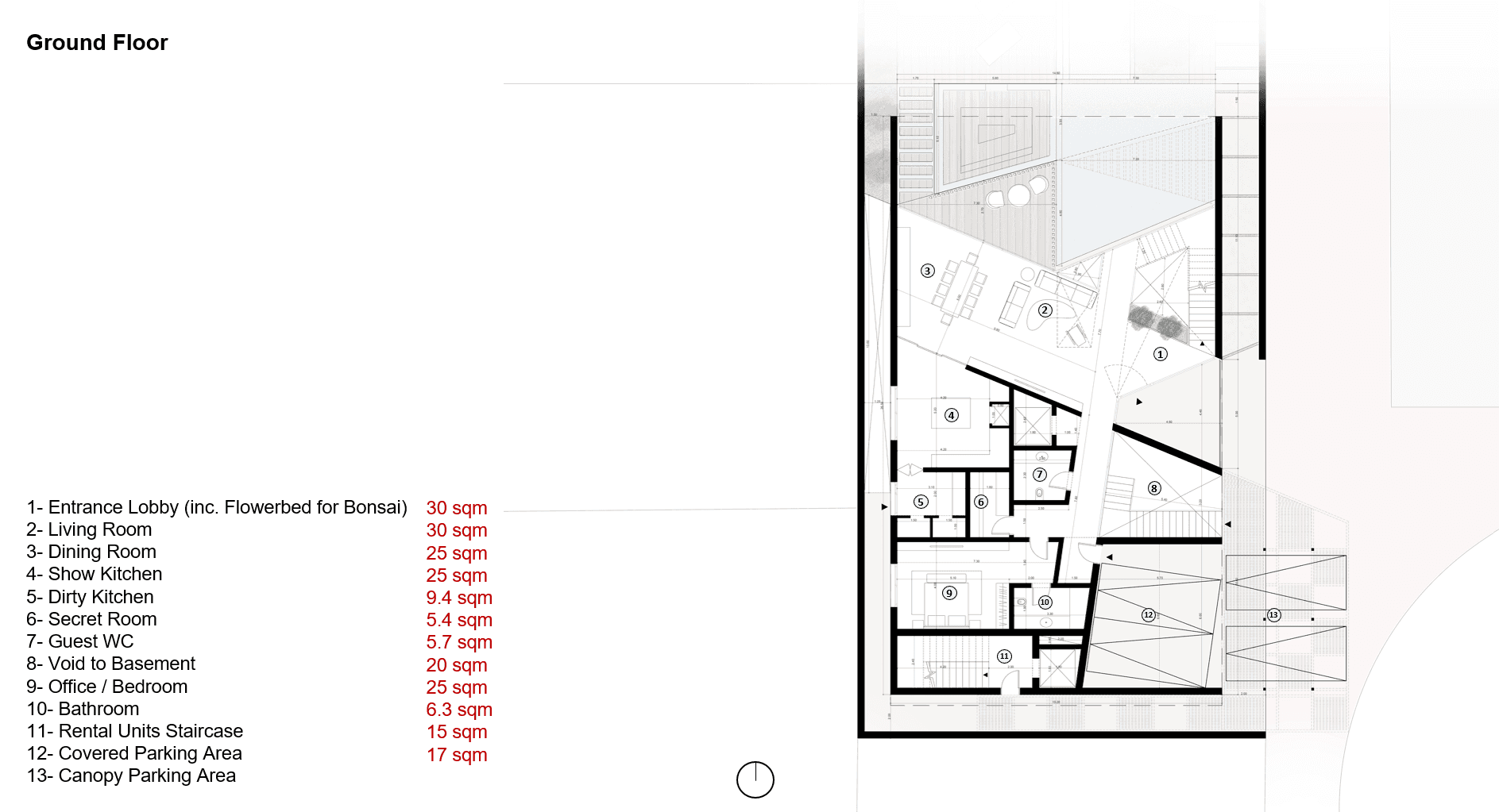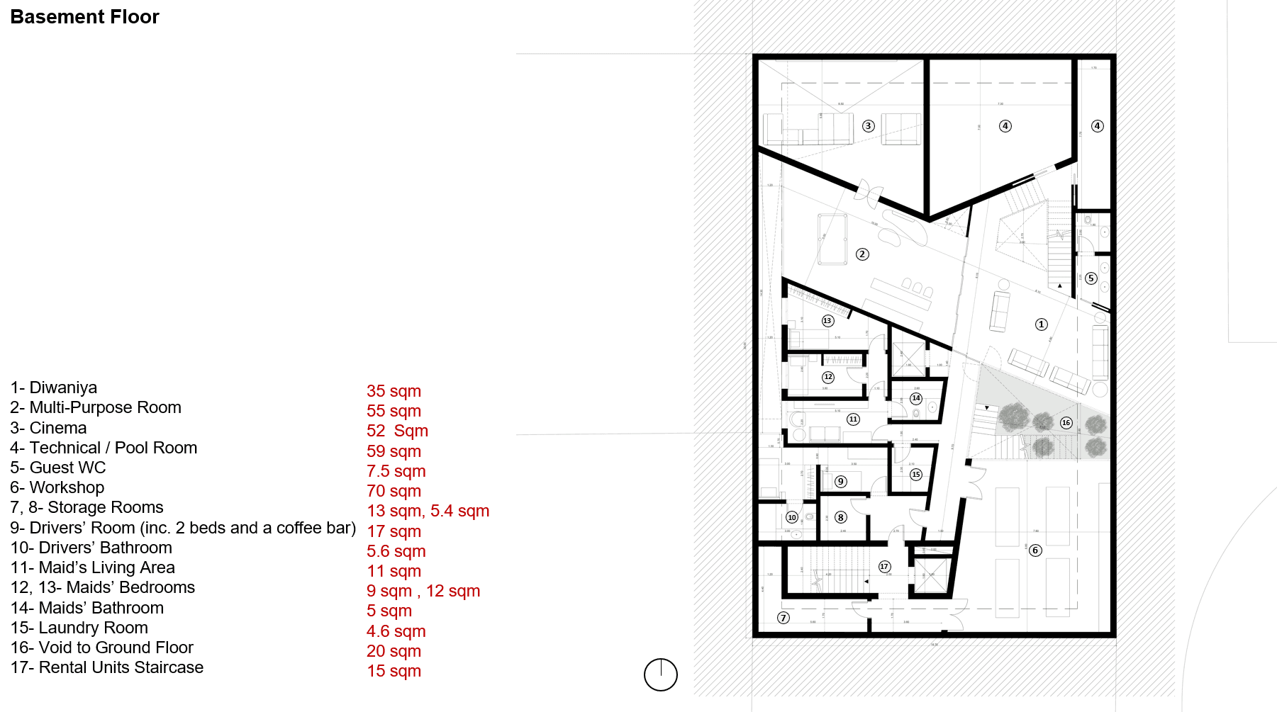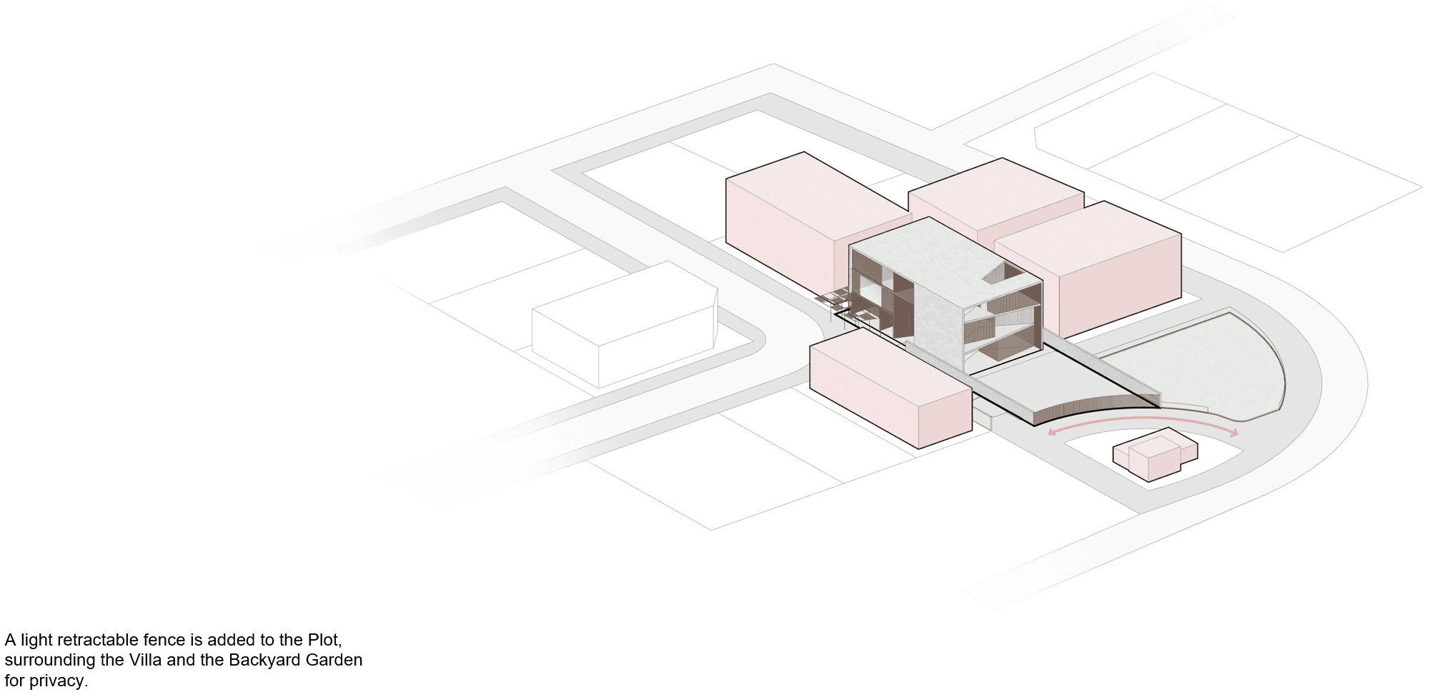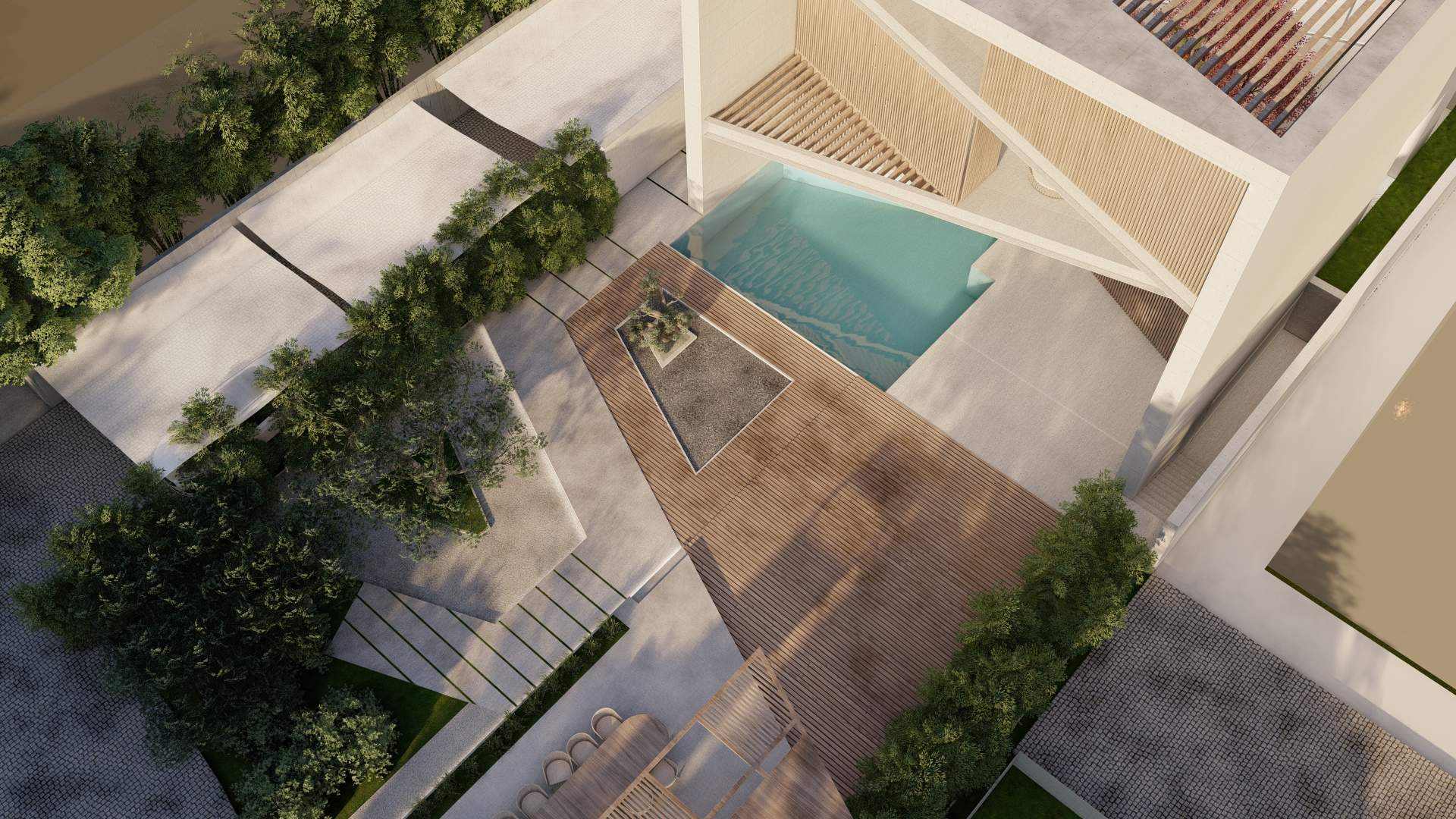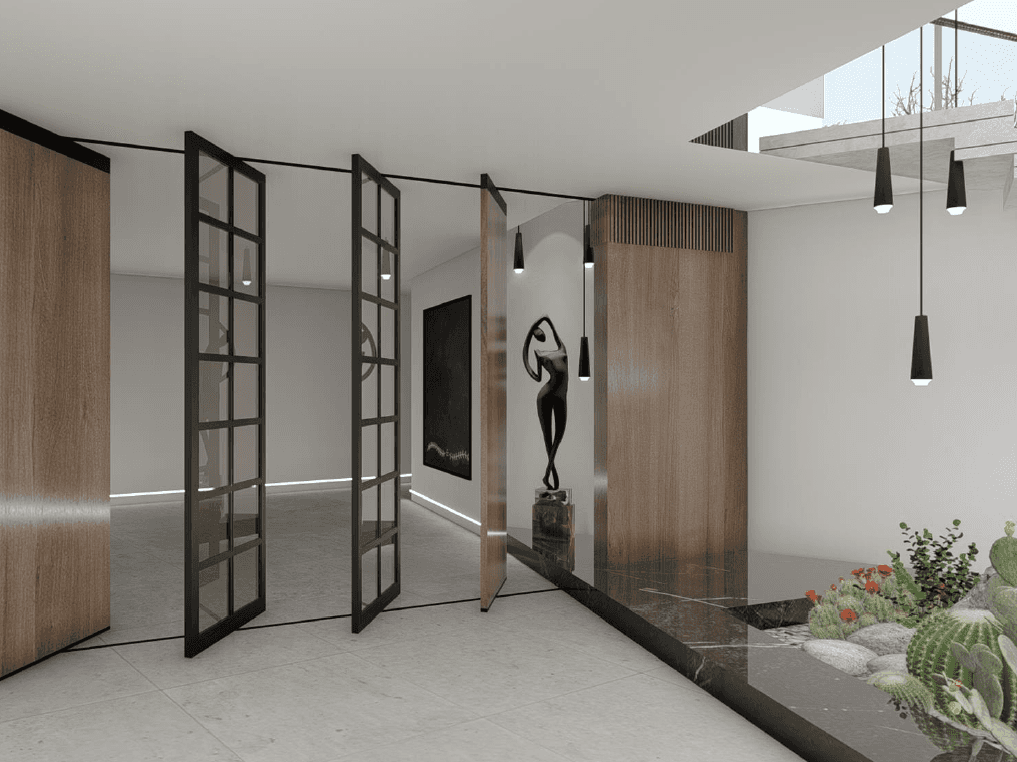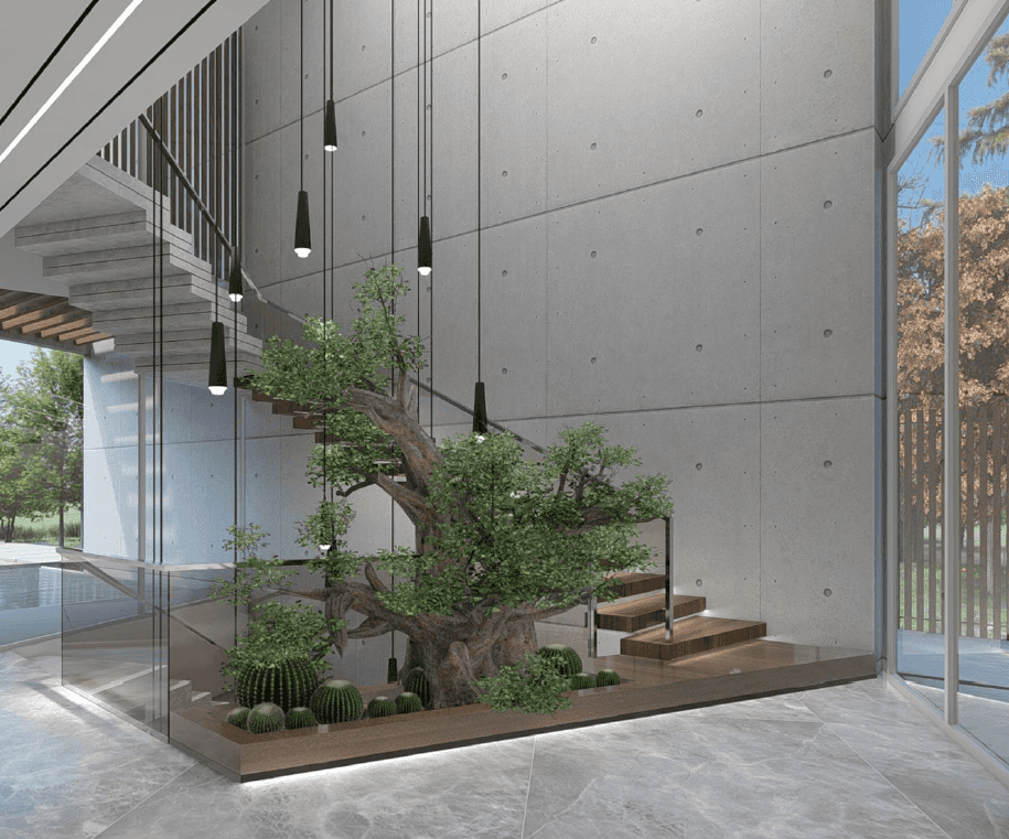 PS Residence in Kuwait presents a modern architectural design with its solid concrete box structure. Strategic cuts from this form produce distinctive angular facades that are fully glazed, creating a seamless connection between the interior and the landscape. These large glass areas allow natural light to flood the space and visually extend the living areas into the surroundings. The residence's bold geometric design and transparent surfaces embody contemporary living while enhancing its integration with the exterior environment.