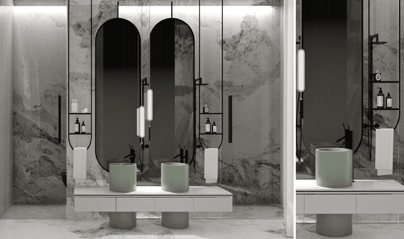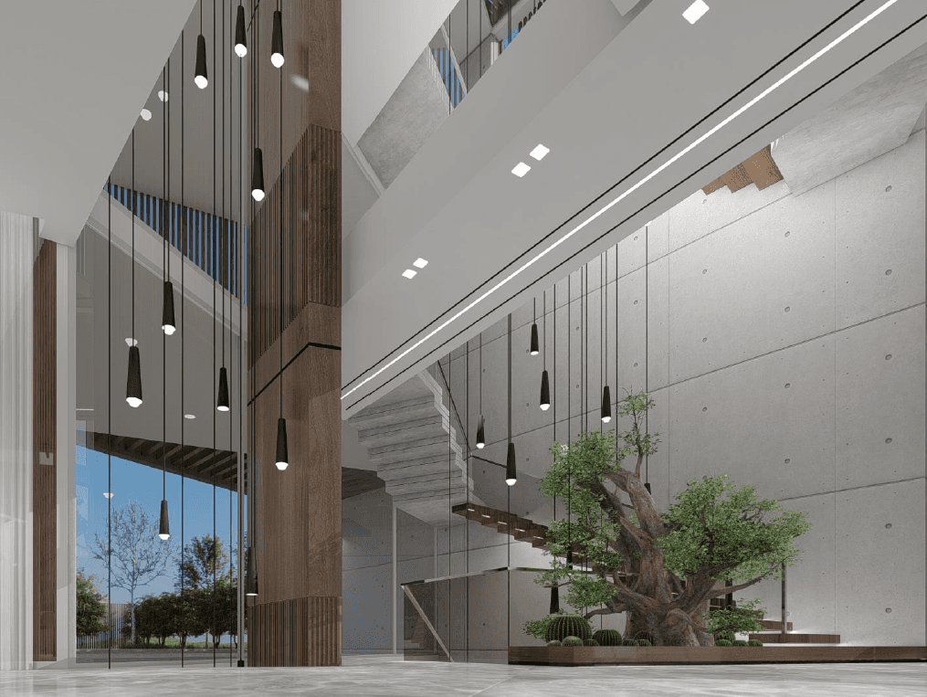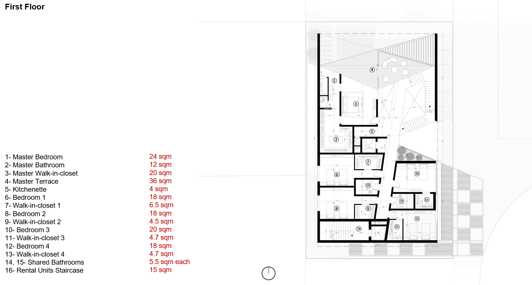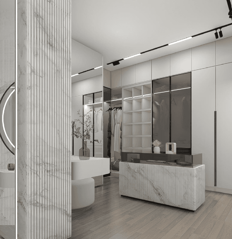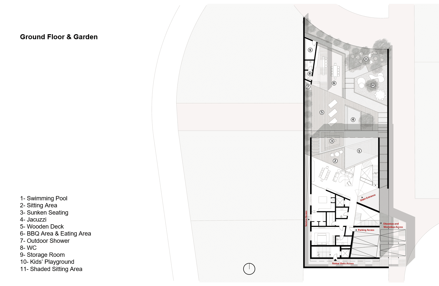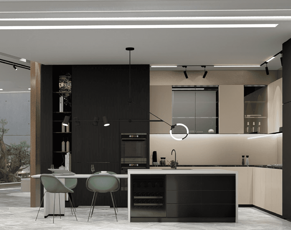 PS Residence in Kuwait presents a modern architectural design with its solid concrete box structure. Strategic cuts from this form produce distinctive angular facades that are fully glazed, creating a seamless connection between the interior and the landscape. These large glass areas allow natural light to flood the space and visually extend the living areas into the surroundings. The residence's bold geometric design and transparent surfaces embody contemporary living while enhancing its integration with the exterior environment.
