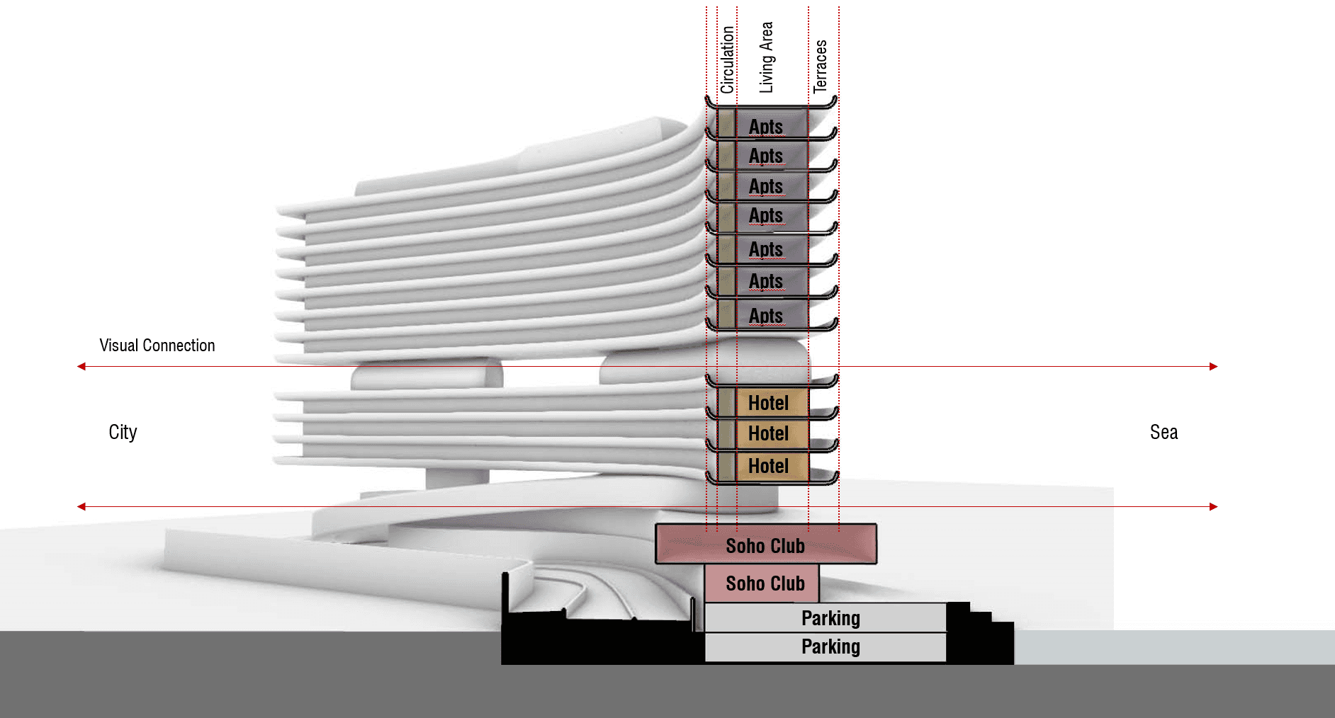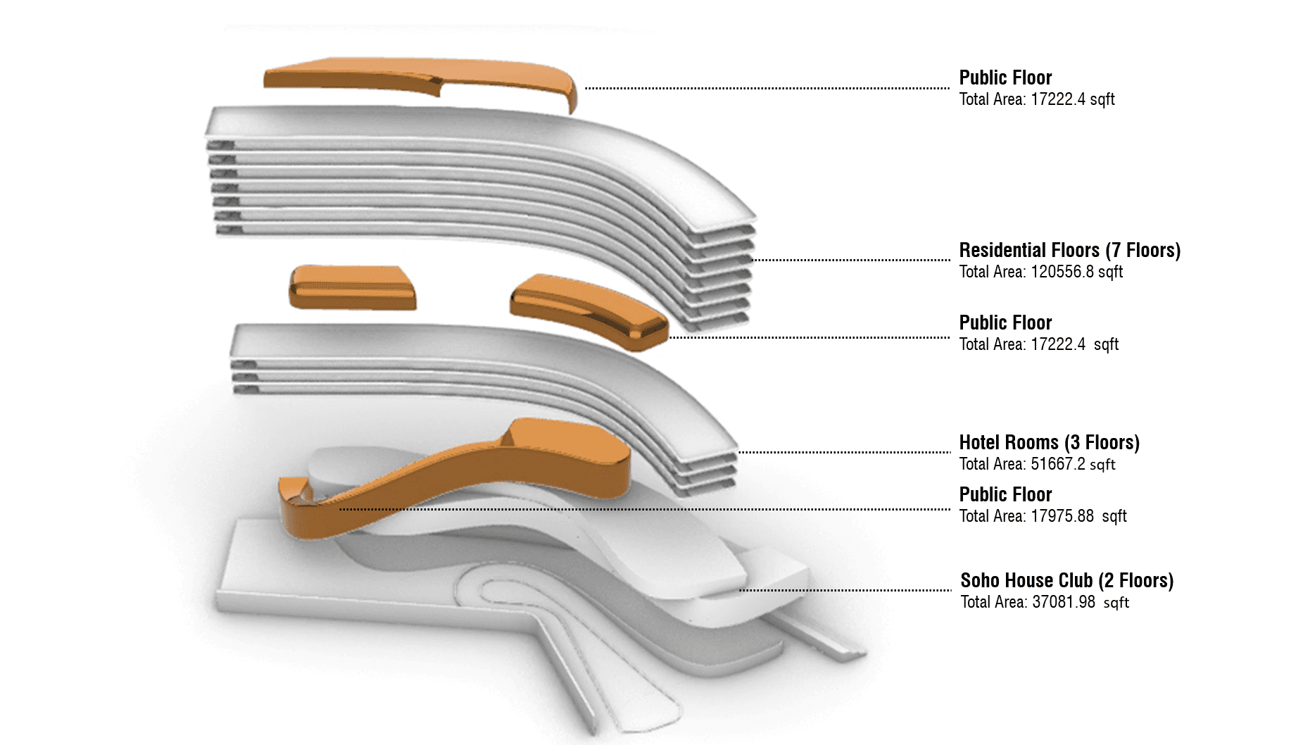 Located on the renowned Palm Jumeirah, Soho House offers a sophisticated integration of hotel, restaurant, and residential spaces. The design is inspired by the rhythmic patterns of the nearby sea, featuring a tripartite volume division that creates a seamless connection between distinct functional areas. Public pavilions on these division floors facilitate community interaction and maintain a continuous dialogue between the building and the surrounding sea.