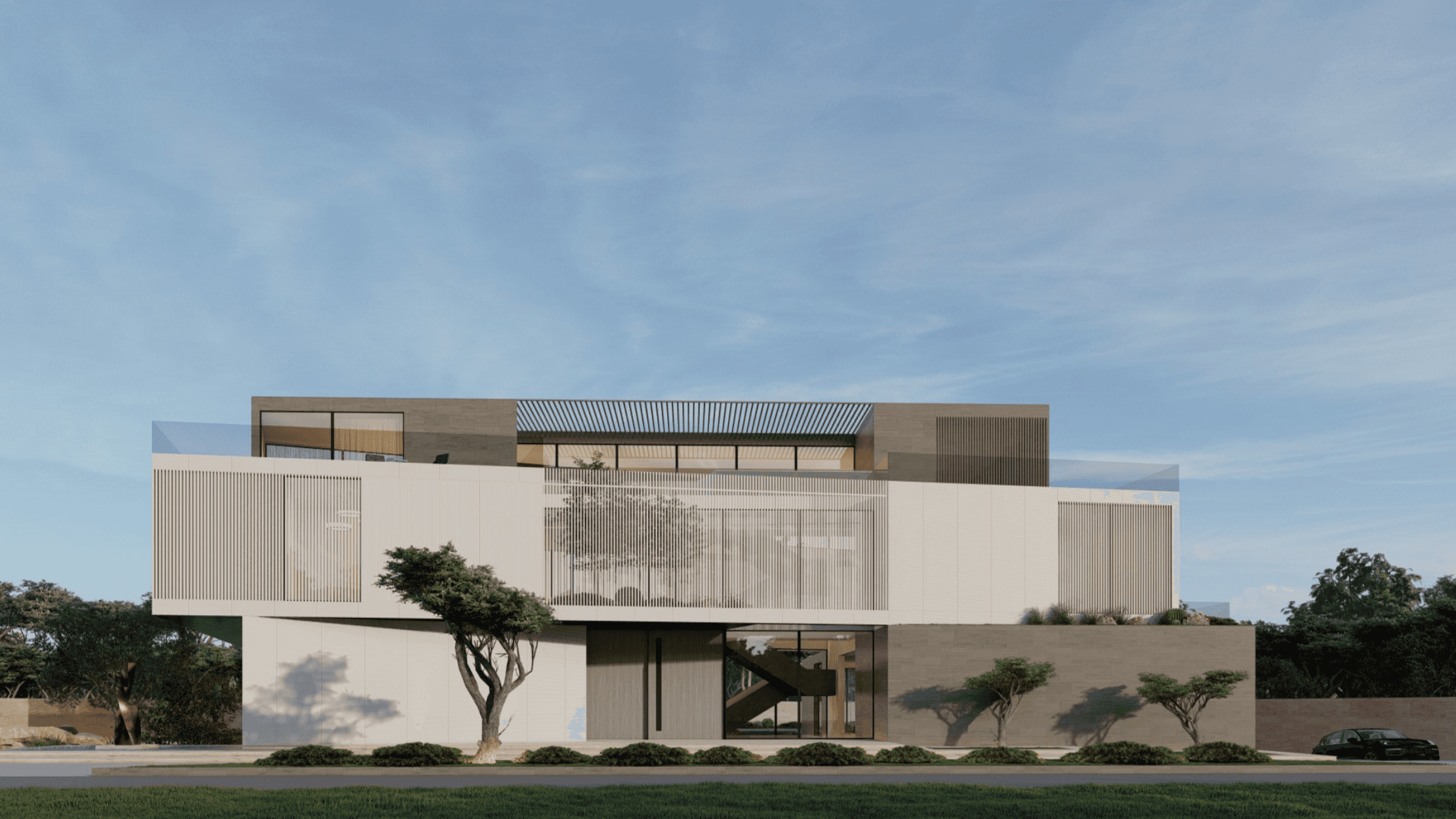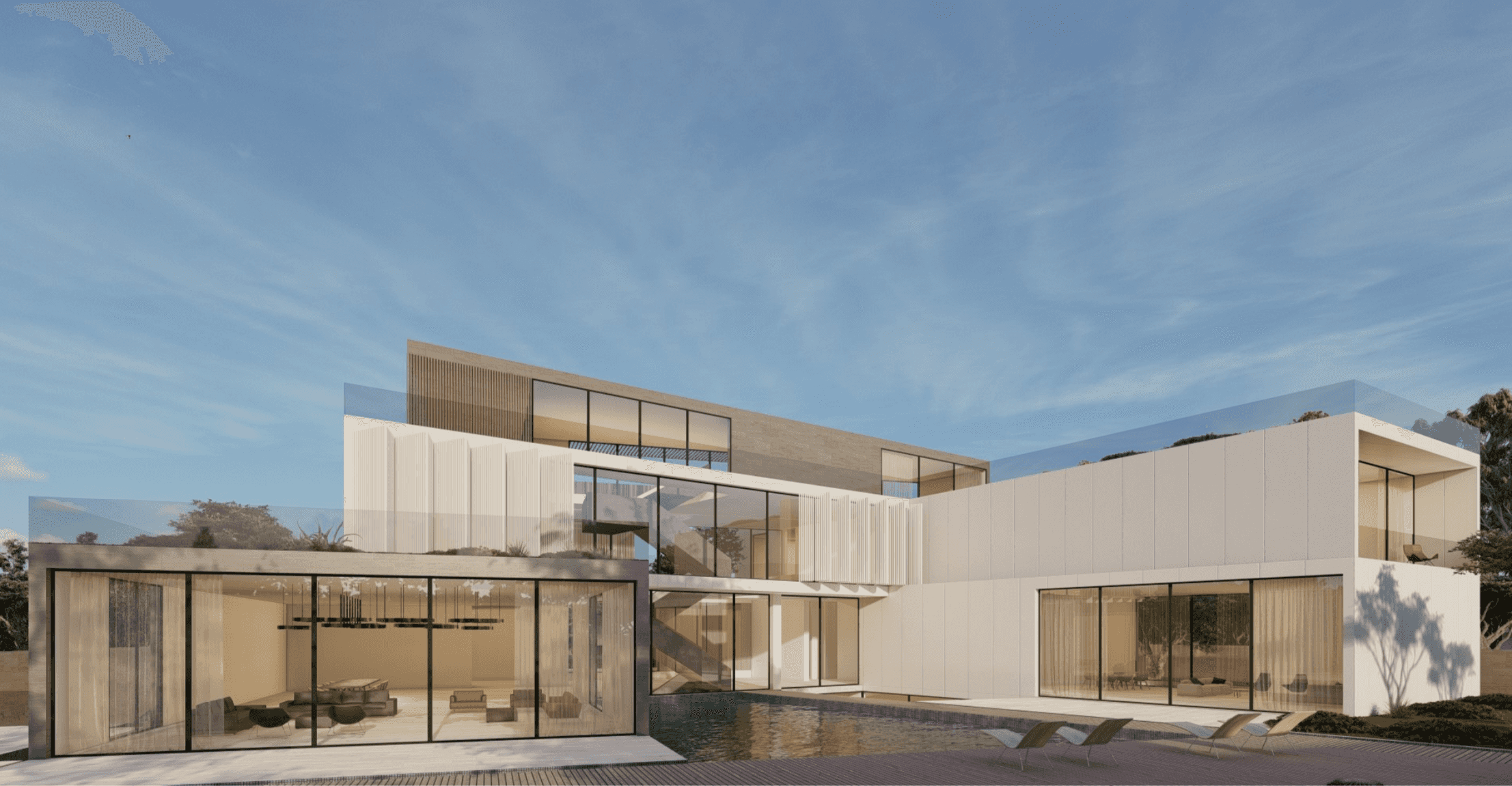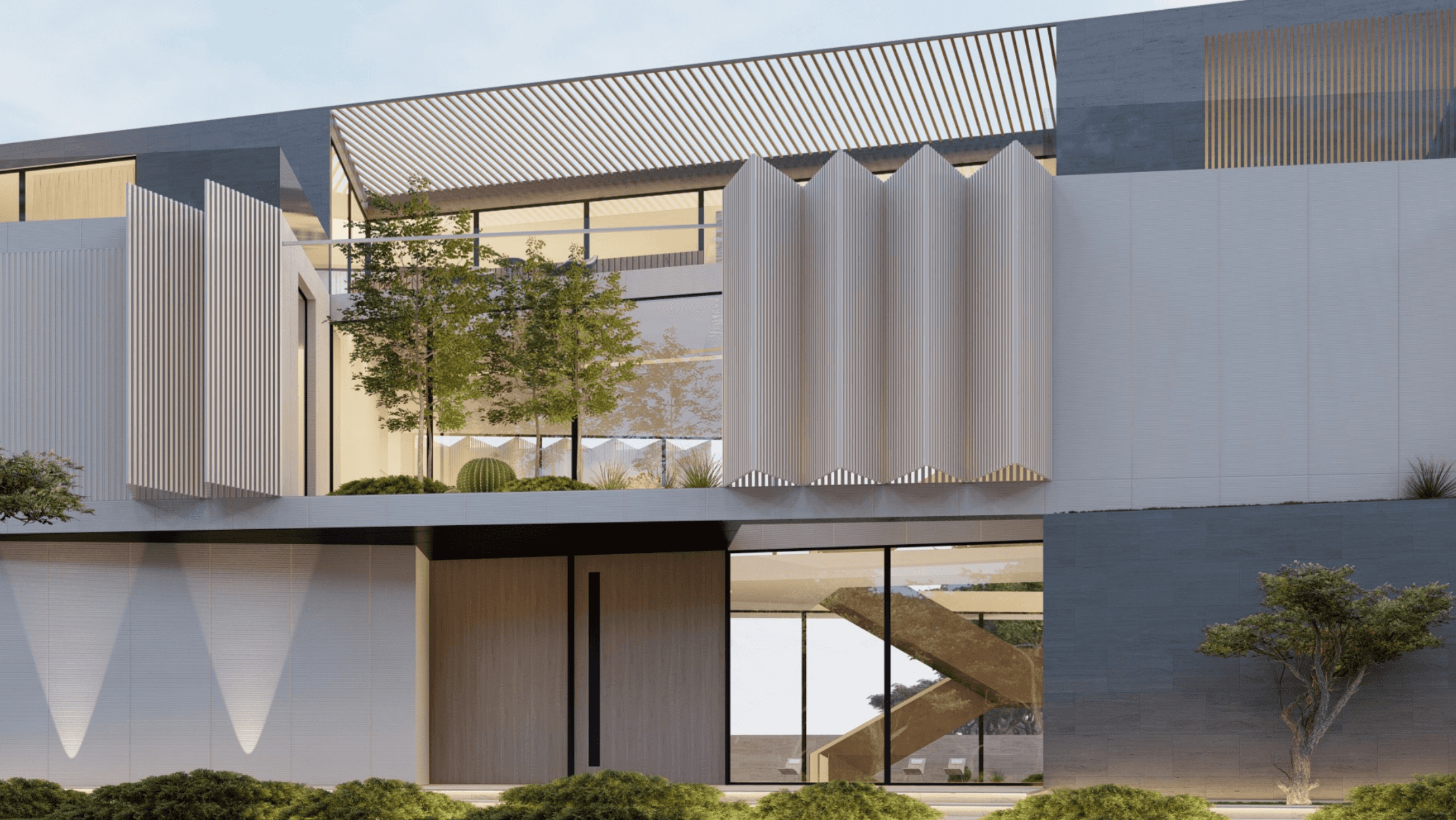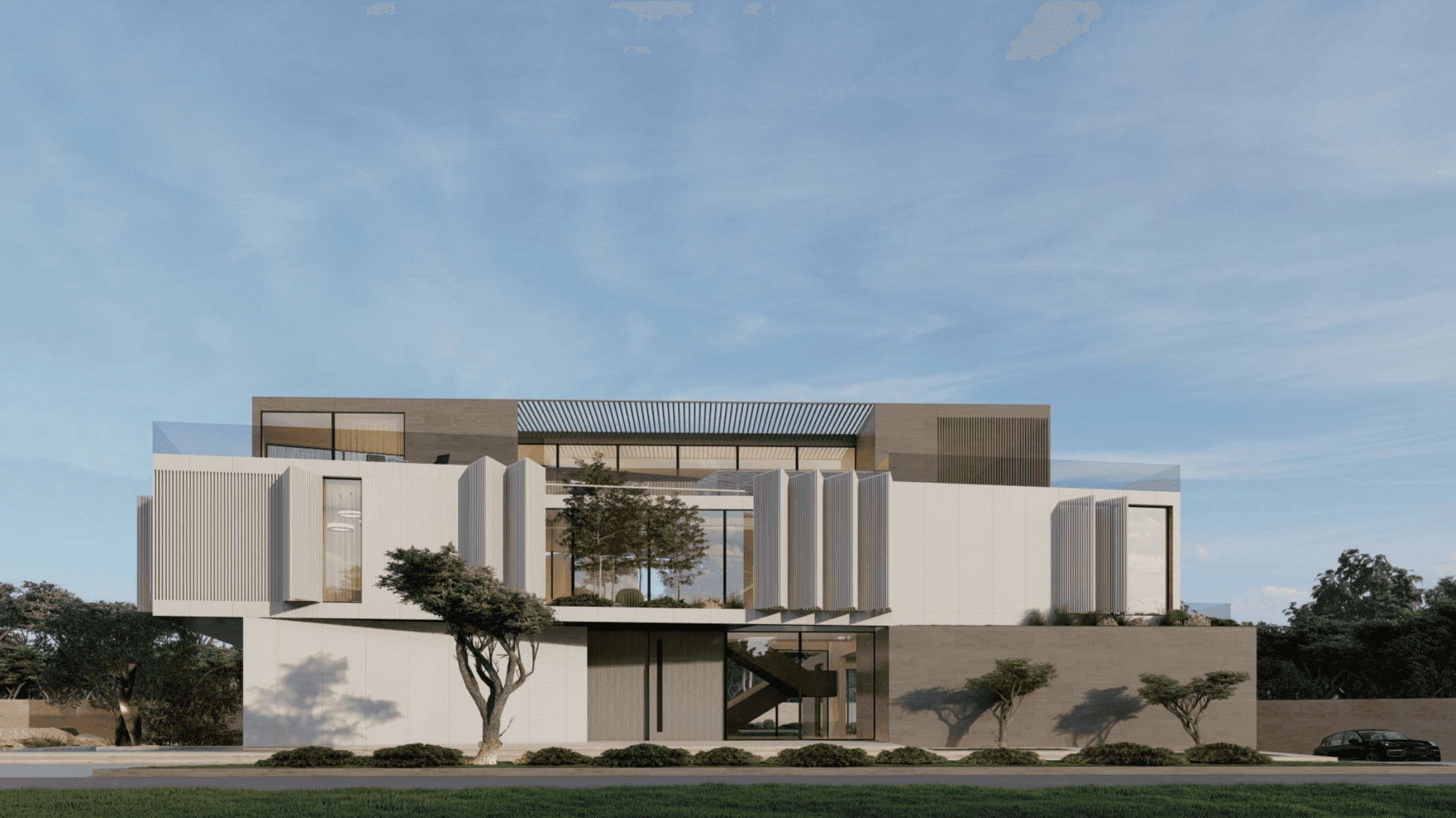 Located in Al Barari, Z Signature Villa features a series of separate pavilions arranged around a central pool courtyard. The villa includes a basement, ground floor, first floor, and a large rooftop, forming a unified design.