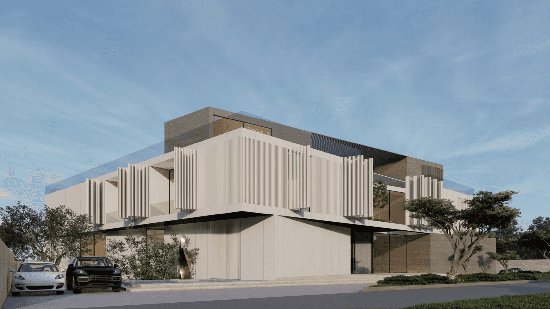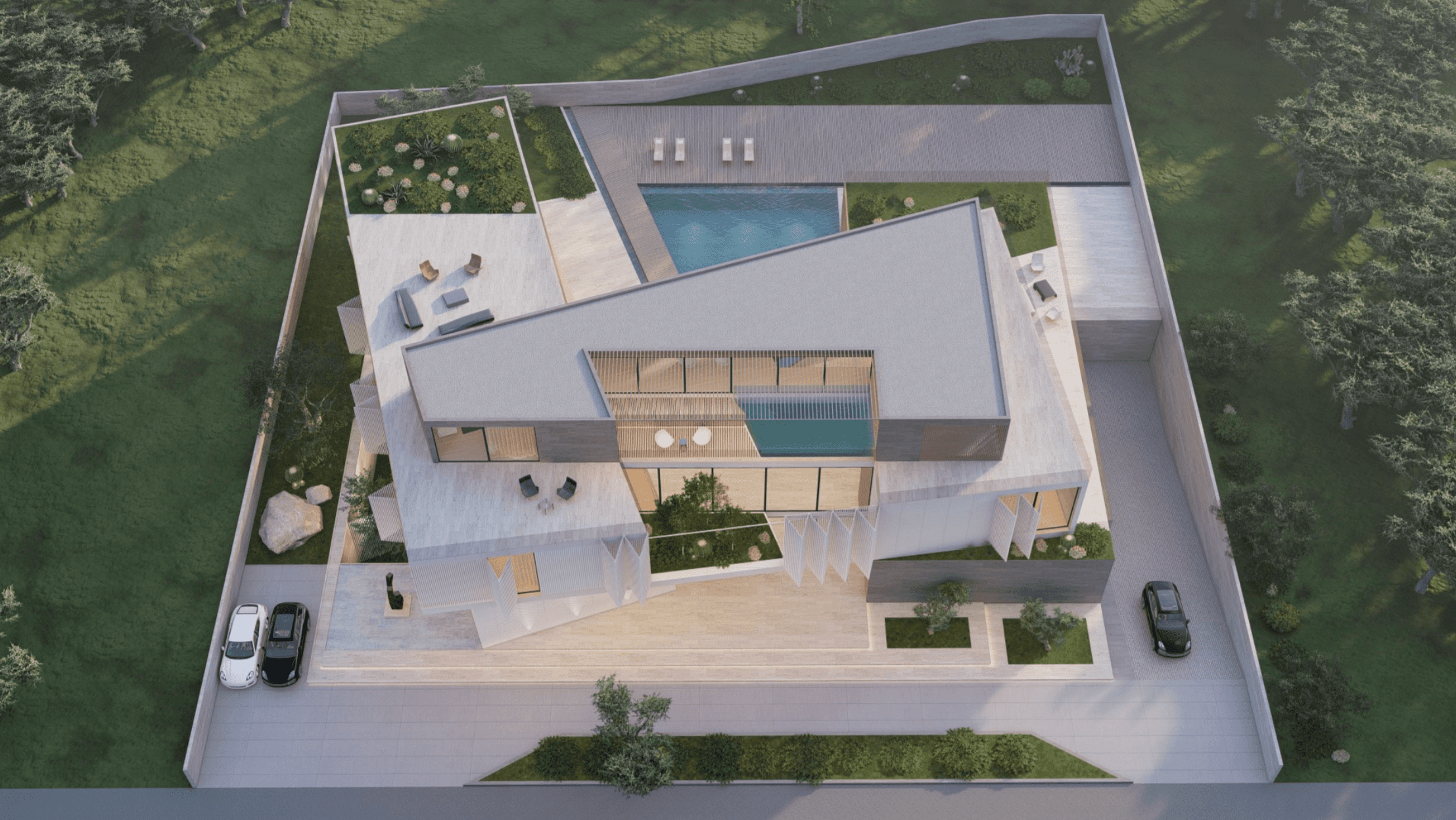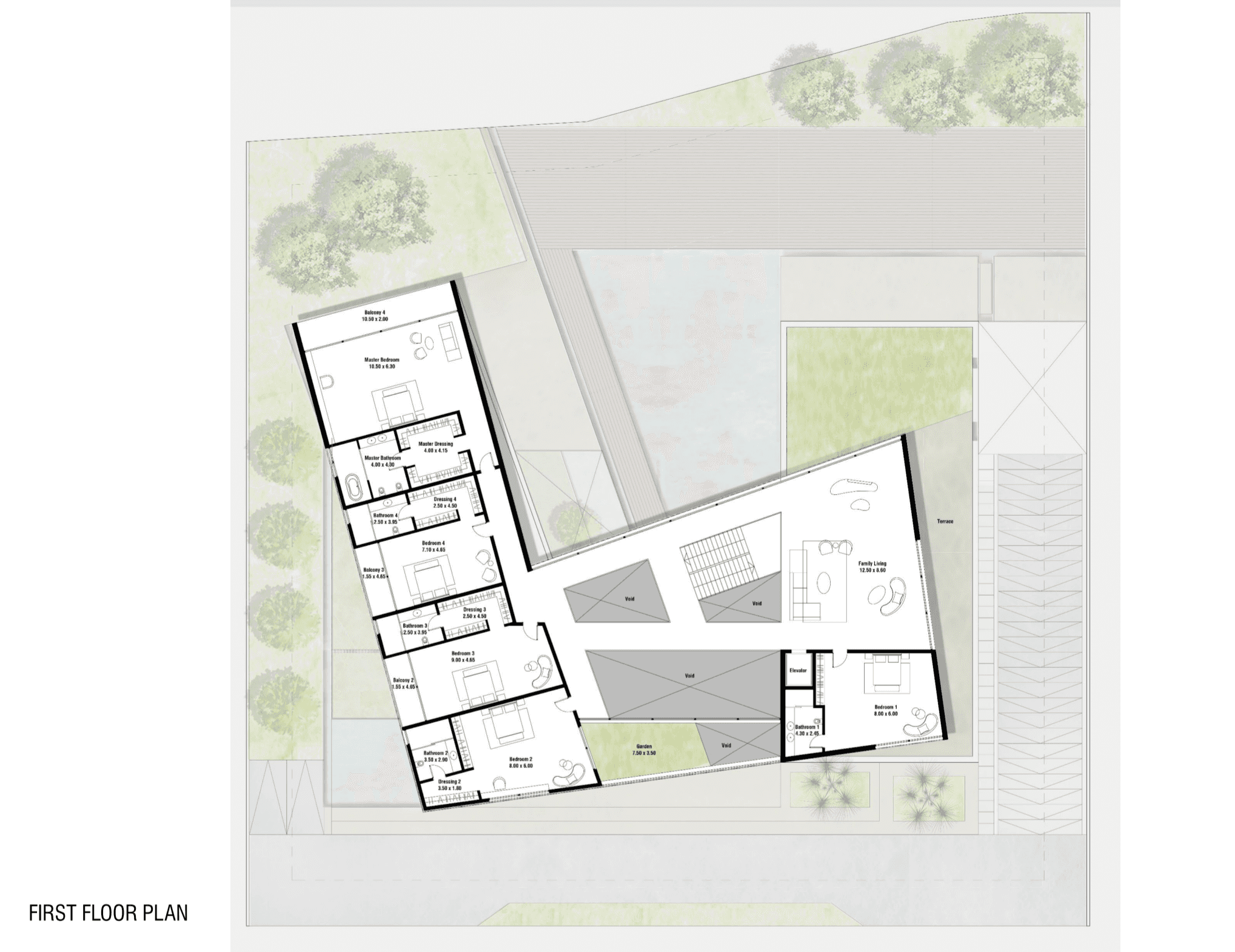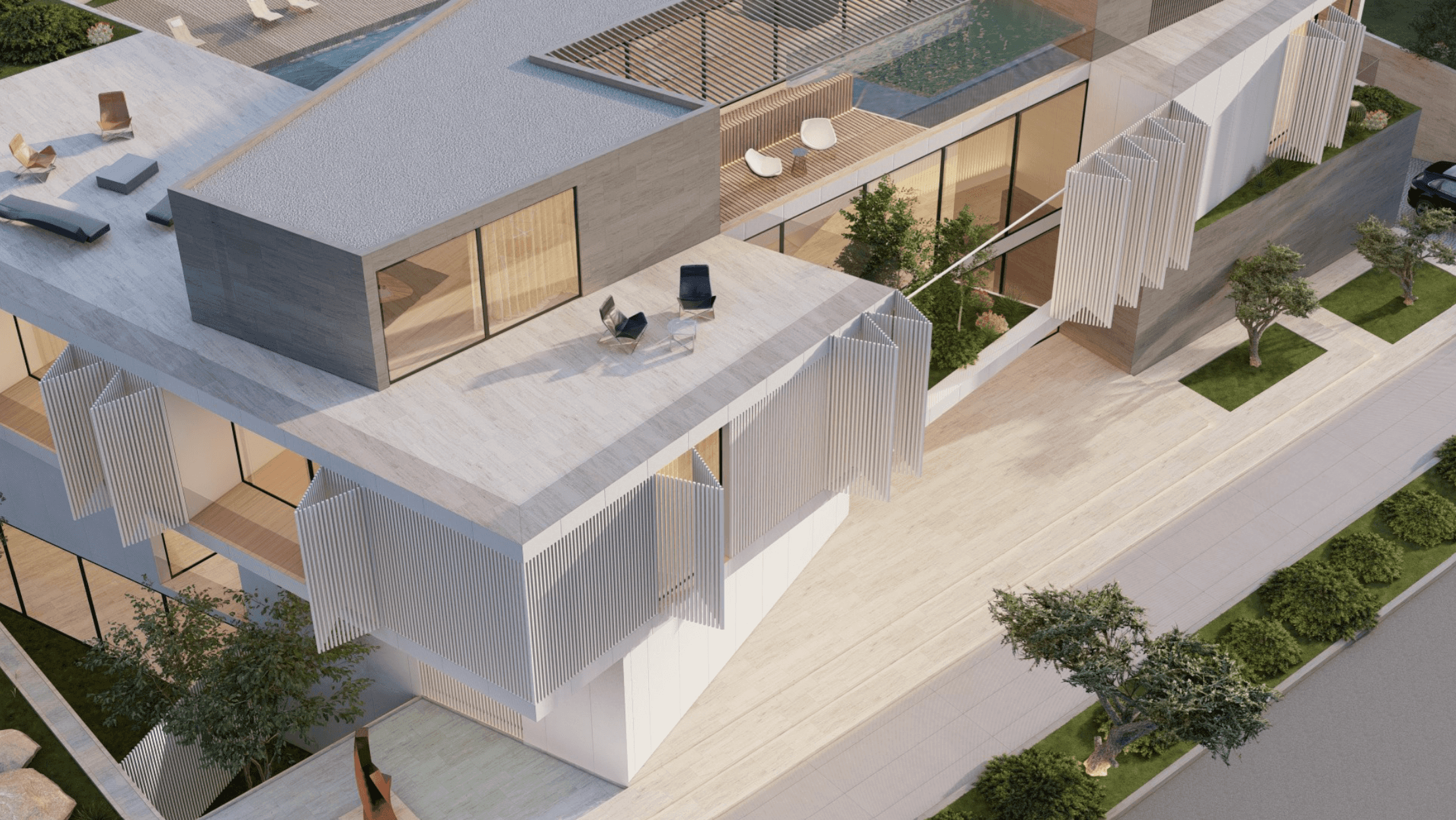 Located in Al Barari, Z Signature Villa features a series of separate pavilions arranged around a central pool courtyard. The villa includes a basement, ground floor, first floor, and a large rooftop, forming a unified design.