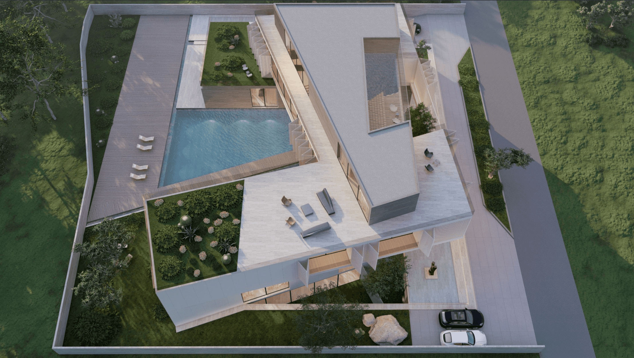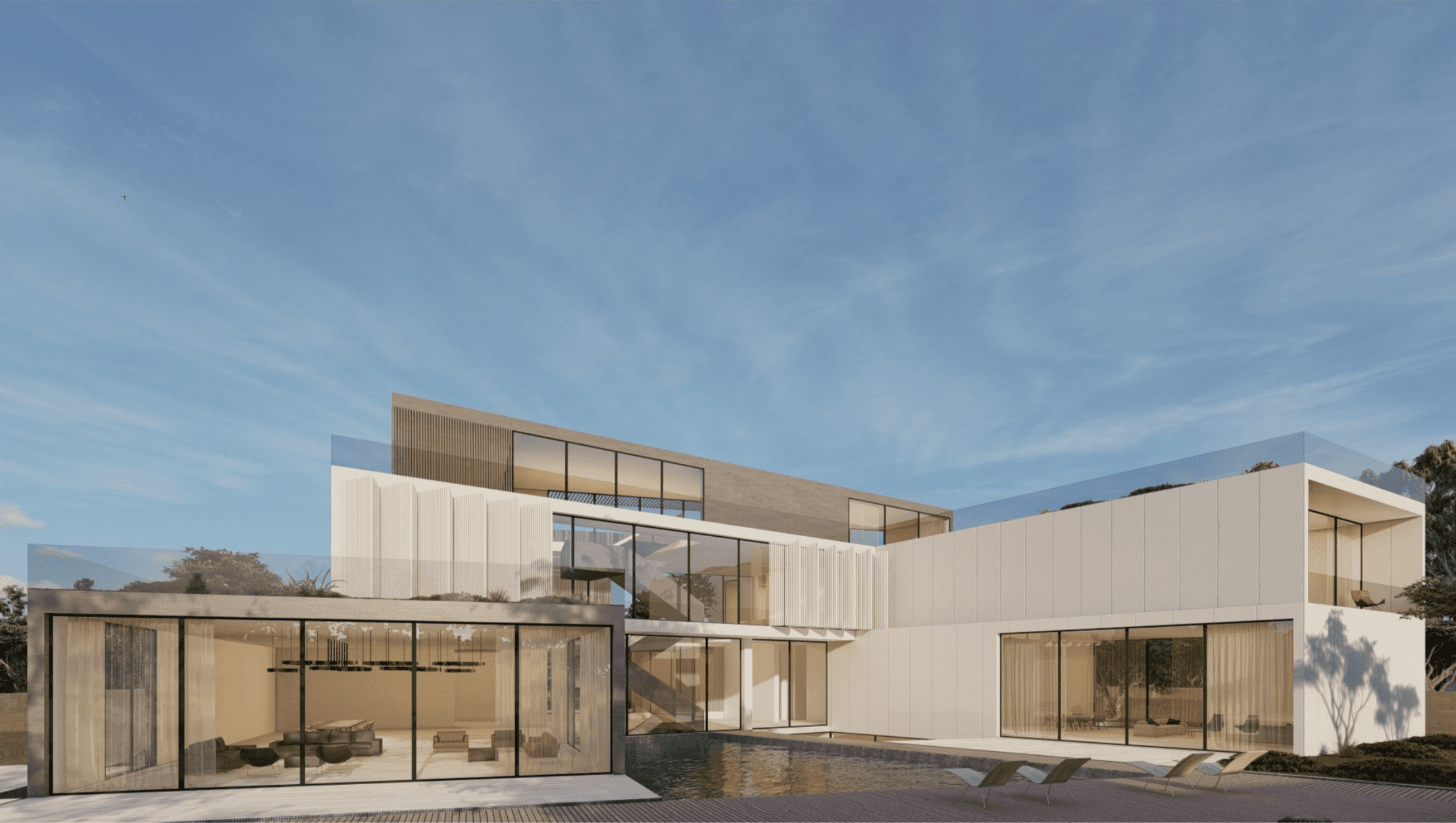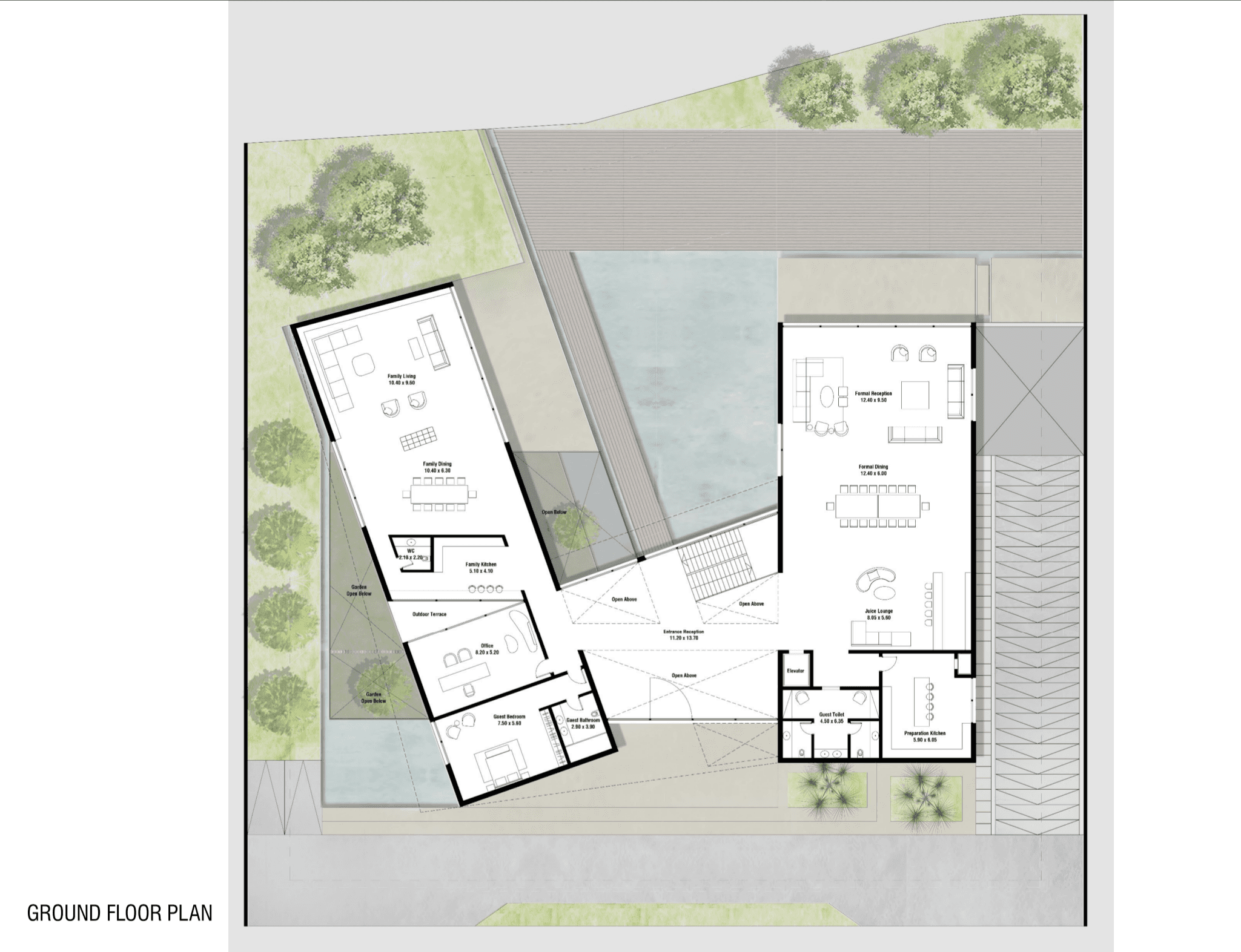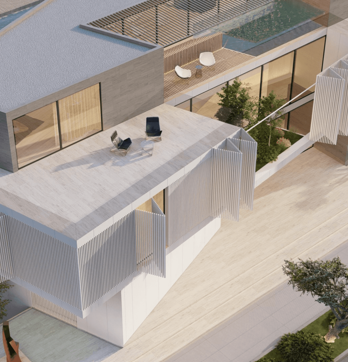 Each pavilion is designated for a particular purpose, all centering around the central courtyard with a prominent water feature. The ground and first floors combine private and shared spaces, the basement offers practical areas, and the rooftop provides sweeping views of the surroundings.