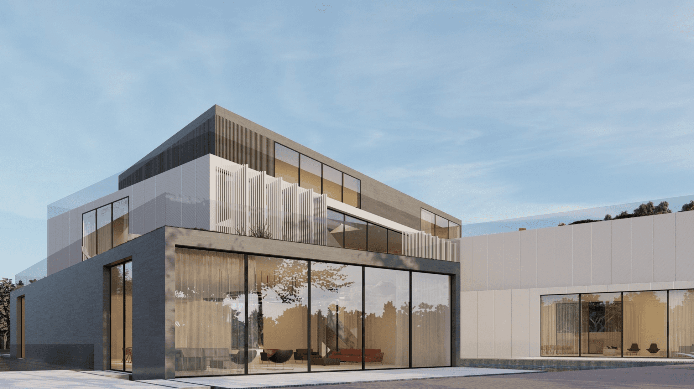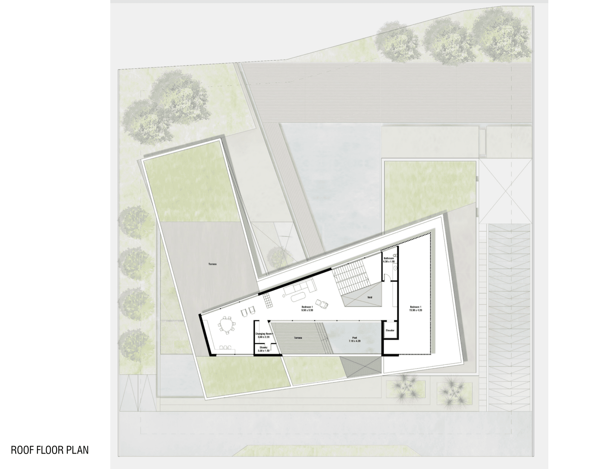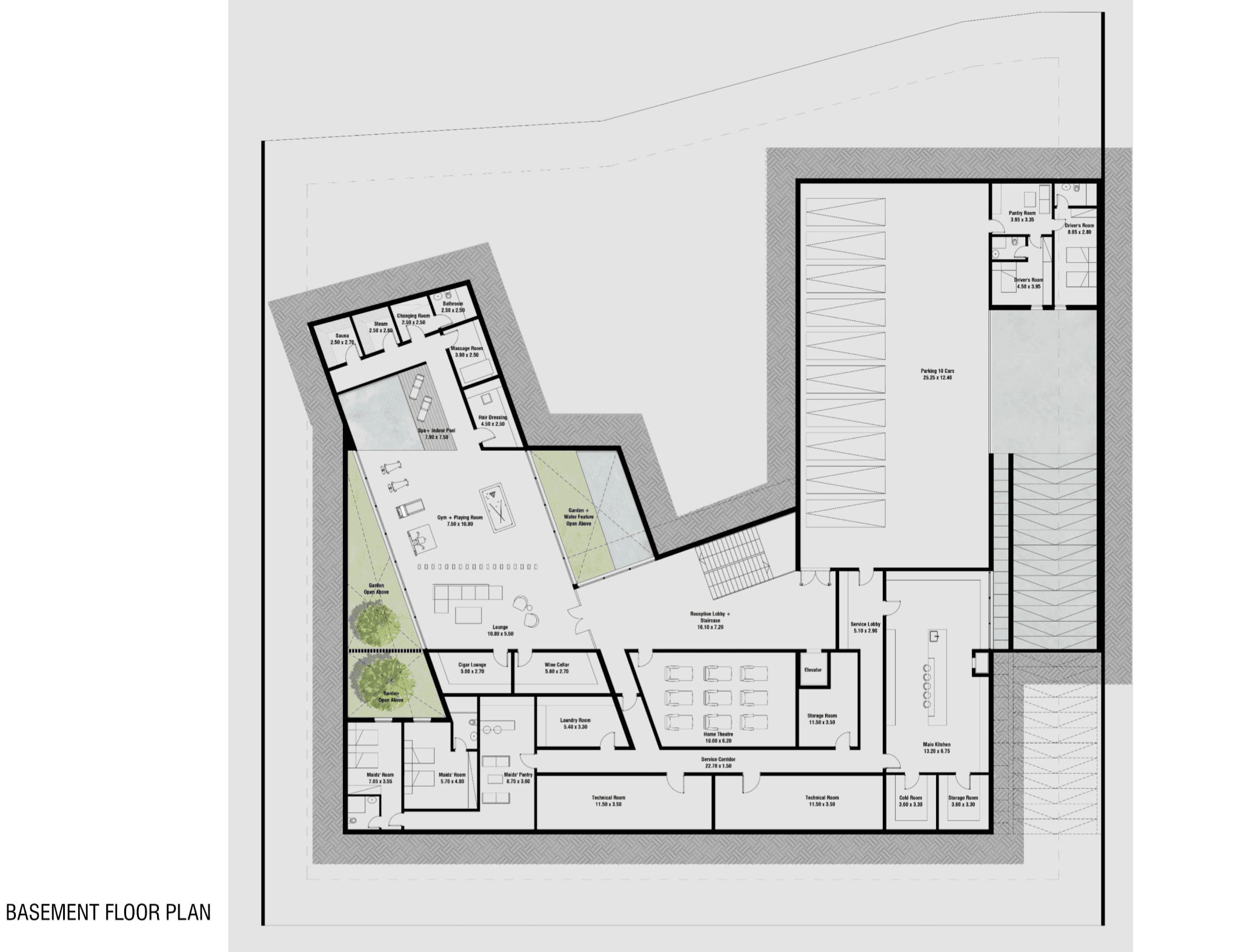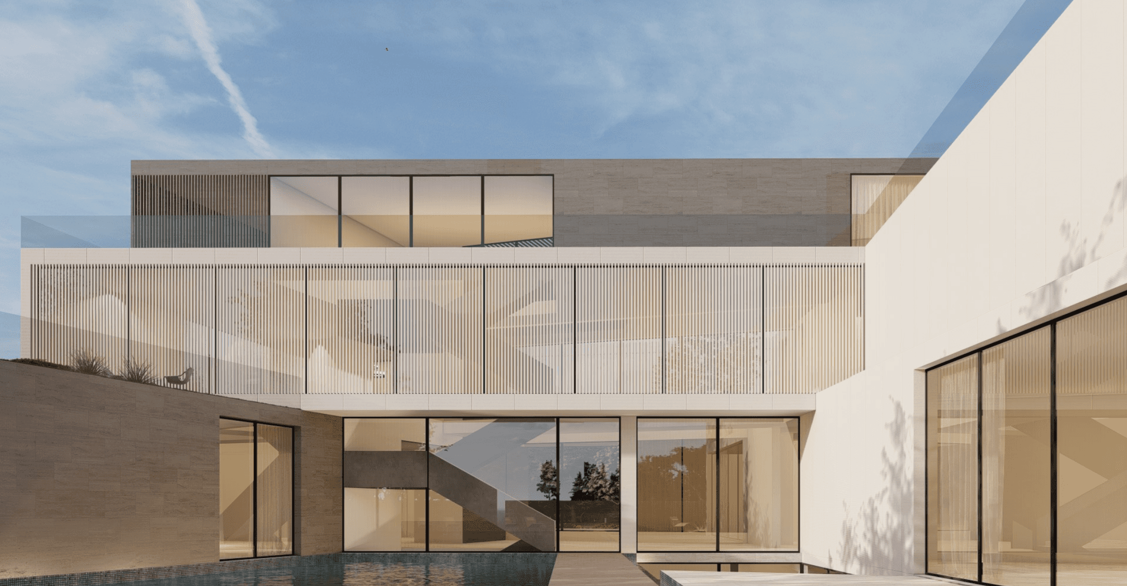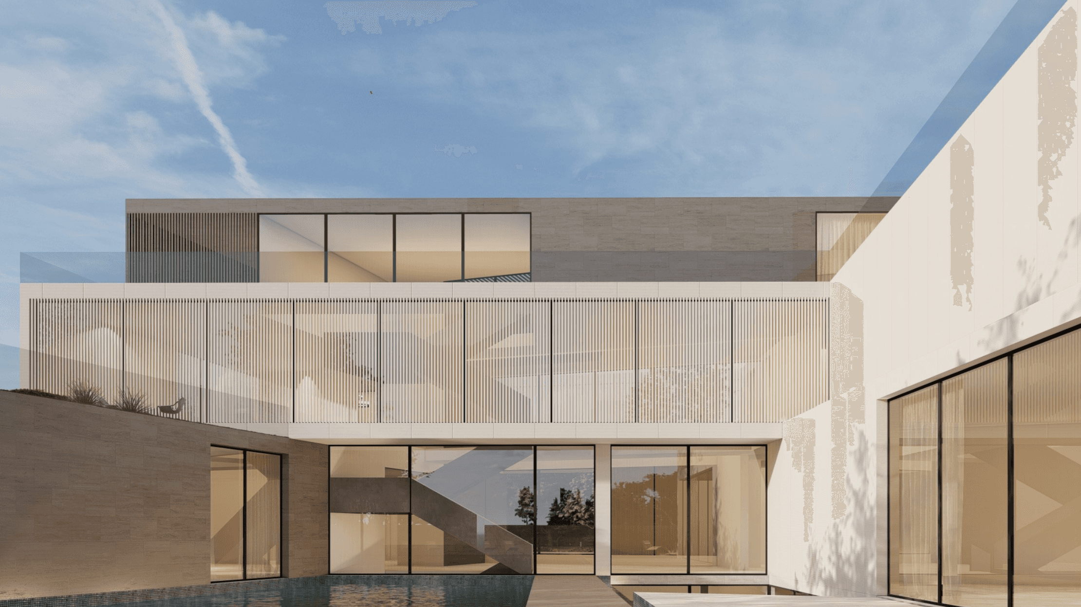 Each pavilion is designated for a particular purpose, all centering around the central courtyard with a prominent water feature. The ground and first floors combine private and shared spaces, the basement offers practical areas, and the rooftop provides sweeping views of the surroundings.
