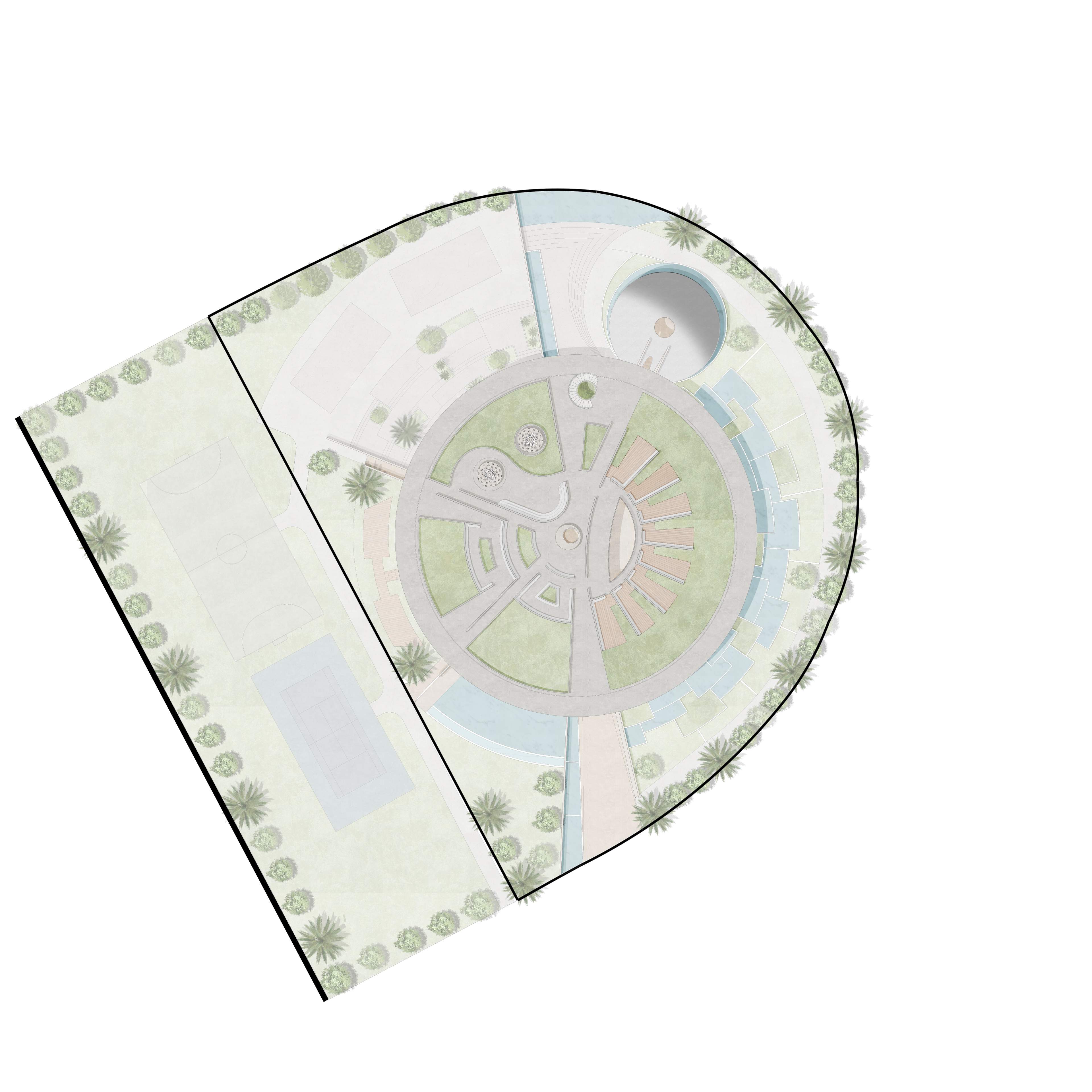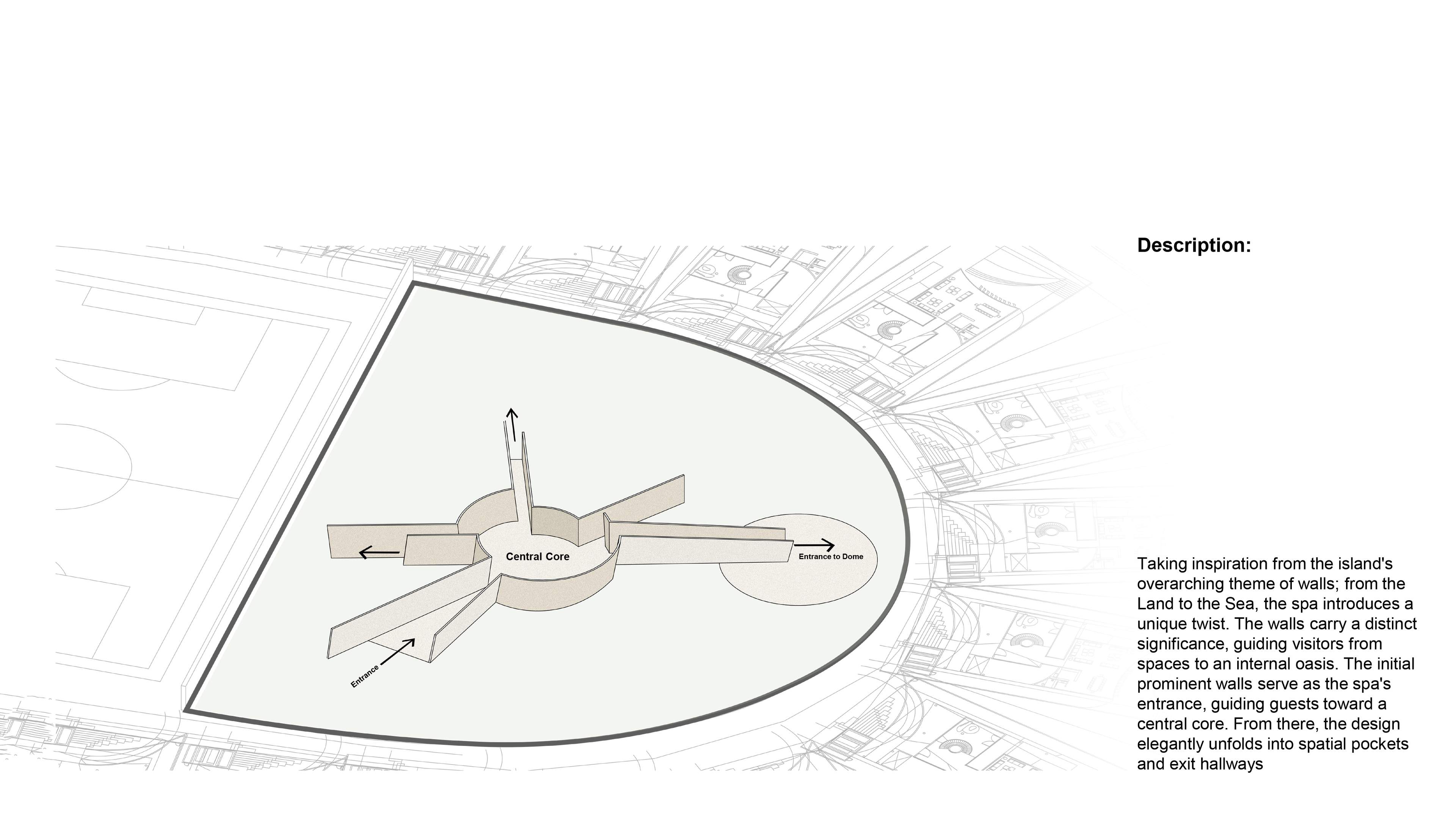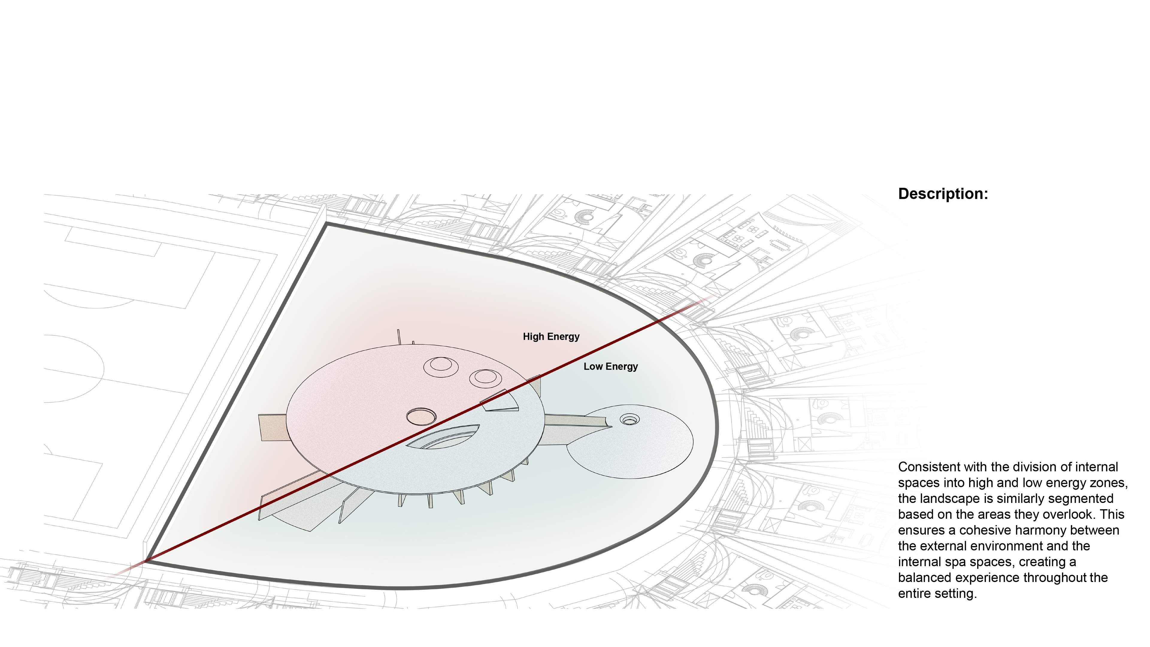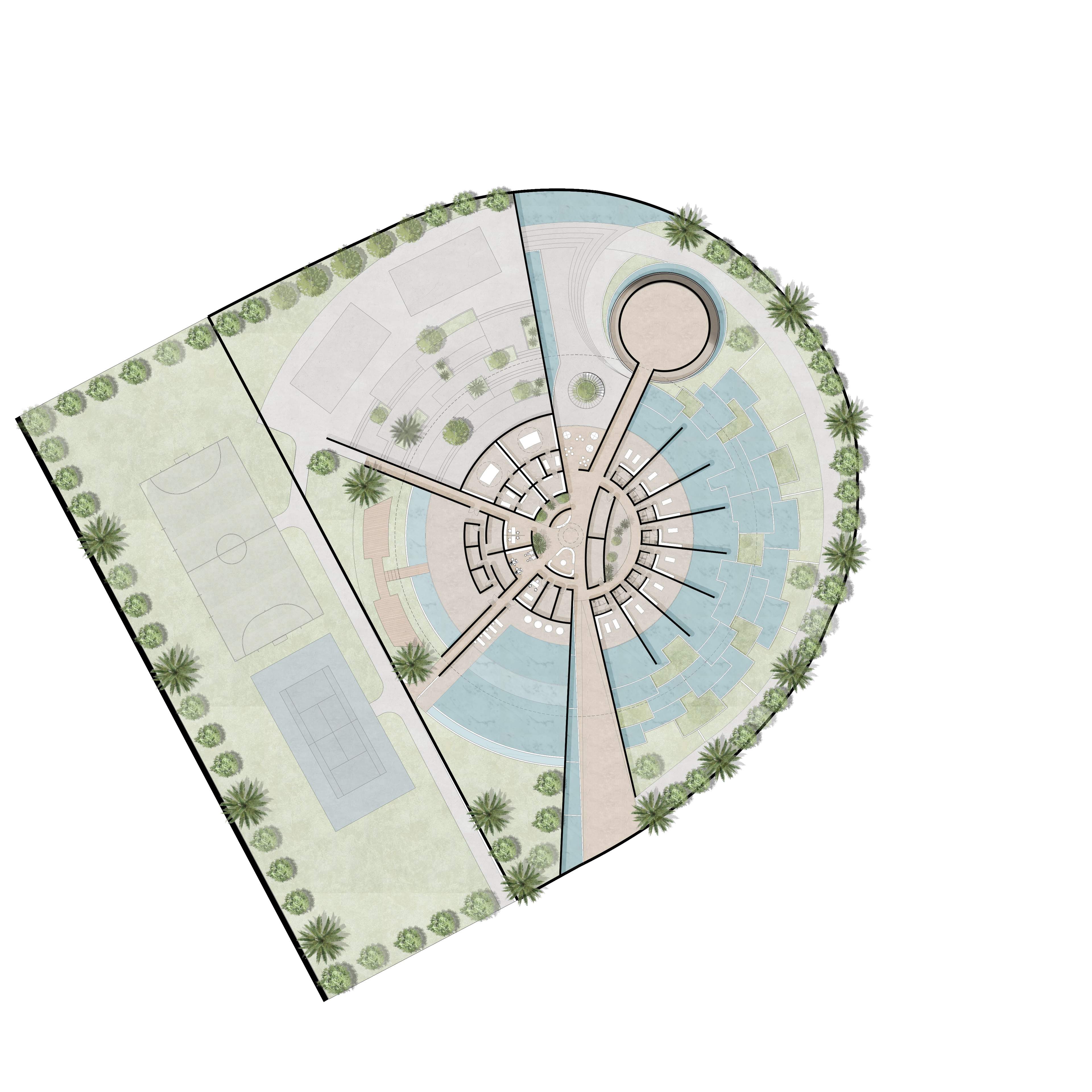 Zuha Island Spa, nestled in the heart of Zuha Island, is a harmonious blend of tradition and futurism. Surrounded by residential villas and a Back of House area to the southwest, the spa transforms its inward-facing plot into a tranquil oasis. Inspired by the island's theme of walls, the spa's design guides visitors through a series of prominent entrance walls into a central core, leading to serene spatial pockets. A dome and disk-like roof, with strategically placed skylights, diffuse natural light, creating a sacred ambiance. The spa is divided into low-energy and high-energy sections, providing acoustic and energy separation. The landscape mirrors this division, with serene water features and lush greenery in the low-energy zone, and dynamic activity fields in the high-energy zone, ensuring a balanced and immersive experience.