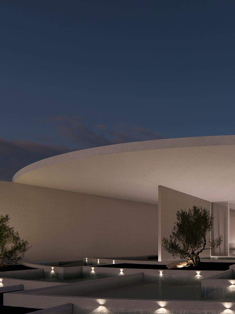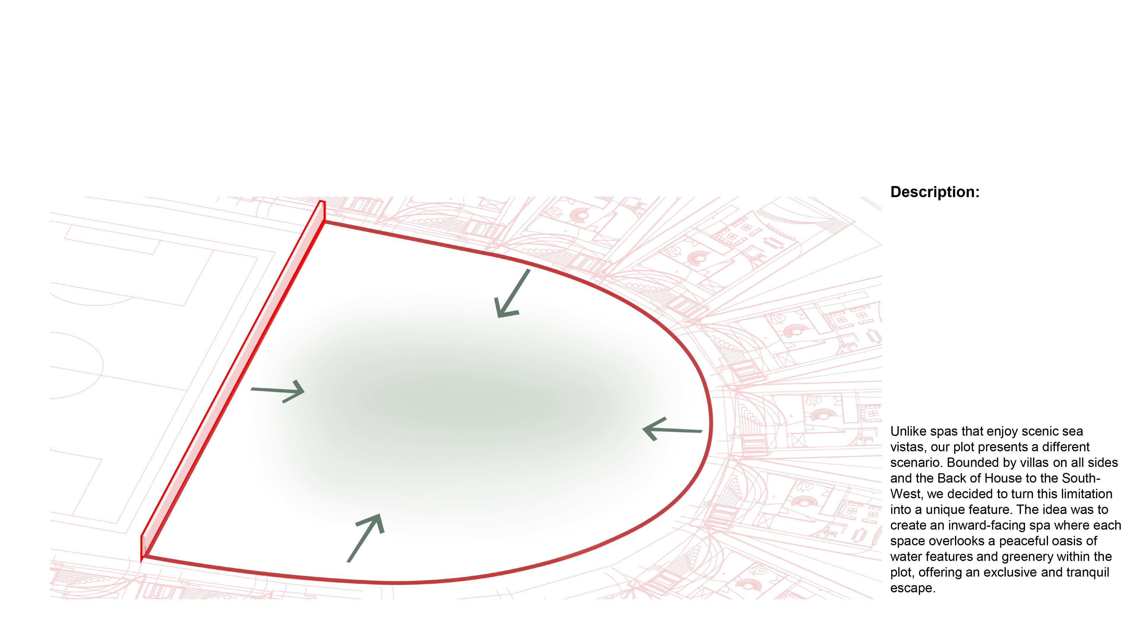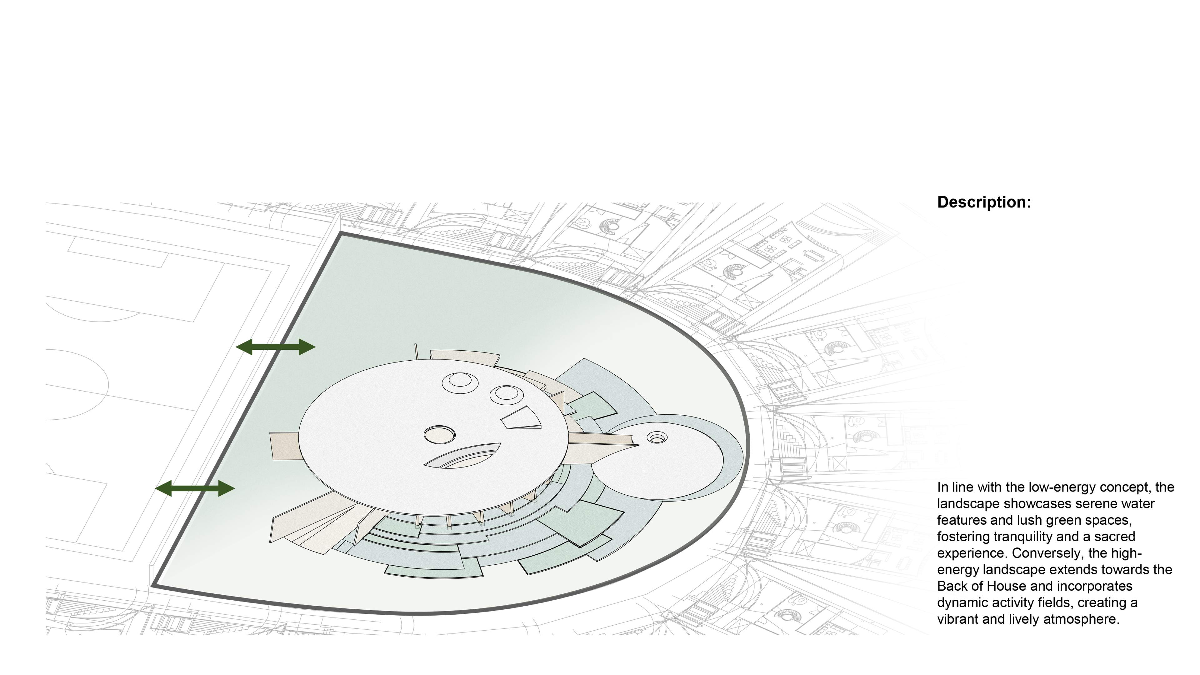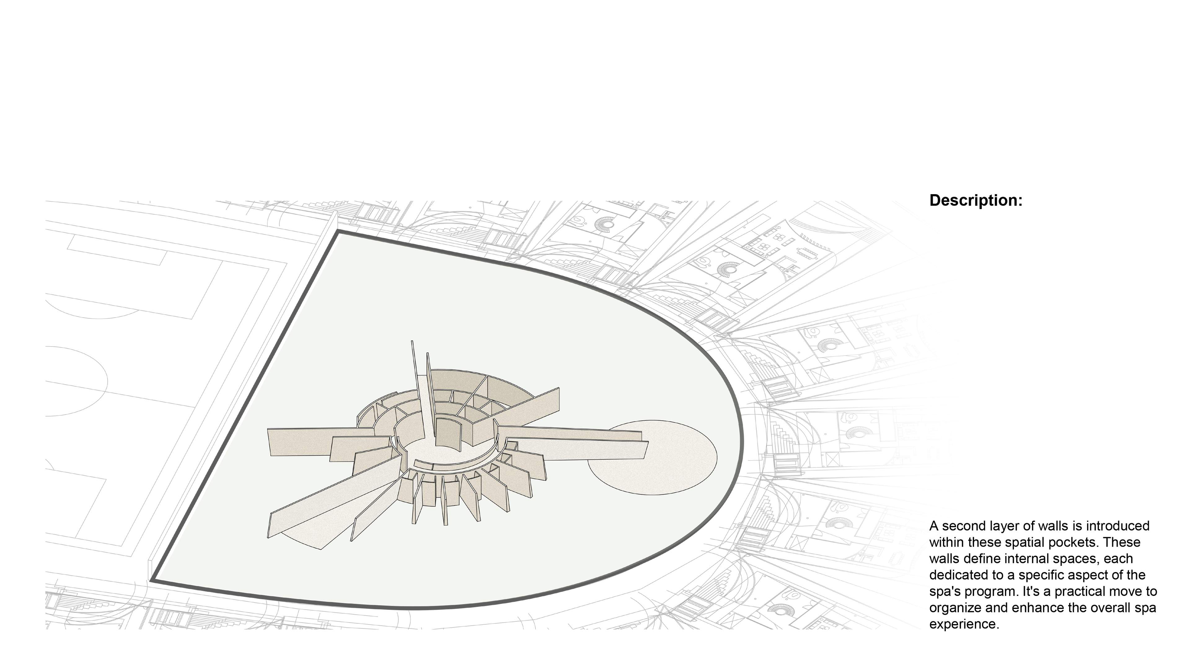 Zuha Island Spa, nestled in the heart of Zuha Island, is a harmonious blend of tradition and futurism. Surrounded by residential villas and a Back of House area to the southwest, the spa transforms its inward-facing plot into a tranquil oasis. Inspired by the island's theme of walls, the spa's design guides visitors through a series of prominent entrance walls into a central core, leading to serene spatial pockets. A dome and disk-like roof, with strategically placed skylights, diffuse natural light, creating a sacred ambiance. The spa is divided into low-energy and high-energy sections, providing acoustic and energy separation. The landscape mirrors this division, with serene water features and lush greenery in the low-energy zone, and dynamic activity fields in the high-energy zone, ensuring a balanced and immersive experience.