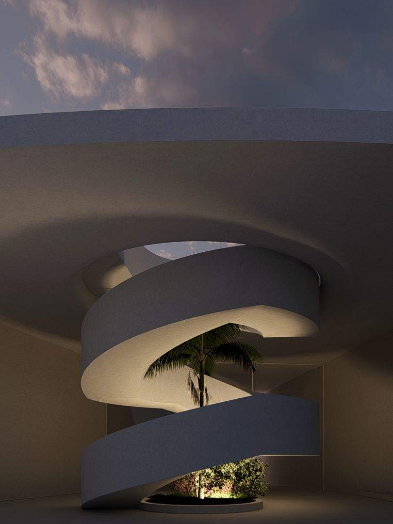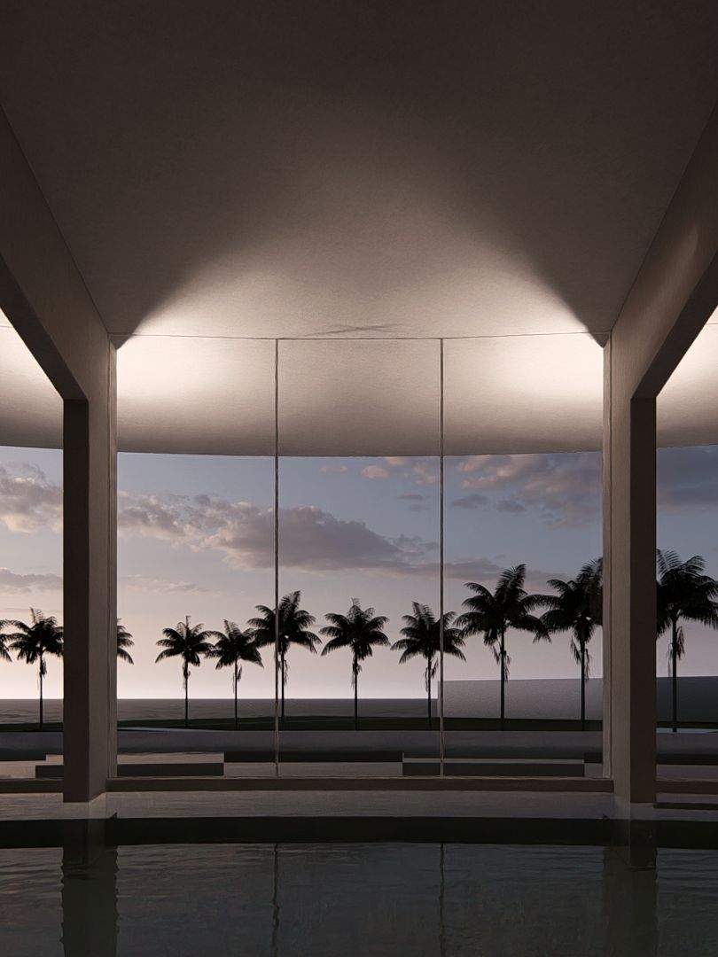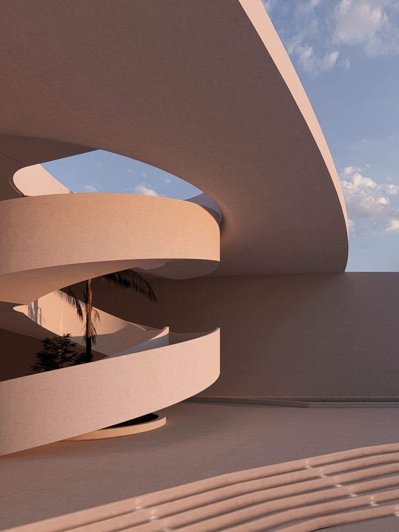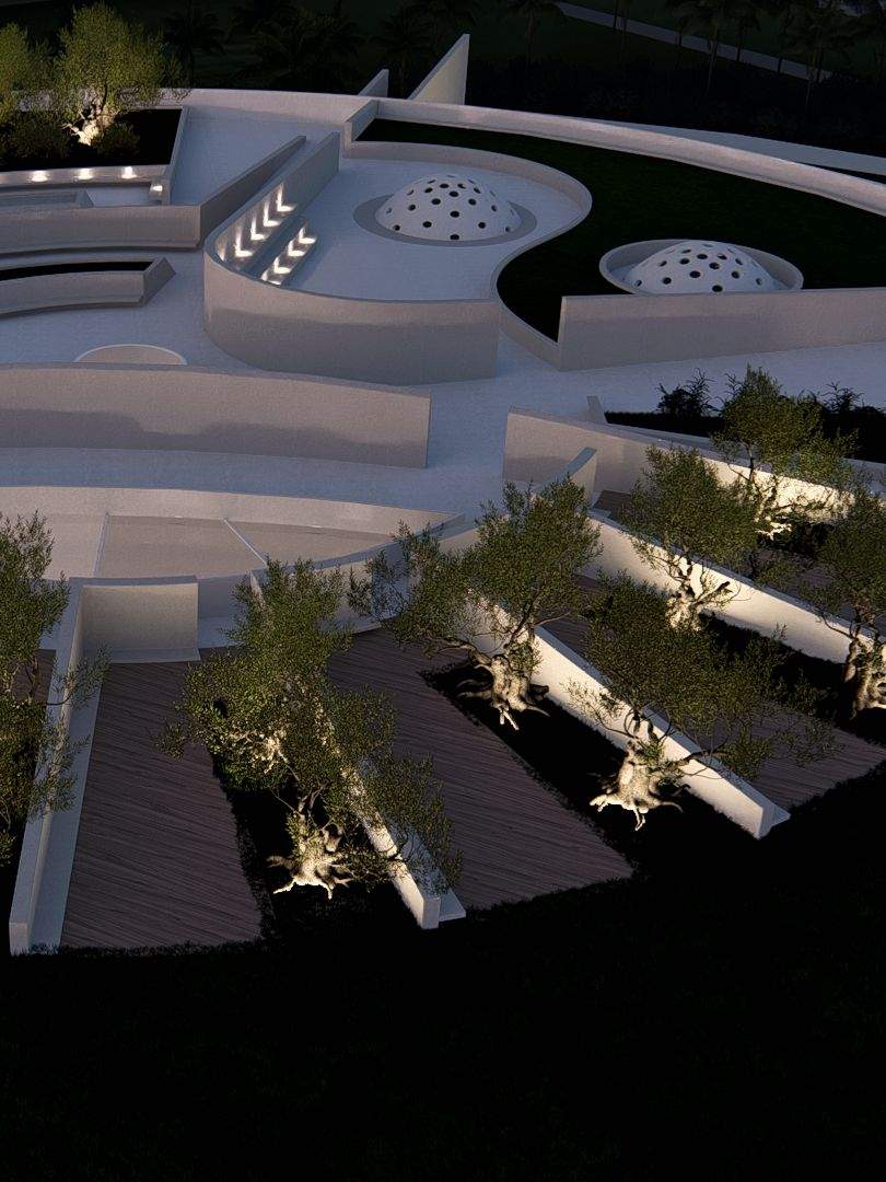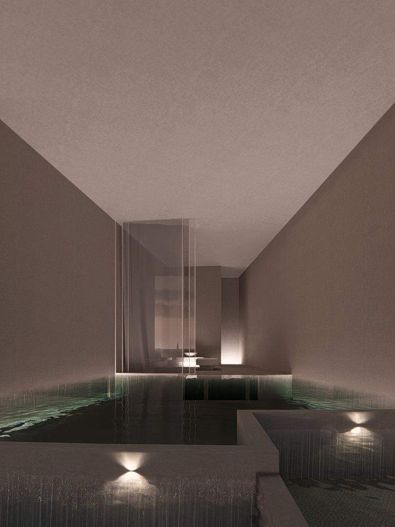 Zuha Island Spa, nestled in the heart of Zuha Island, is a harmonious blend of tradition and futurism. Surrounded by residential villas and a Back of House area to the southwest, the spa transforms its inward-facing plot into a tranquil oasis. Inspired by the island's theme of walls, the spa's design guides visitors through a series of prominent entrance walls into a central core, leading to serene spatial pockets. A dome and disk-like roof, with strategically placed skylights, diffuse natural light, creating a sacred ambiance. The spa is divided into low-energy and high-energy sections, providing acoustic and energy separation. The landscape mirrors this division, with serene water features and lush greenery in the low-energy zone, and dynamic activity fields in the high-energy zone, ensuring a balanced and immersive experience.