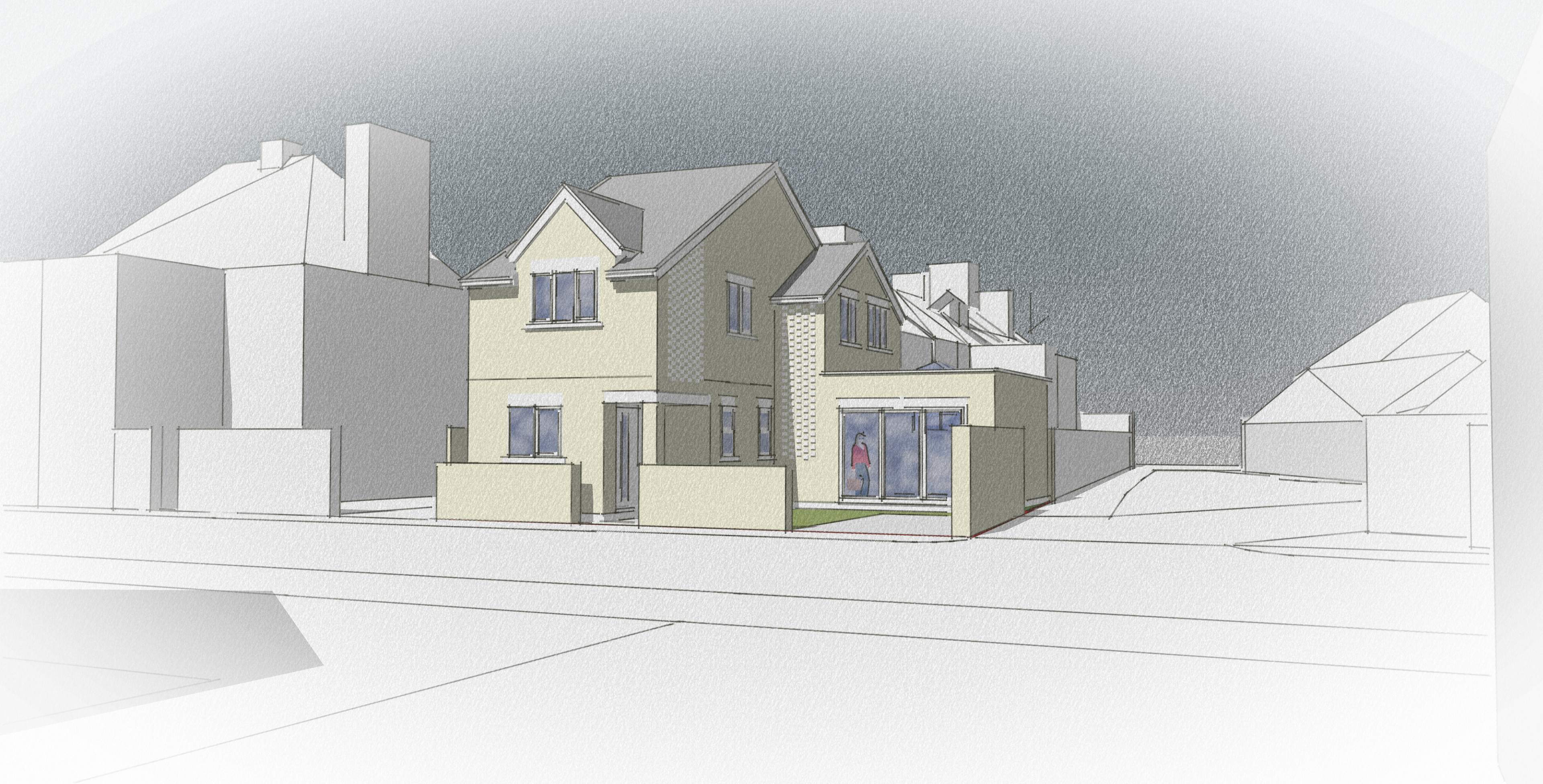 I positioned the tallest section of the house in the back left corner of the site to avoid impairing views of neighbouring properties and respect the existing corner plot to not over develop the corner fronting the main street. I also reduced the overall height to make use of the roof space to keep the mass and scale to a minimum. this was to maximise the chances of planning approval while also maximising the property value for my client.