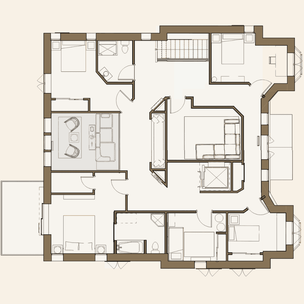 The entire plan of the house is not only centered around the fireplace at a floorplan view, but the layered symmetry continued throughout the floors of the home carry this idea throughout the space. The floors are different, but connected at their core, much like the family that will reside there.