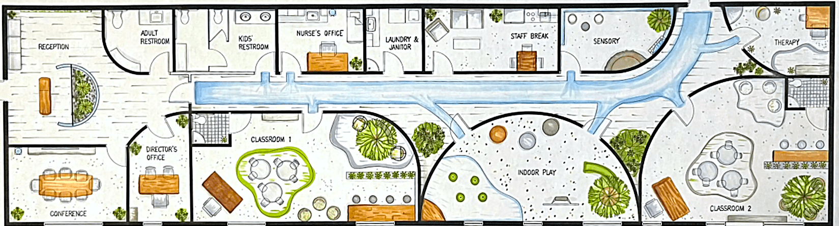 For this project, the task was to design a specialized early intervention preschool in Colorado Springs, CO, for the Mountain View Growth and Development Center (MVGDC). The preschool was tailored to children with special needs—particularly those on the autism spectrum—by creating a safe, inclusive, and sensory-friendly learning environment that integrates seamlessly with the larger school.