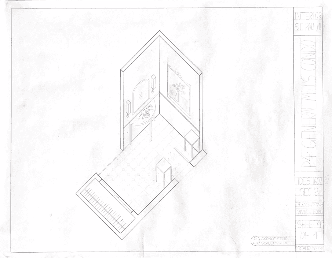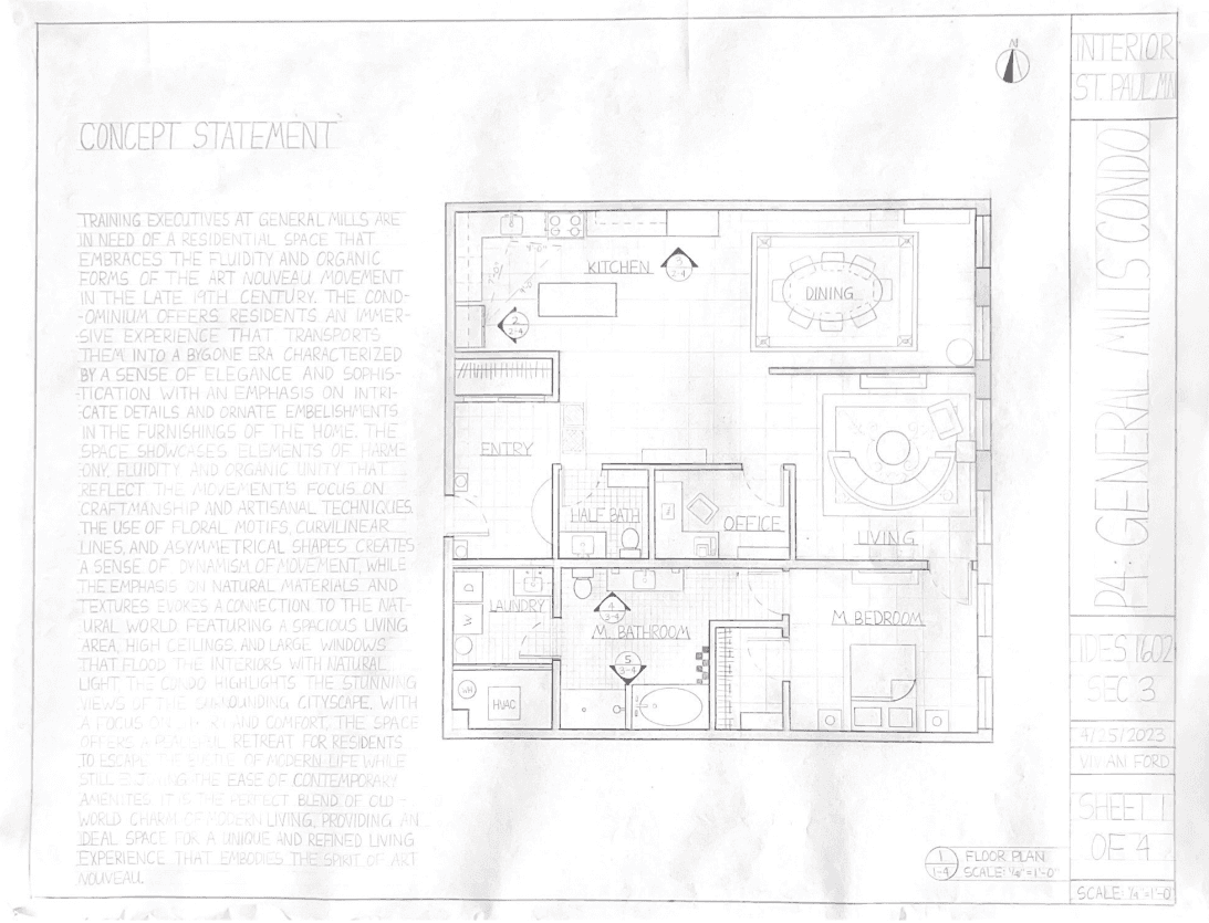 For this project, the task was to redesign part of the Old Creamette Factory in the North Loop of Minneapolis as a place for new executives of General Mills to stay during their training. The client wished for the condo to heavily reflect the nuances of the Art Nouveau era, as represented in the designs below.